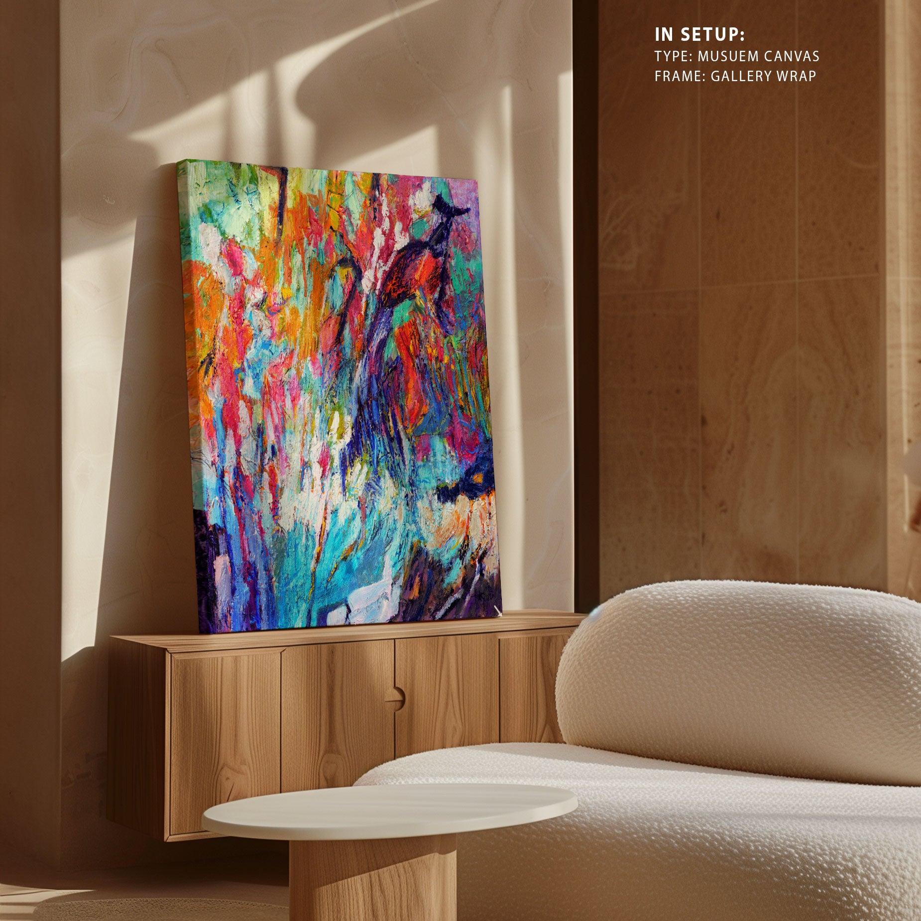 Museum Canvas Print is stretched on a wooden frame in such a way that it wraps around the sides of the stretcher. The sides of the canvas are prepared with white as natural white canvas for illustrations, pop-art and for Abstract, classical art canvas sides are stretched with the same painting as front of the canvas.