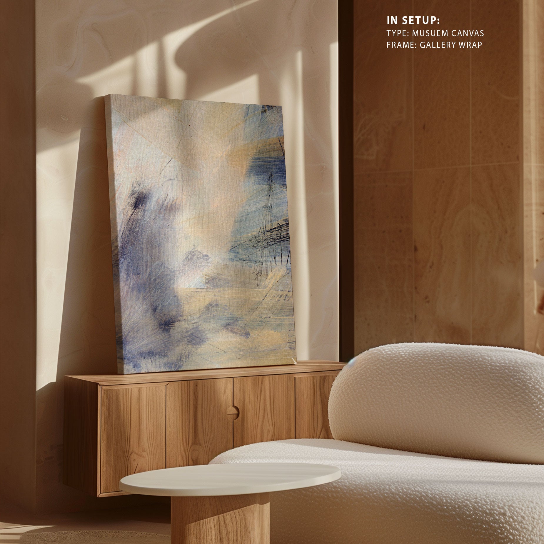 Museum Canvas Print is stretched on a wooden frame in such a way that it wraps around the sides of the stretcher. The sides of the canvas are prepared with white as natural white canvas for illustrations, pop-art and for Abstract, classical art canvas sides are stretched with the same painting as front of the canvas.