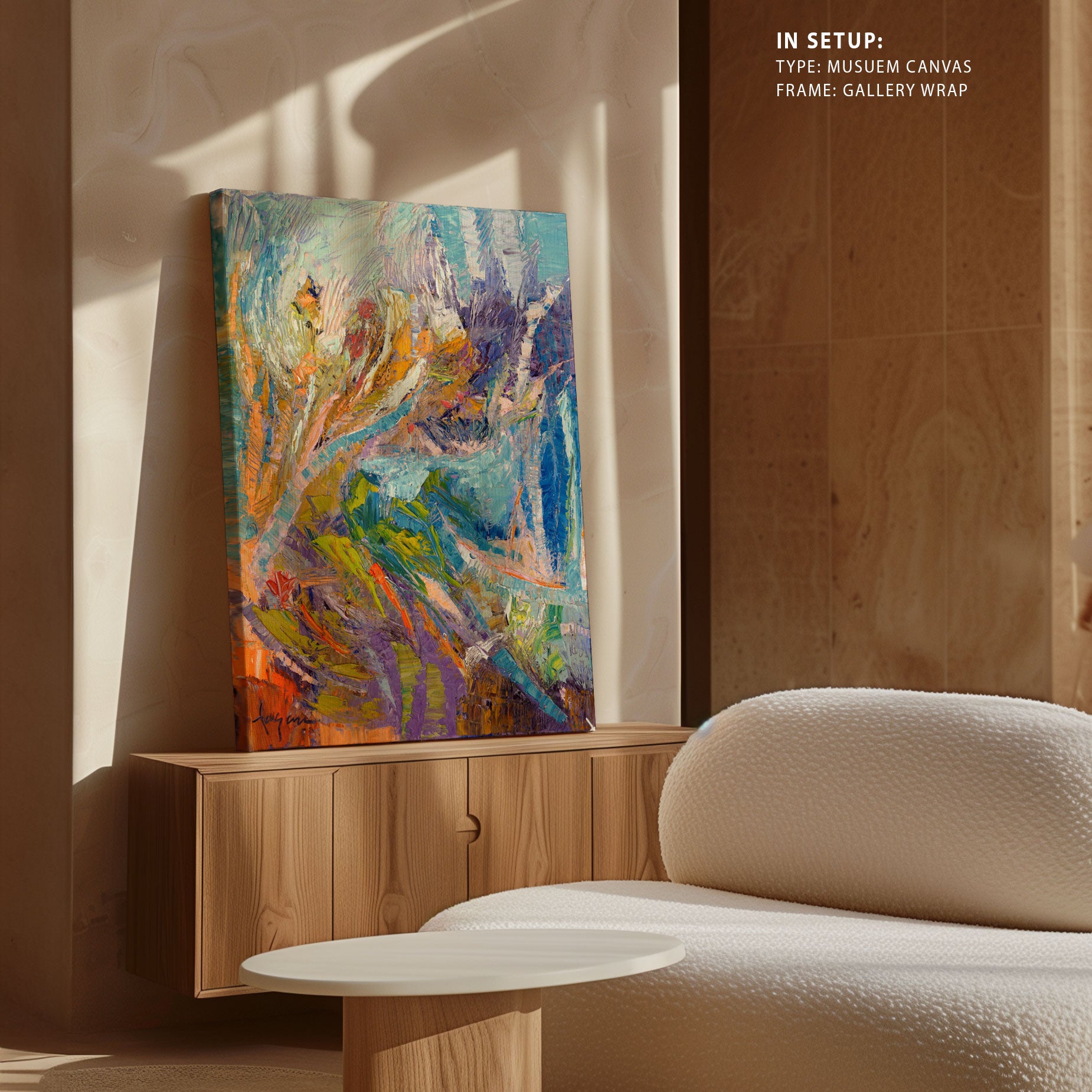 Museum Canvas Print is stretched on a wooden frame in such a way that it wraps around the sides of the stretcher. The sides of the canvas are prepared with white as natural white canvas for illustrations, pop-art and for Abstract, classical art canvas sides are stretched with the same painting as front of the canvas.