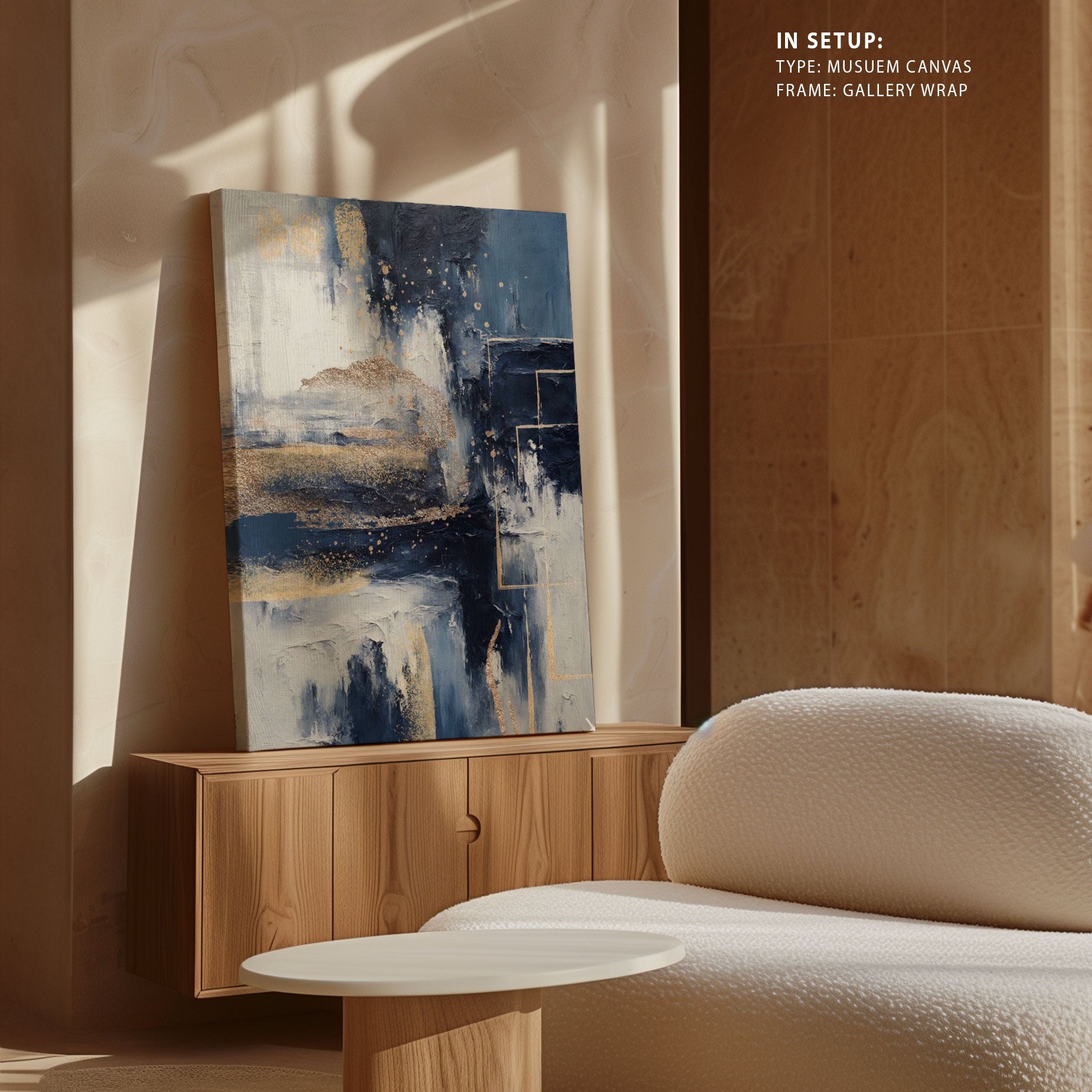 Museum Canvas Print is stretched on a wooden frame in such a way that it wraps around the sides of the stretcher. The sides of the canvas are prepared with white as natural white canvas for illustrations, pop-art and for Abstract, classical art canvas sides are stretched with the same painting as front of the canvas.