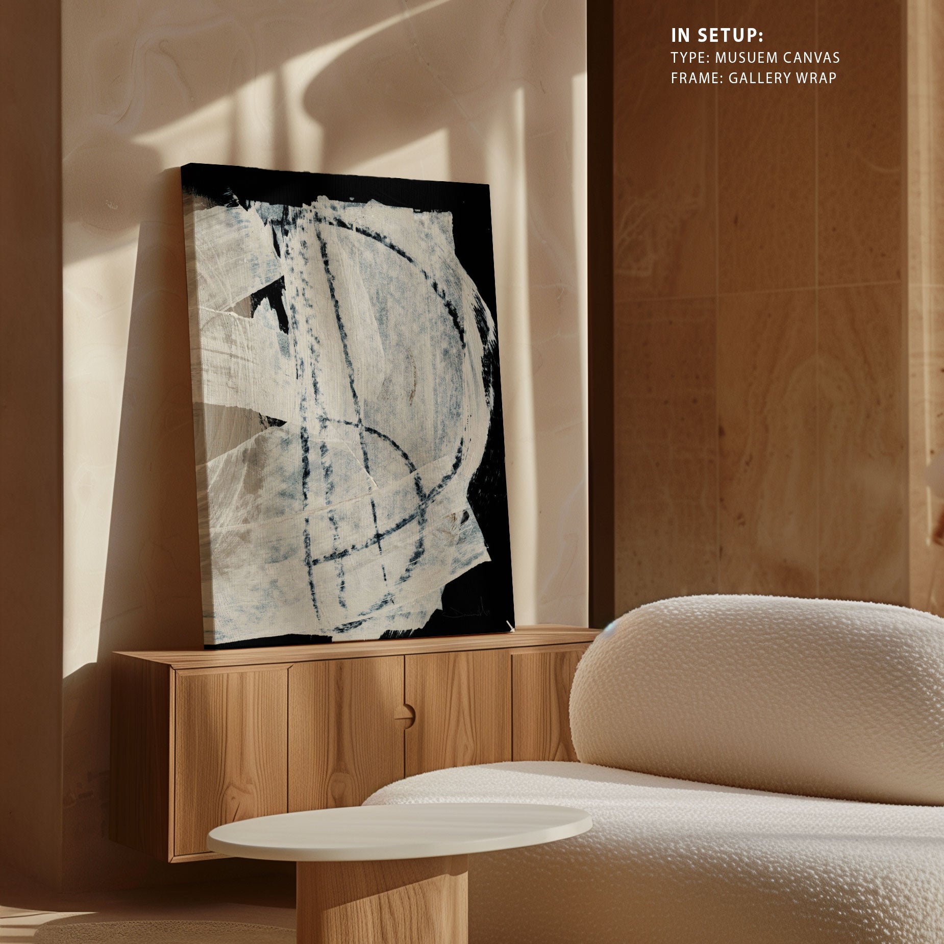 Museum Canvas Print is stretched on a wooden frame in such a way that it wraps around the sides of the stretcher. The sides of the canvas are prepared with white as natural white canvas for illustrations, pop-art and for Abstract, classical art canvas sides are stretched with the same painting as front of the canvas.