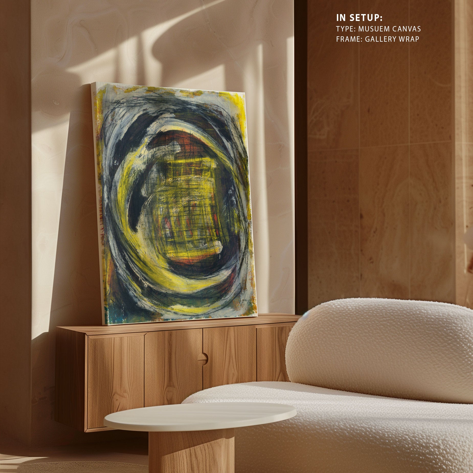 Museum Canvas Print is stretched on a wooden frame in such a way that it wraps around the sides of the stretcher. The sides of the canvas are prepared with white as natural white canvas for illustrations, pop-art and for Abstract, classical art canvas sides are stretched with the same painting as front of the canvas.