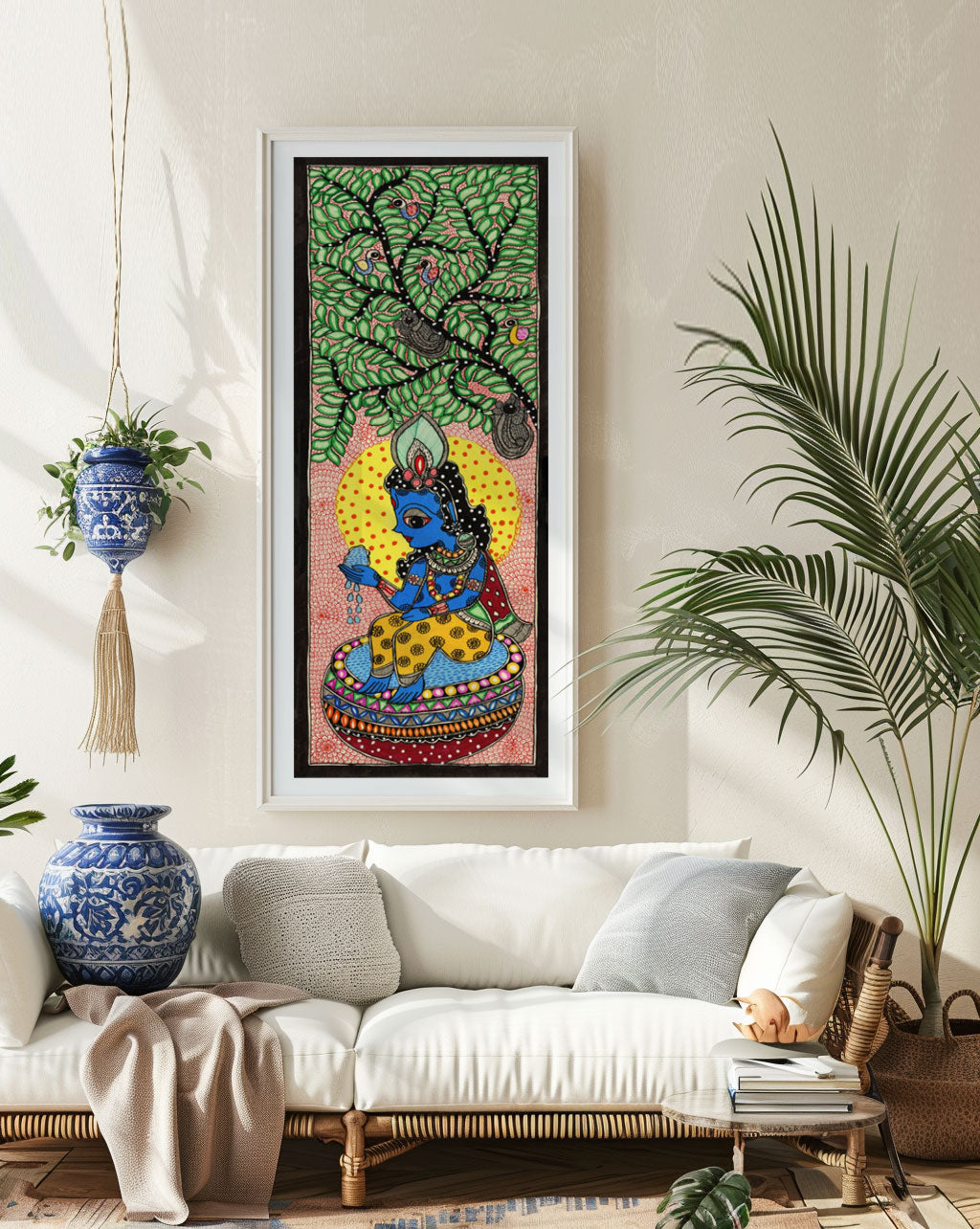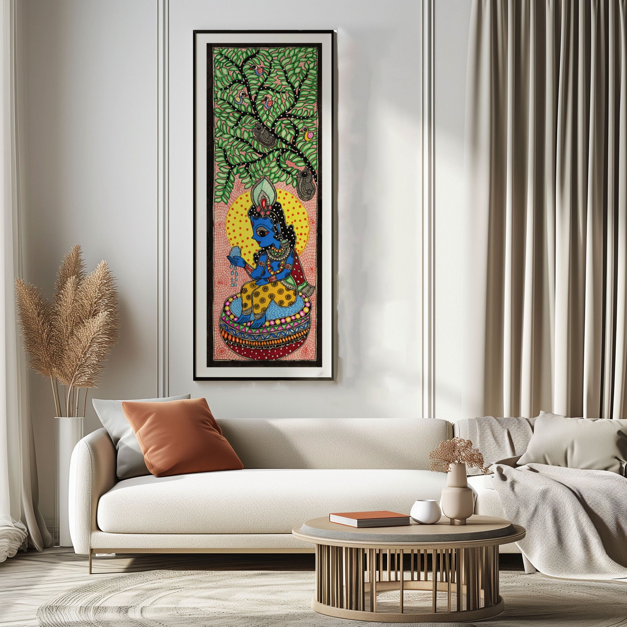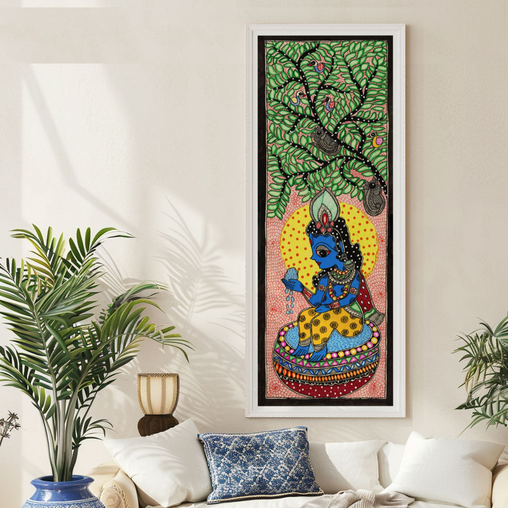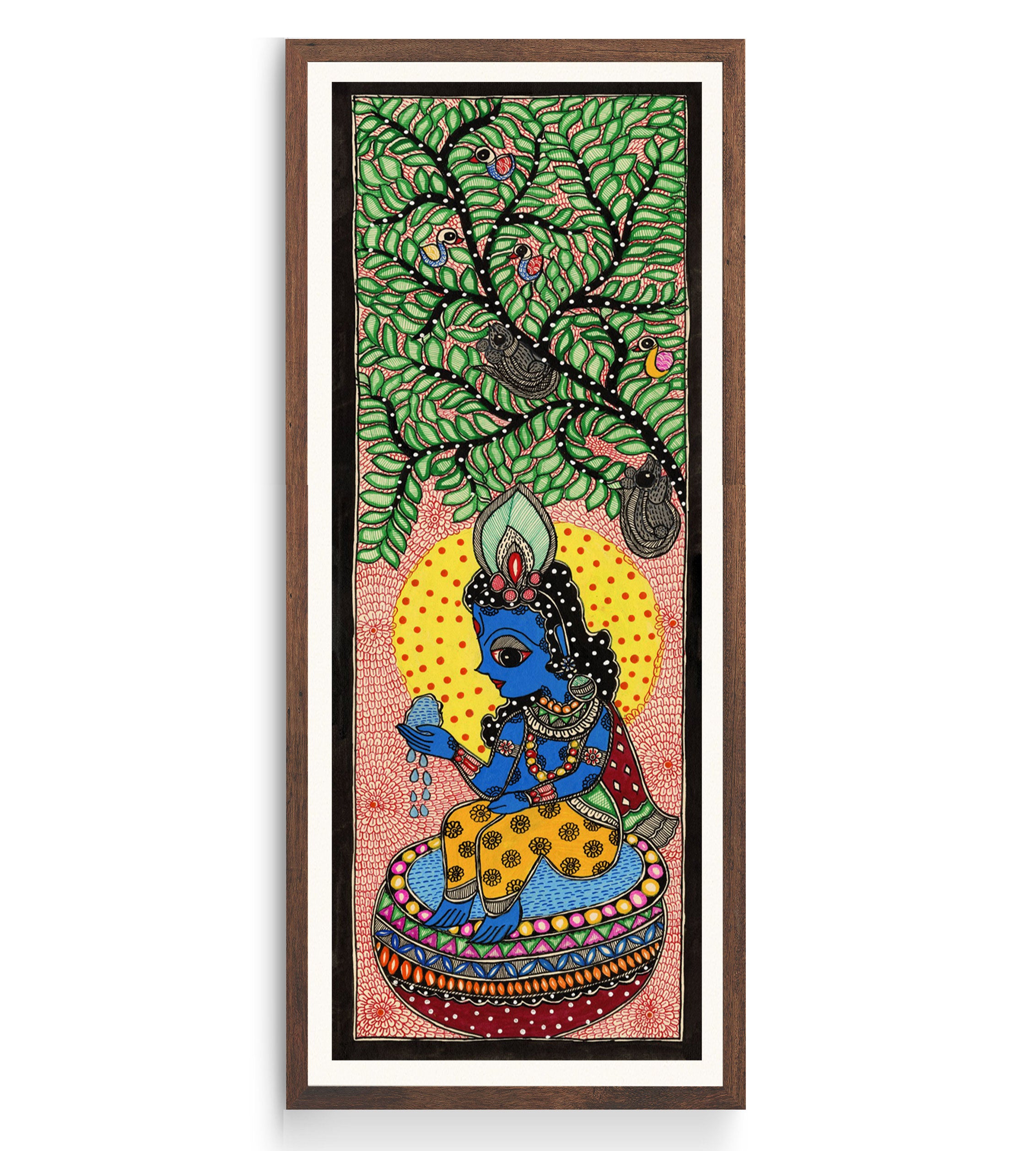 Beautiful Krishna Madhubani Art from the Madhubani Paintings Collection is produced on Premium Museum Grade Canvas and Hahnemuhle Fine Art Media. This beautiful Madhubani Painting Art Print product is made with a matte finish and premium quality with vibrant colors. These Madhubani Miniature Paintings Art Prints are produced with the most extreme shading precision and using the most advanced giclee printing technique in the world. We use the same standard that the various museums and art galleries use across the globe to recreate the Madhubani Miniature Paintings Art Prints. These Madhubani Paintings are perfect for you if you're a Madhubani or Indian Culture Lover or if you want to add a Traditional Look to your space. The vibrancy of colors and the unique detailing of every Madhubani Painting Art Print makes them the best in so many ways. This Madhubani Art Print will add charm to any room in your home. These Madhubani Painting Art Prints can be the perfect gift to your friends, colleagues, or family as they sync in very well in your Bedroom, living room, lobby, Balcony, Bathroom, etc.