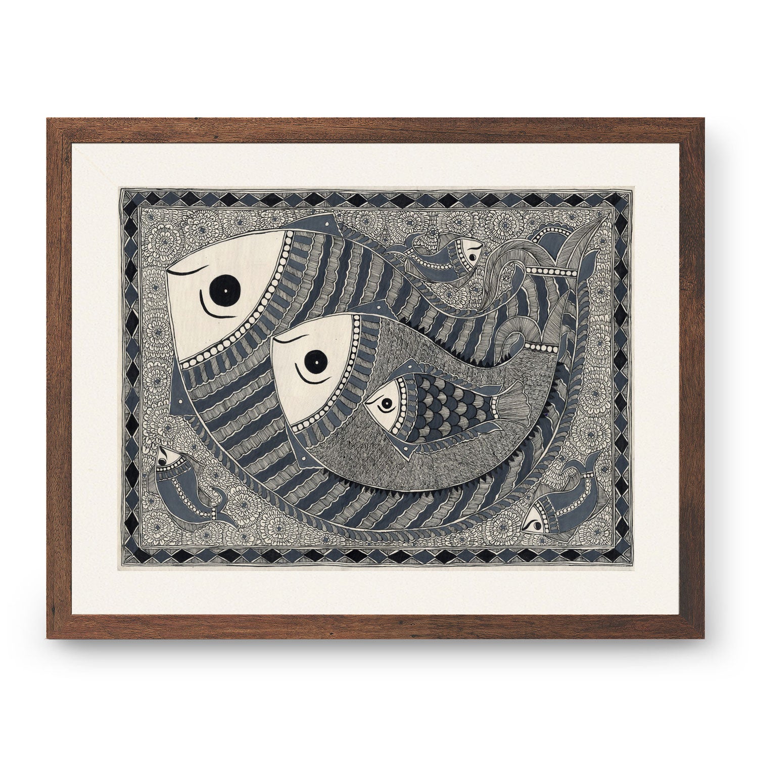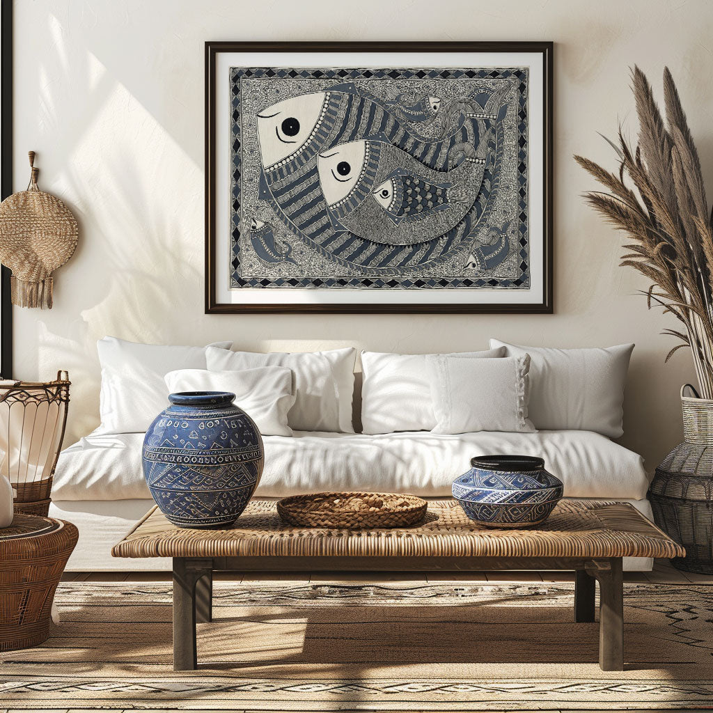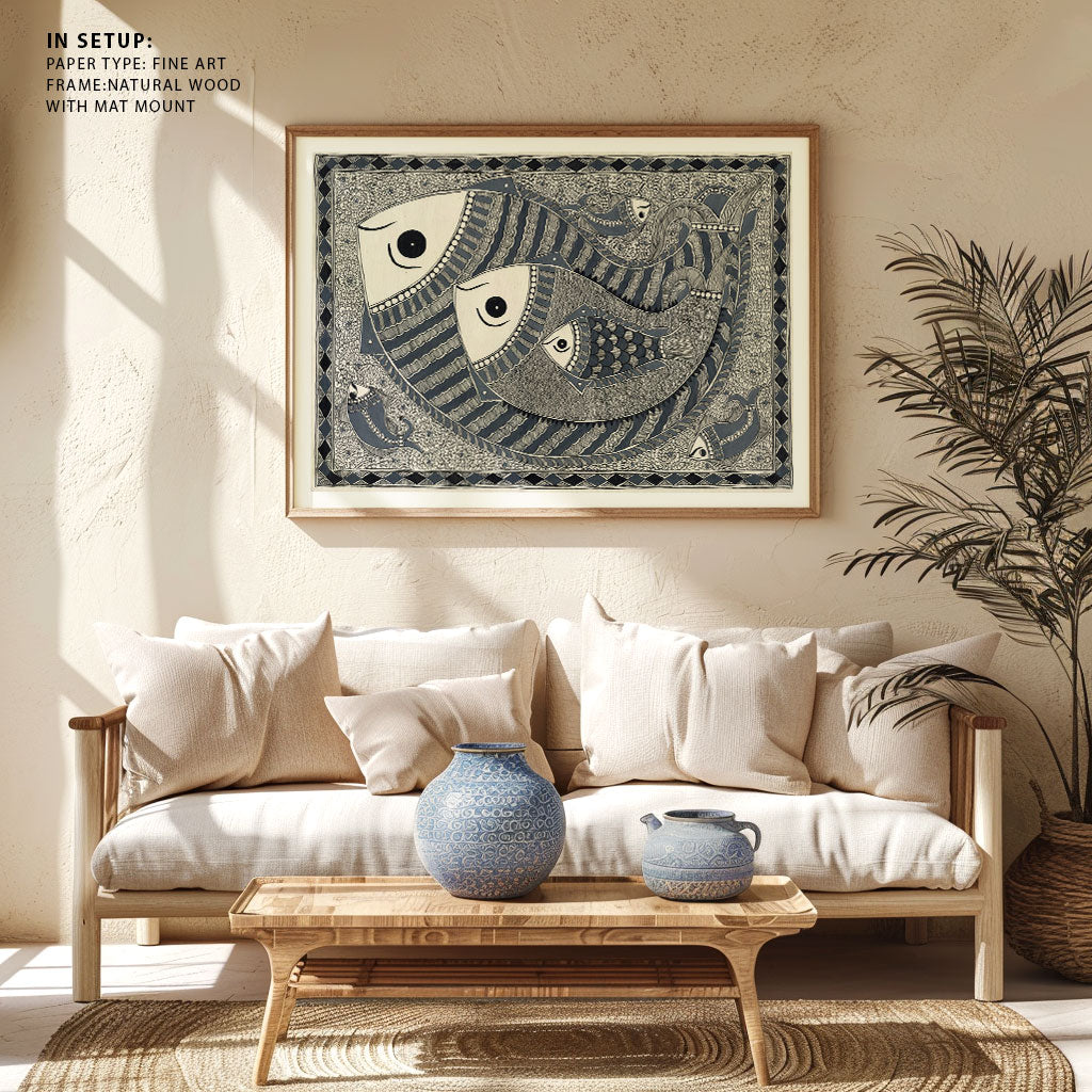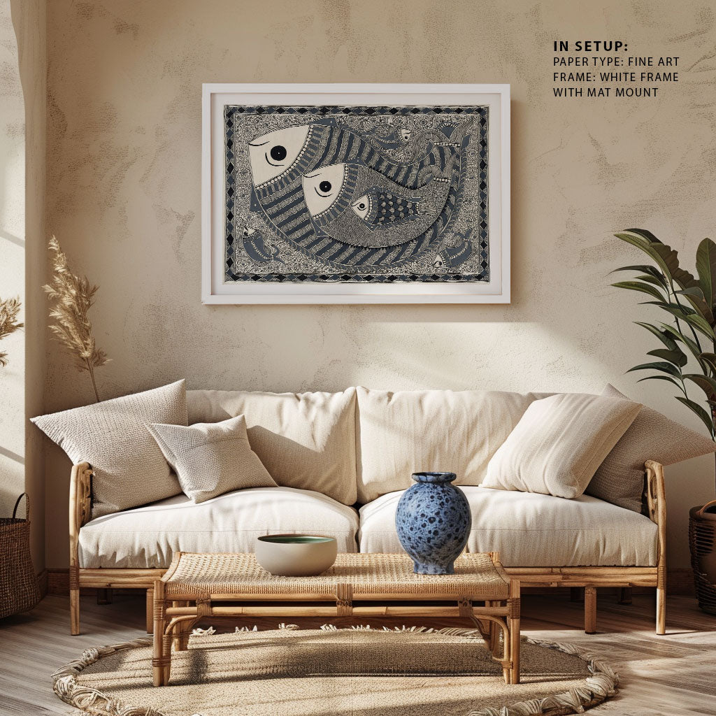 Madhubani Fish Painting Beautiful Tradition Art from the Madhubani Paintings Collection is produced on Premium Museum Grade Canvas and Hahnemuhle Fine Art Media. This beautiful Madhubani Painting Art Print product is made with a matte finish and premium quality with vibrant colors. These Madhubani Miniature Paintings Art Prints are produced with the most extreme shading precision and using the most advanced giclee printing technique in the world. We use the same standard that the various museums and art galleries use across the globe to recreate the Madhubani Miniature Paintings Art Prints. These Madhubani Paintings are perfect for you if you're a Madhubani or Indian Culture Lover or if you want to add a Traditional Look to your space. The vibrancy of colors and the unique detailing of every Madhubani Painting Art Print makes them the best in so many ways. This Madhubani Art Print will add charm to any room in your home. These Madhubani Painting Art Prints can be the perfect gift to your friends, colleagues, or family as they sync in very well in your Bedroom, living room, lobby, Balcony, Bathroom, etc.
