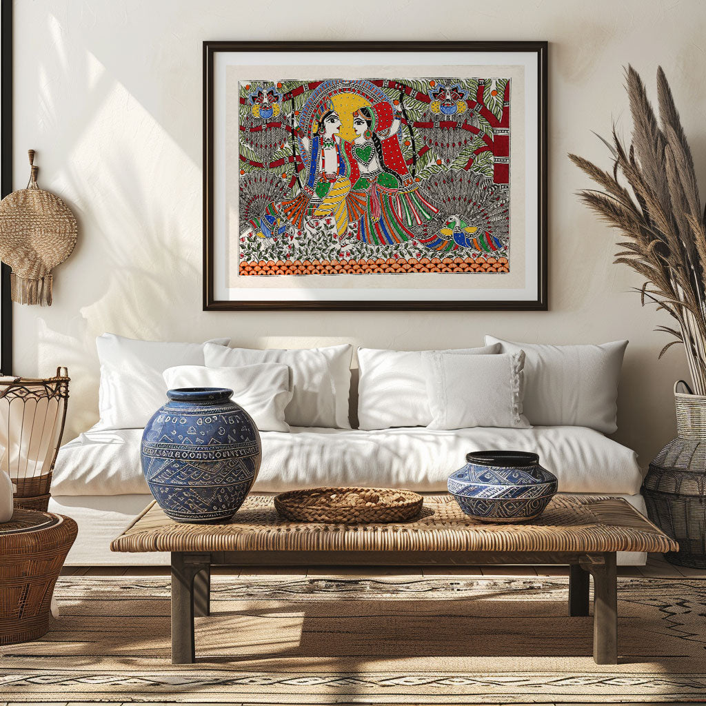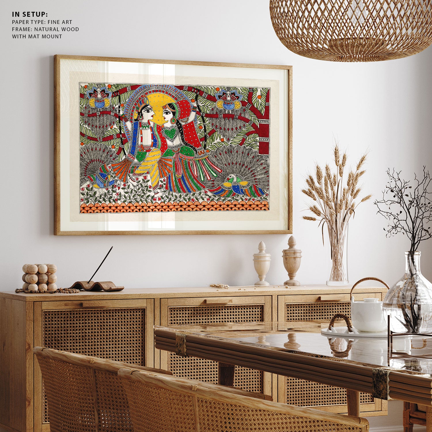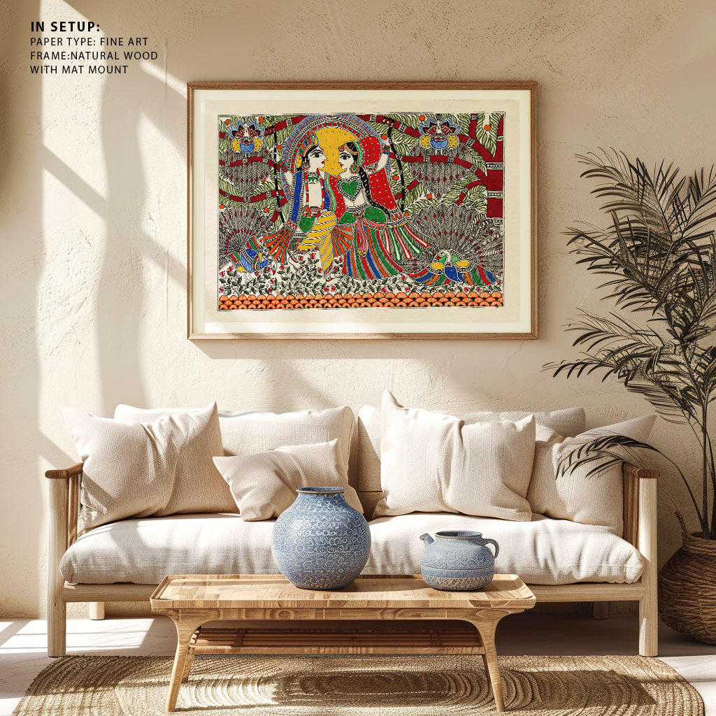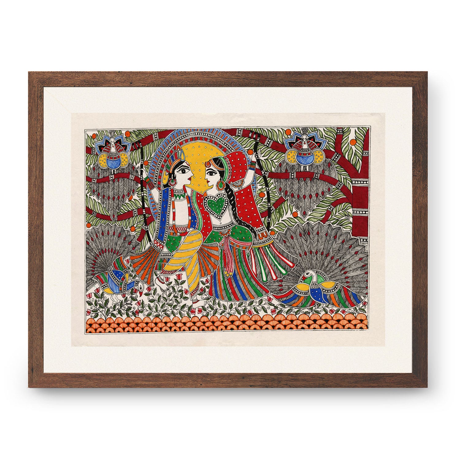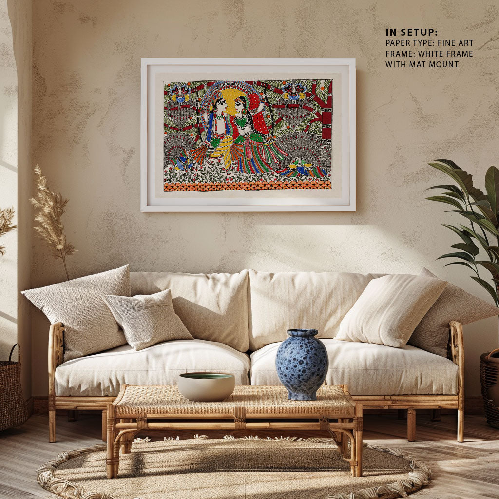 Madhubani Radha Krishna Swing Art from the Madhubani Paintings Collection is produced on Premium Museum Grade Canvas and Hahnemuhle Fine Art Media. This beautiful Madhubani Painting Art Print product is made with a matte finish and premium quality with vibrant colors. These Madhubani Miniature Paintings Art Prints are produced with the most extreme shading precision and using the most advanced giclee printing technique in the world. We use the same standard that the various museums and art galleries use across the globe to recreate the Madhubani Miniature Paintings Art Prints. These Madhubani Paintings are perfect for you if you're a Madhubani or Indian Culture Lover or if you want to add a Traditional Look to your space. The vibrancy of colors and the unique detailing of every Madhubani Painting Art Print makes them the best in so many ways. This Madhubani Art Print will add charm to any room in your home. These Madhubani Painting Art Prints can be the perfect gift to your friends, colleagues, or family as they sync in very well in your Bedroom, living room, lobby, Balcony, Bathroom, etc.
