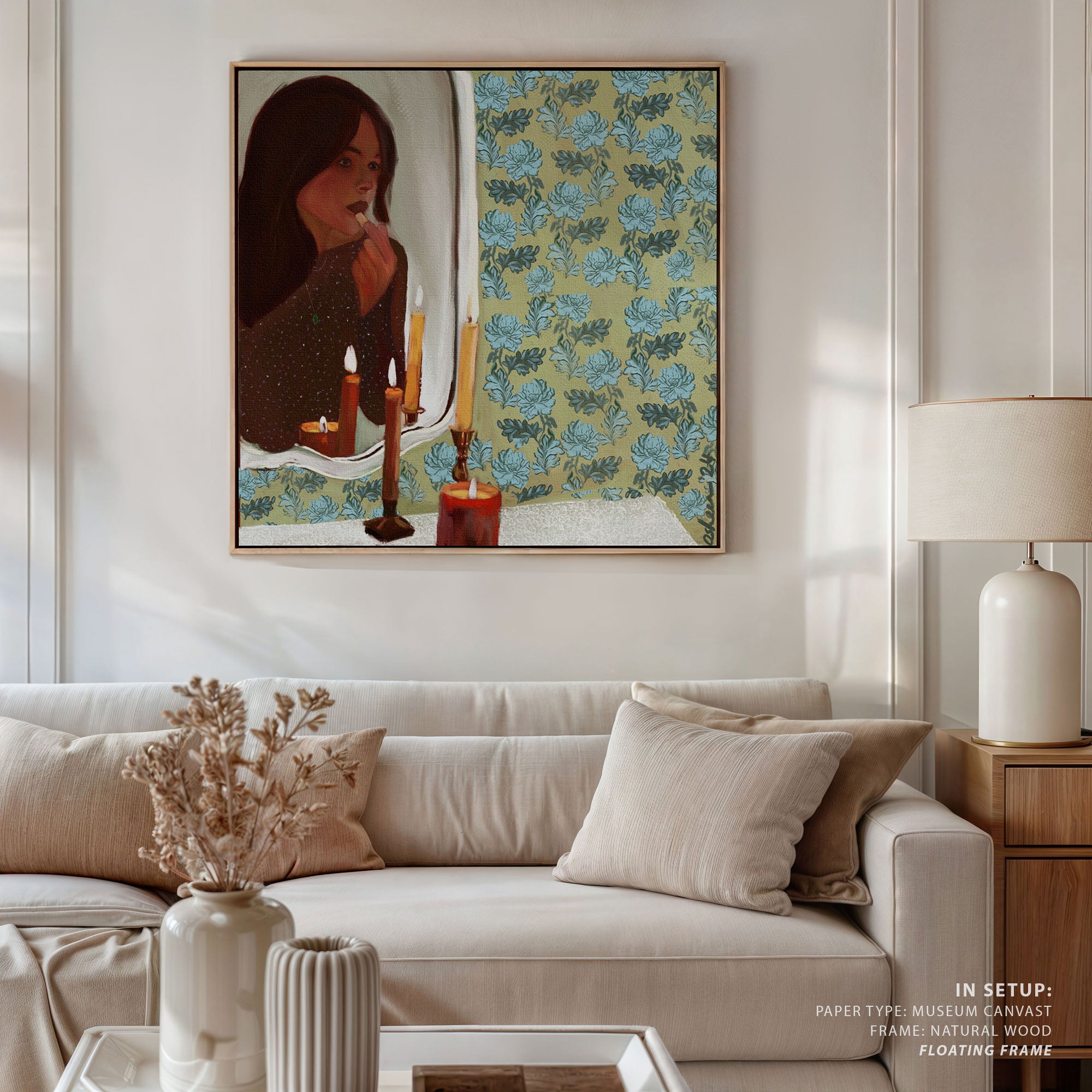 Museum Canvas Print is stretched on a wooden frame in such a way that it wraps around the sides of the stretcher. The sides of the canvas are prepared with white as natural white canvas for illustrations, pop-art and for minimalist, classical art canvas sides are stretched with the same painting as front of the canvas.