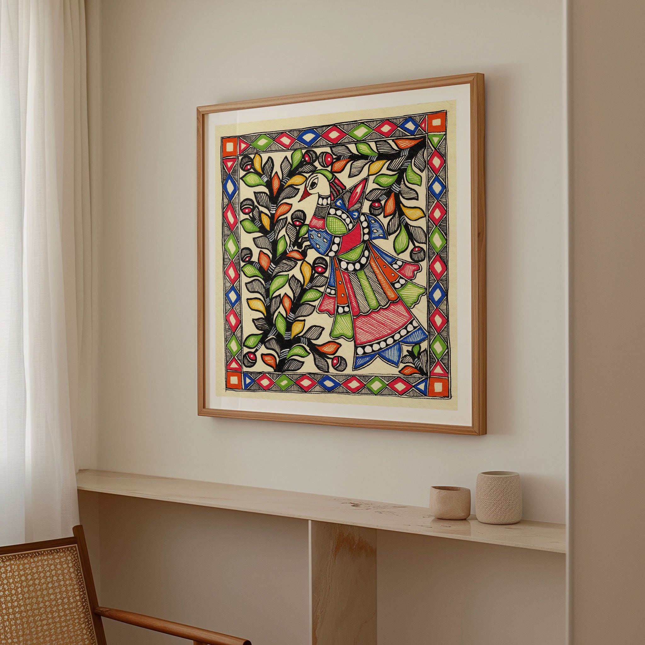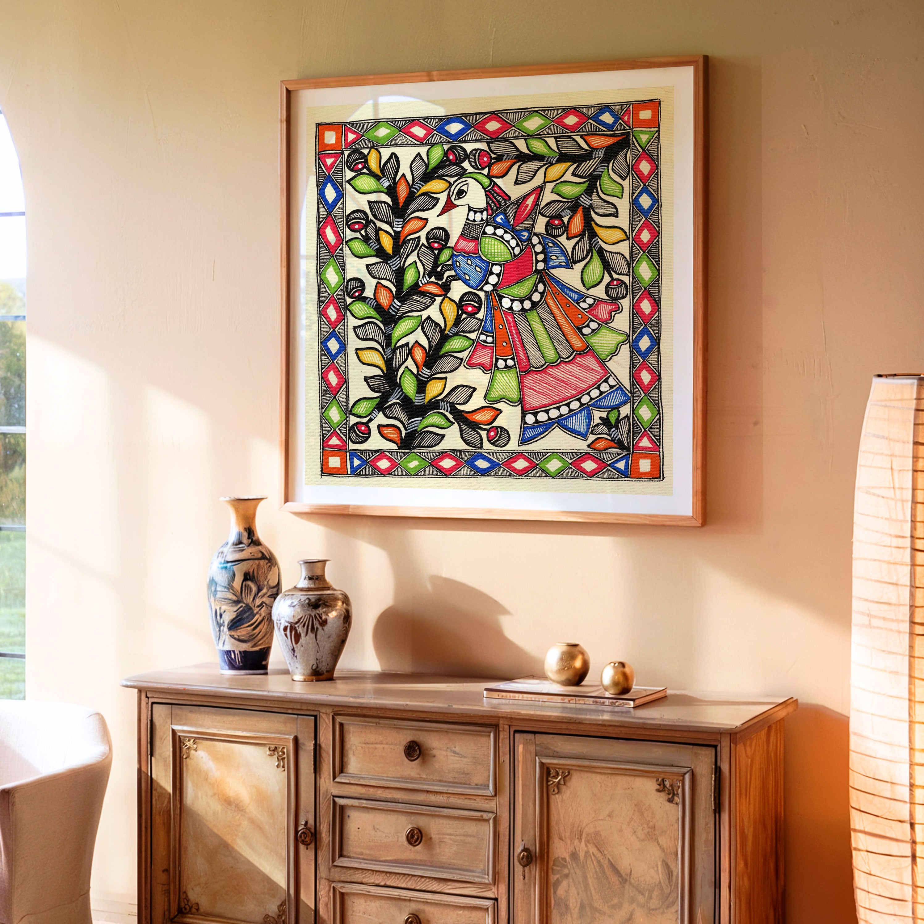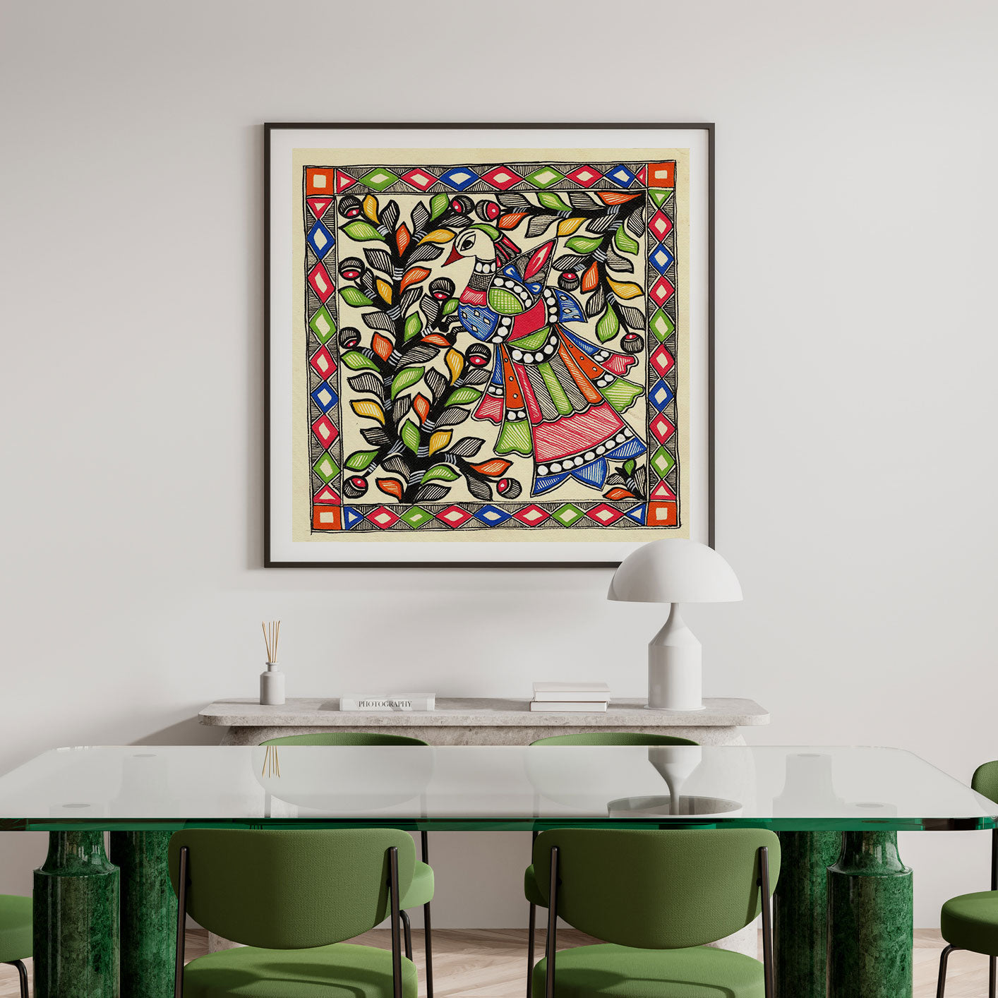 Peacock Madhubani Art from the Madhubani Paintings Collection is produced on Premium Museum Grade Canvas and Hahnemuhle Fine Art Media. This beautiful Madhubani Painting Art Print product is made with a matte finish and premium quality with vibrant colors. These Madhubani Miniature Paintings Art Prints are produced with the most extreme shading precision and using the most advanced giclee printing technique in the world. We use the same standard that the various museums and art galleries use across the globe to recreate the Madhubani Miniature Paintings Art Prints. These Madhubani Paintings are perfect for you if you're a Madhubani or Indian Culture Lover or if you want to add a Traditional Look to your space. The vibrancy of colors and the unique detailing of every Madhubani Painting Art Print makes them the best in so many ways. This Madhubani Art Print will add charm to any room in your home. These Madhubani Painting Art Prints can be the perfect gift to your friends, colleagues, or family as they sync in very well in your Bedroom, living room, lobby, Balcony, Bathroom, etc.