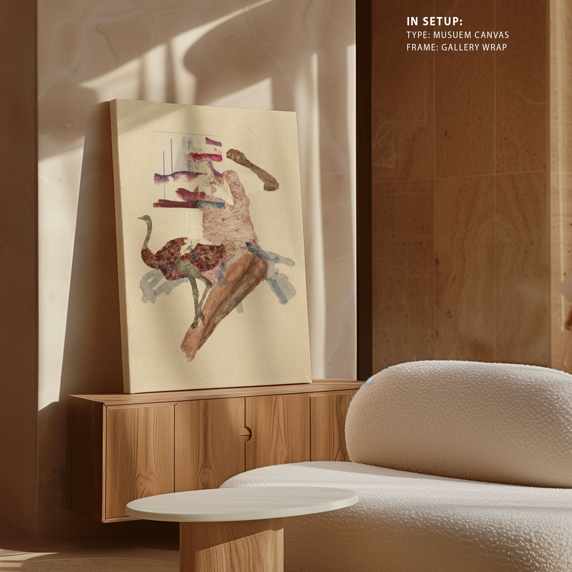 Museum Canvas Print is stretched on a wooden frame in such a way that it wraps around the sides of the stretcher. The sides of the canvas are prepared with white as natural white canvas for illustrations, pop-art and for Abstract, classical art canvas sides are stretched with the same painting as front of the canvas.