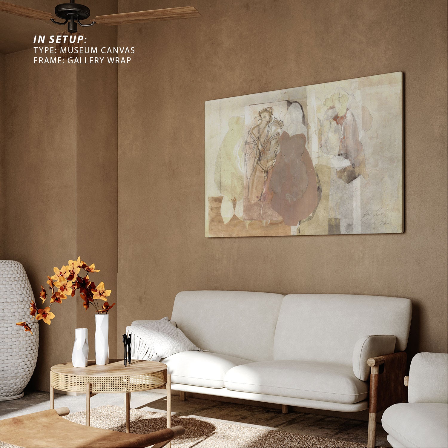 Museum Canvas Print is stretched on a wooden frame in such a way that it wraps around the sides of the stretcher. The sides of the canvas are prepared with white as natural white canvas for illustrations, pop-art and for Abstract Art, classical art canvas sides are stretched with the same painting as front of the canvas.