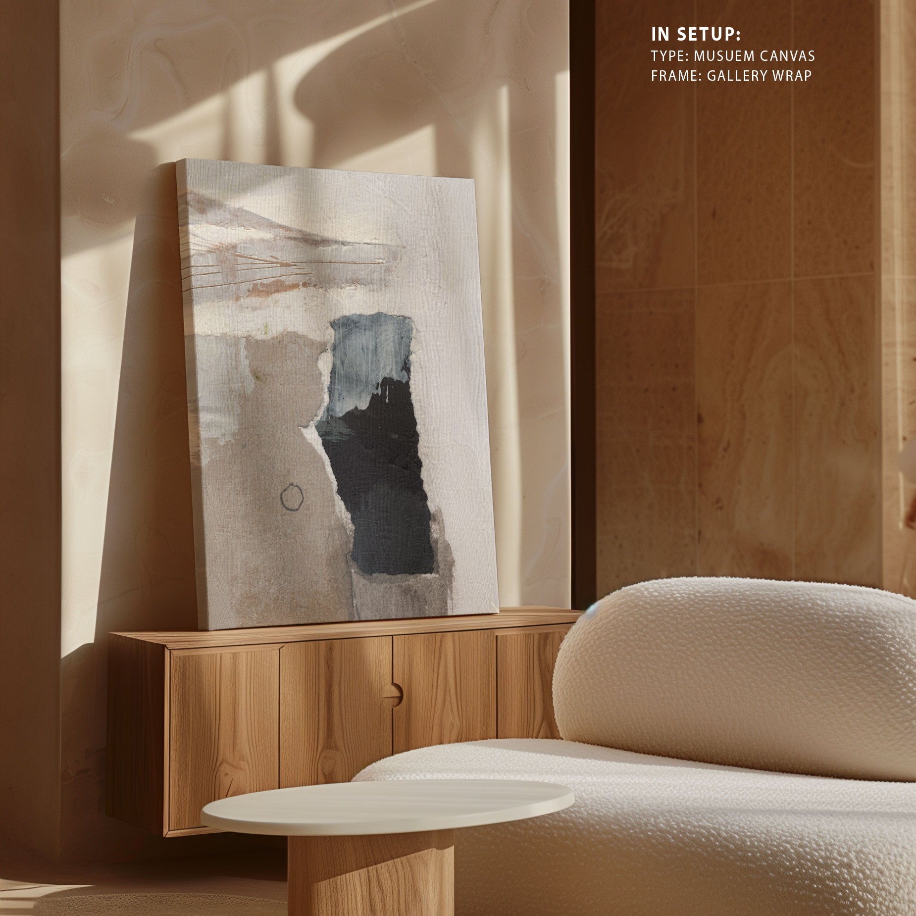 Museum Canvas Print is stretched on a wooden frame in such a way that it wraps around the sides of the stretcher. The sides of the canvas are prepared with white as natural white canvas for illustrations, pop-art and for Abstract, classical art canvas sides are stretched with the same painting as the front of the canvas.