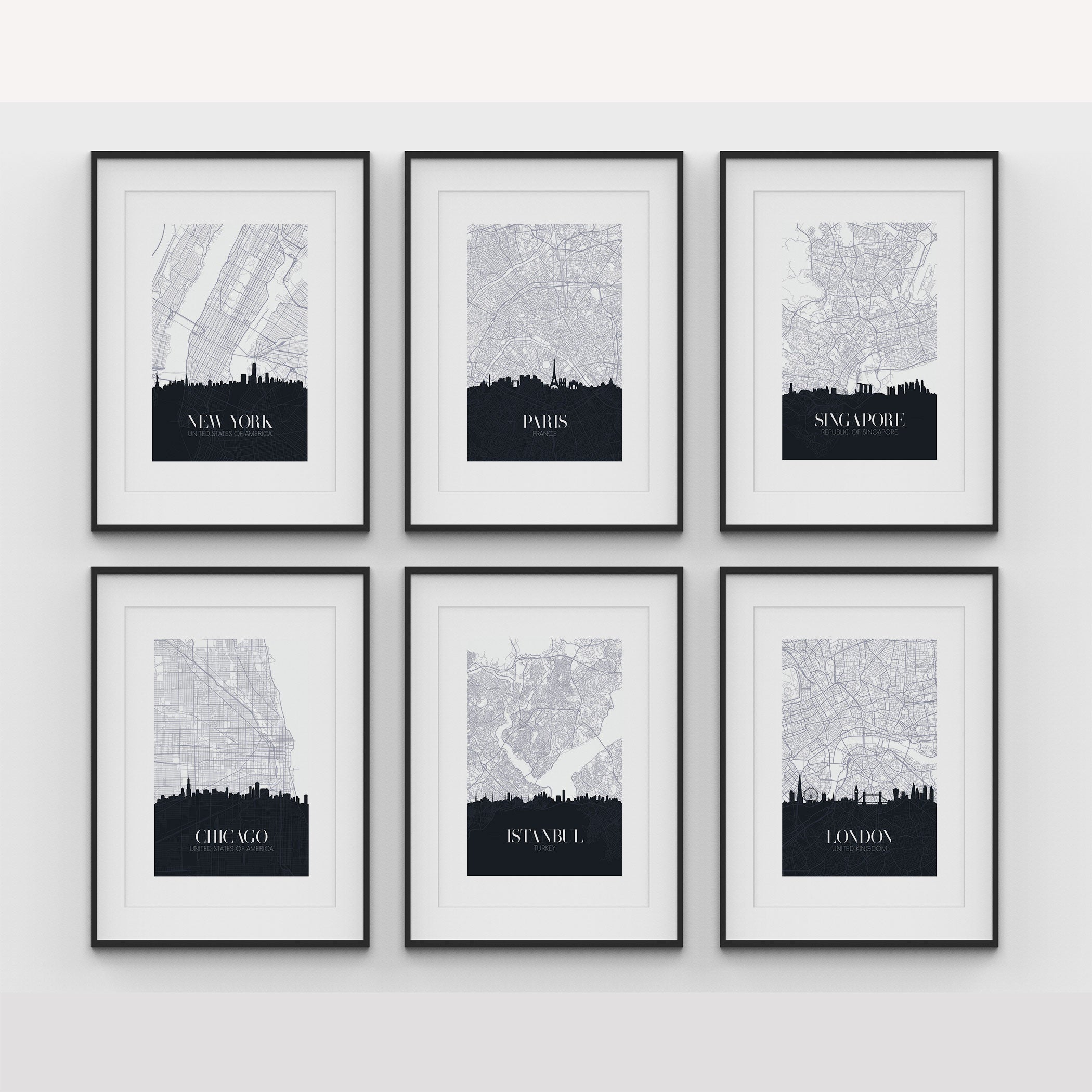 City Street Map Art Set of 6, Skyline Maps of Cities Painting.