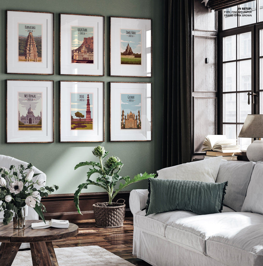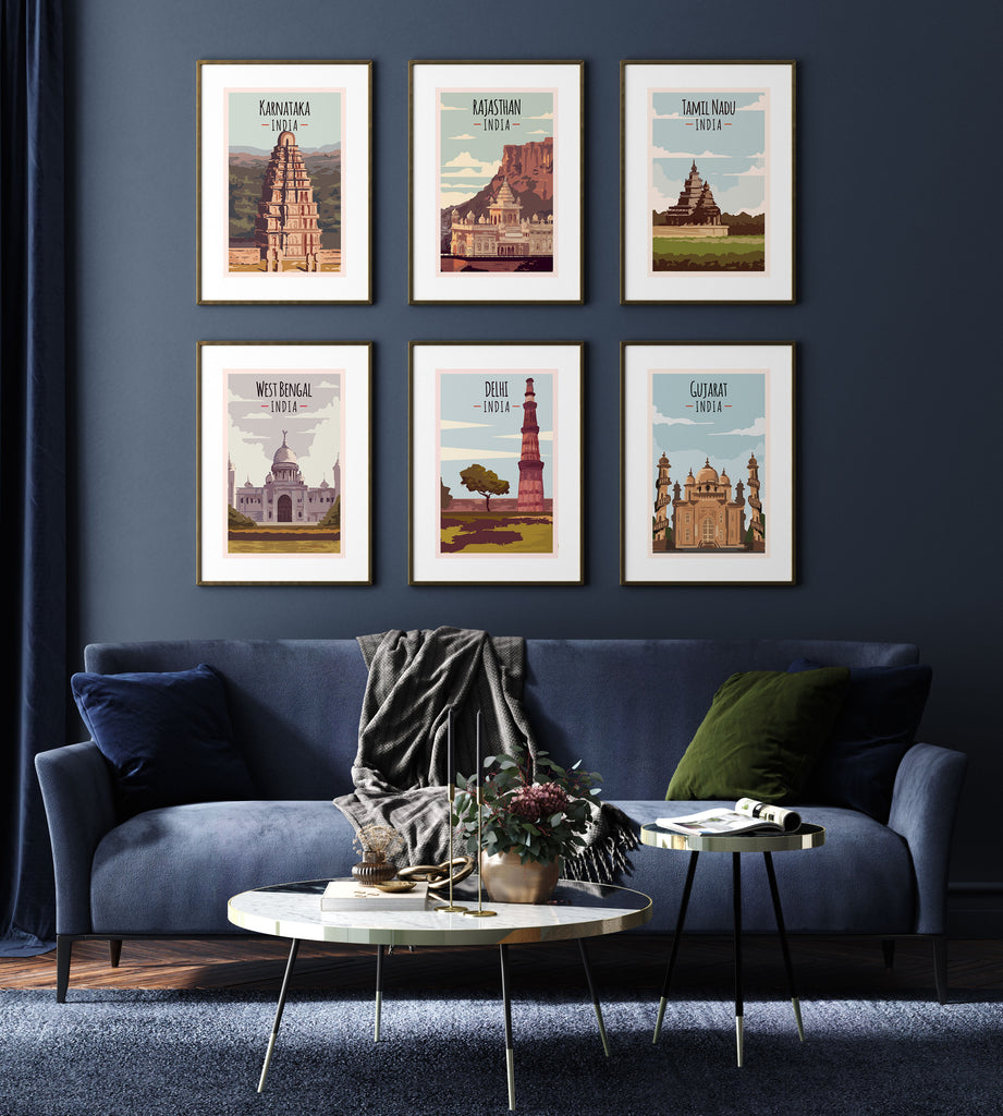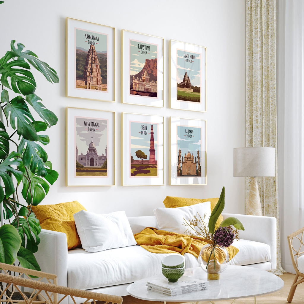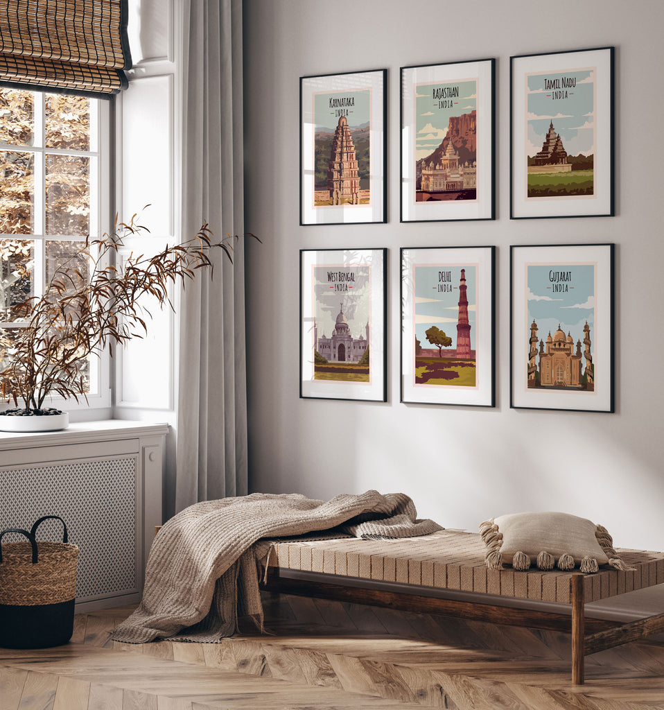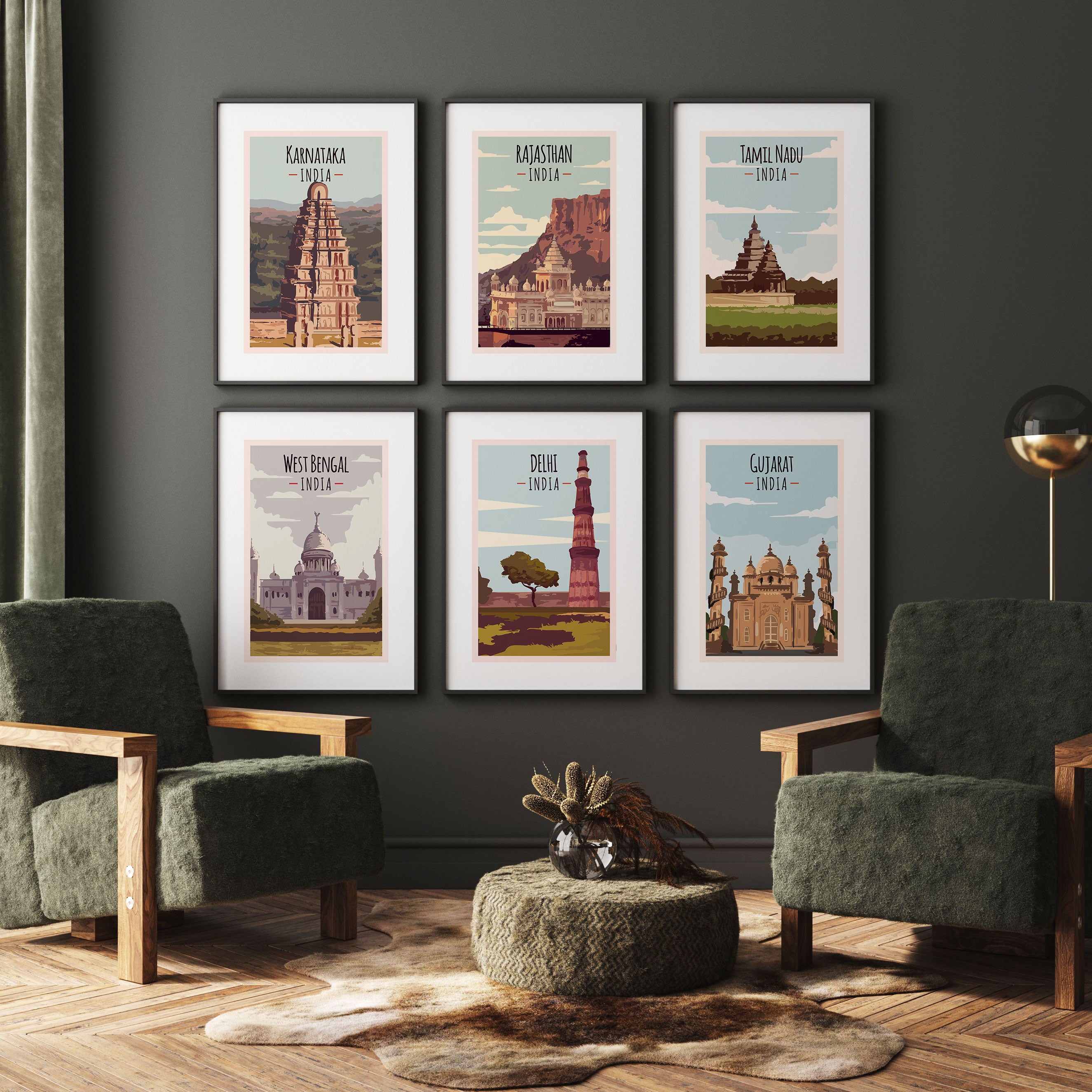 Historical Monuments Art Set of 6, Retro India Poster Painting. from Gallery Wall & Art Sets Collection is produced on Premium Museum Grade Canvas and Hahnemuhle Fine Art Media. This beautiful Gallery Wall art is made with matte finish and premium quality with vibrant colors. These Gallery Wall Art Sets are produced with the most extreme shading precision and using the most advanced giclee printing technique in the world. We use the same standard that the various museums and art galleries use across the globe to recreate the art sets. These Modern Style Gallery Wall Art Sets are perfect for you if you're an Art Lover or if you want to add a Modern Look to your home. The vibrancy of colors and the unique detailing of every artwork makes them the best in so many ways. This Gallery Wall Painting set will add charm to any room in your home. This art set can be the perfect gift to your friends, colleagues or family as they sync in very well in your Bedroom, living room, lobby, Balcony, Bathroom etc.