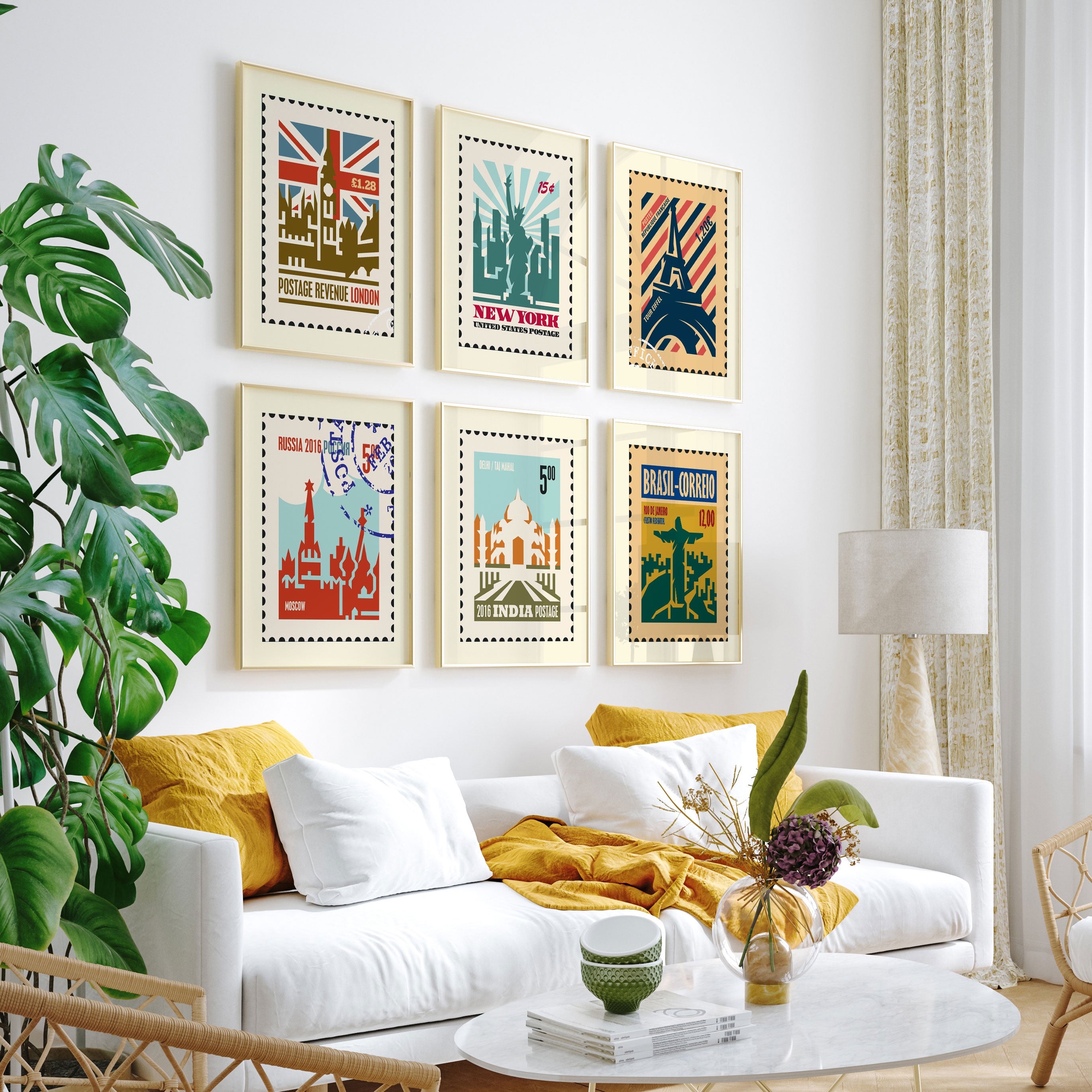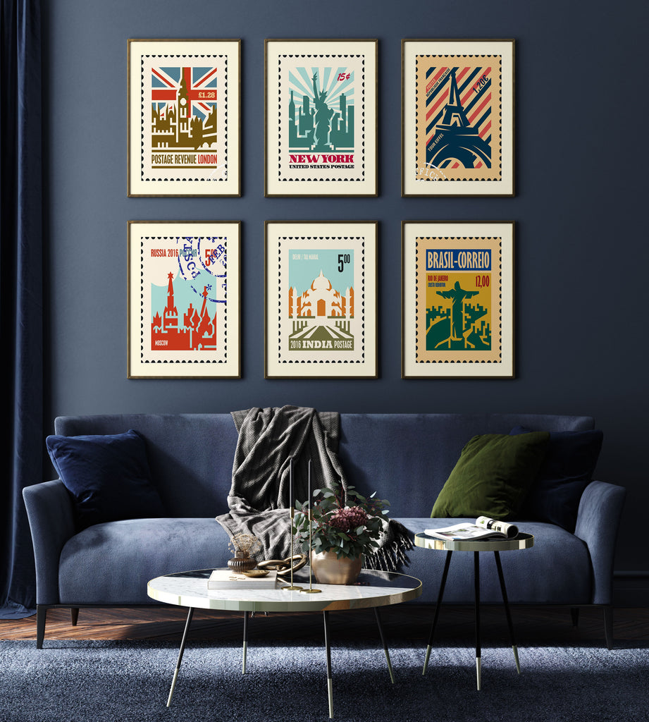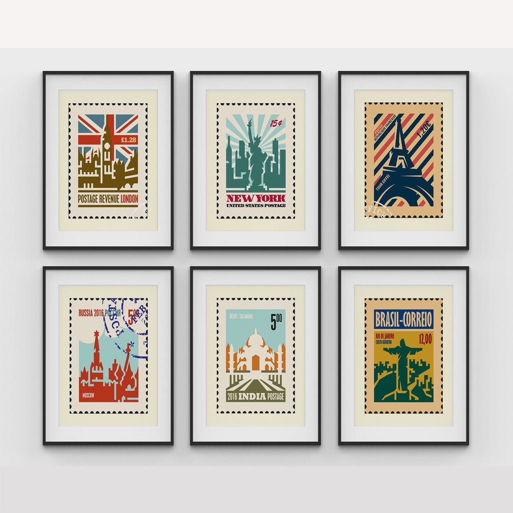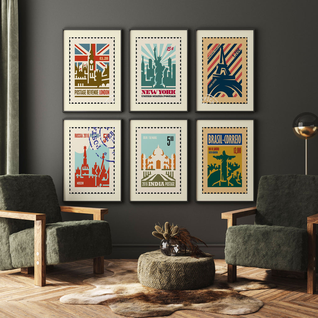 Travel Stamp Art Set of 6, Stamp Travel Posters Painting.