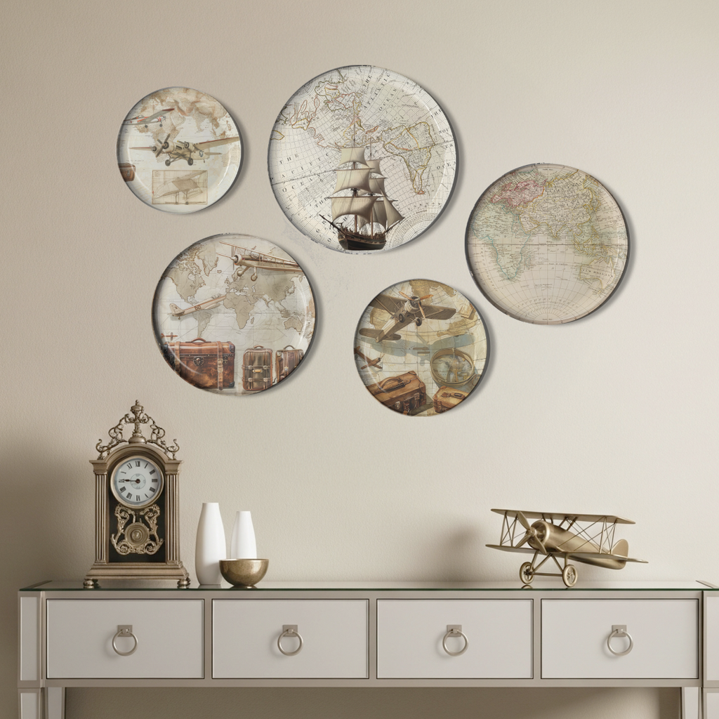 Vintage Antique Travel Wall Decor Plate, Set of 5, Art Plate Set