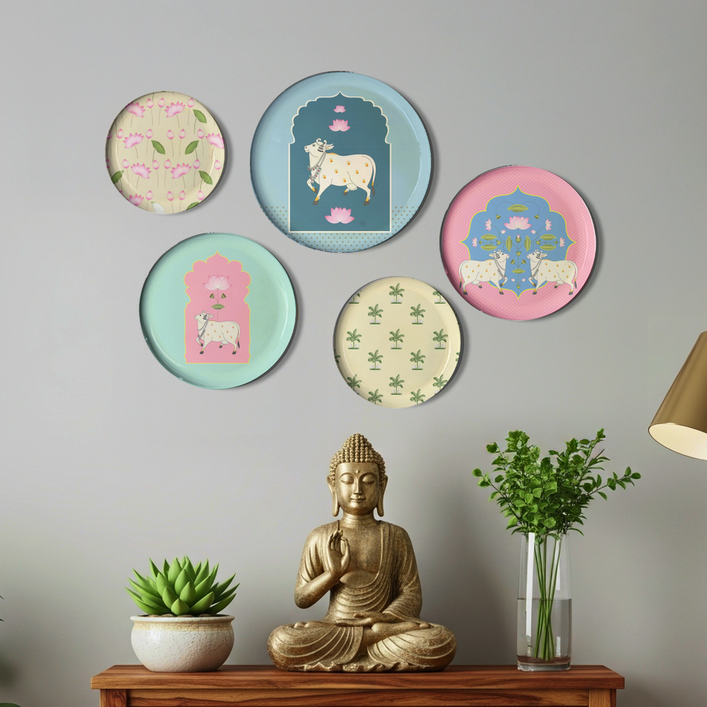 Sacred Cow Pichwai Wall Decor Plate, Set of 5, Art Plate Set