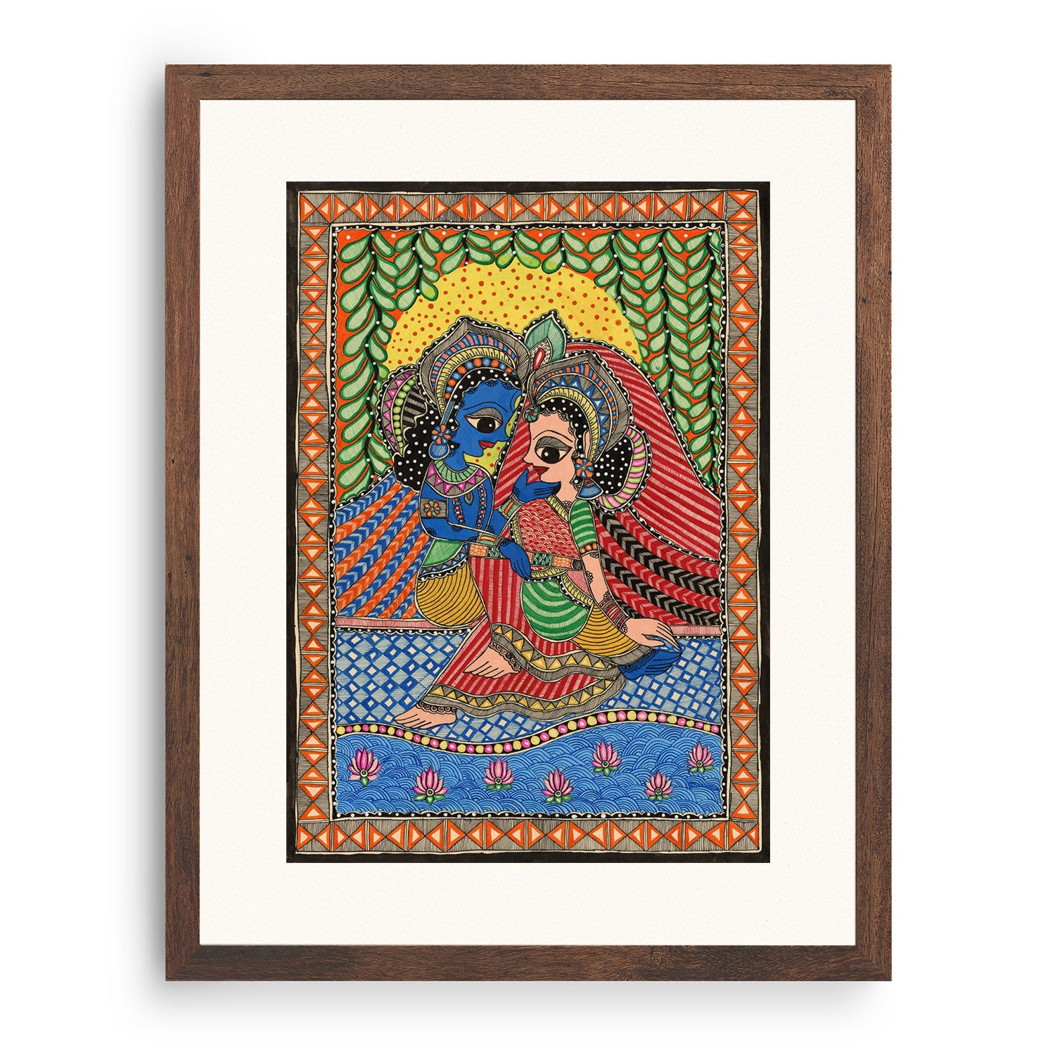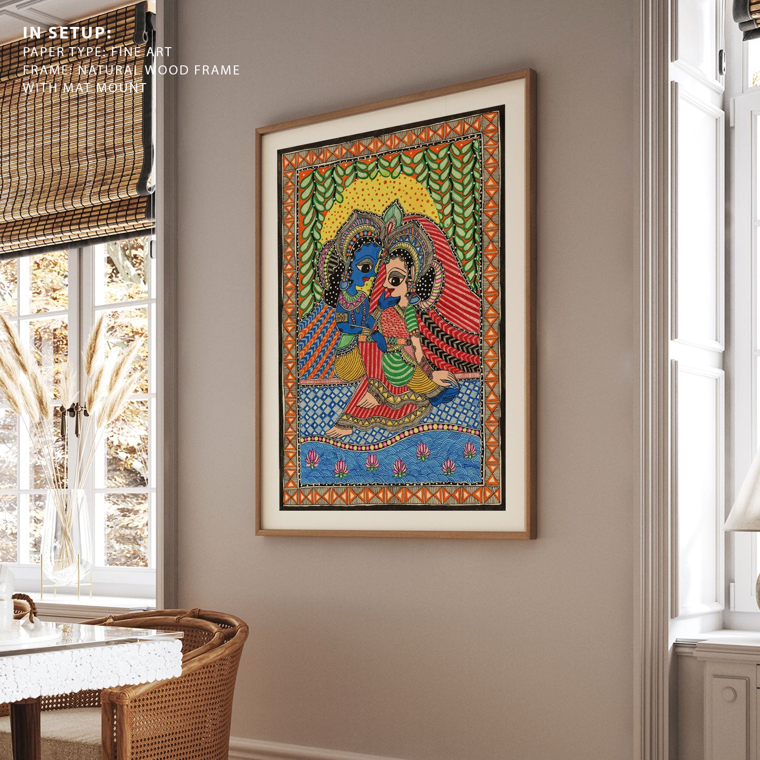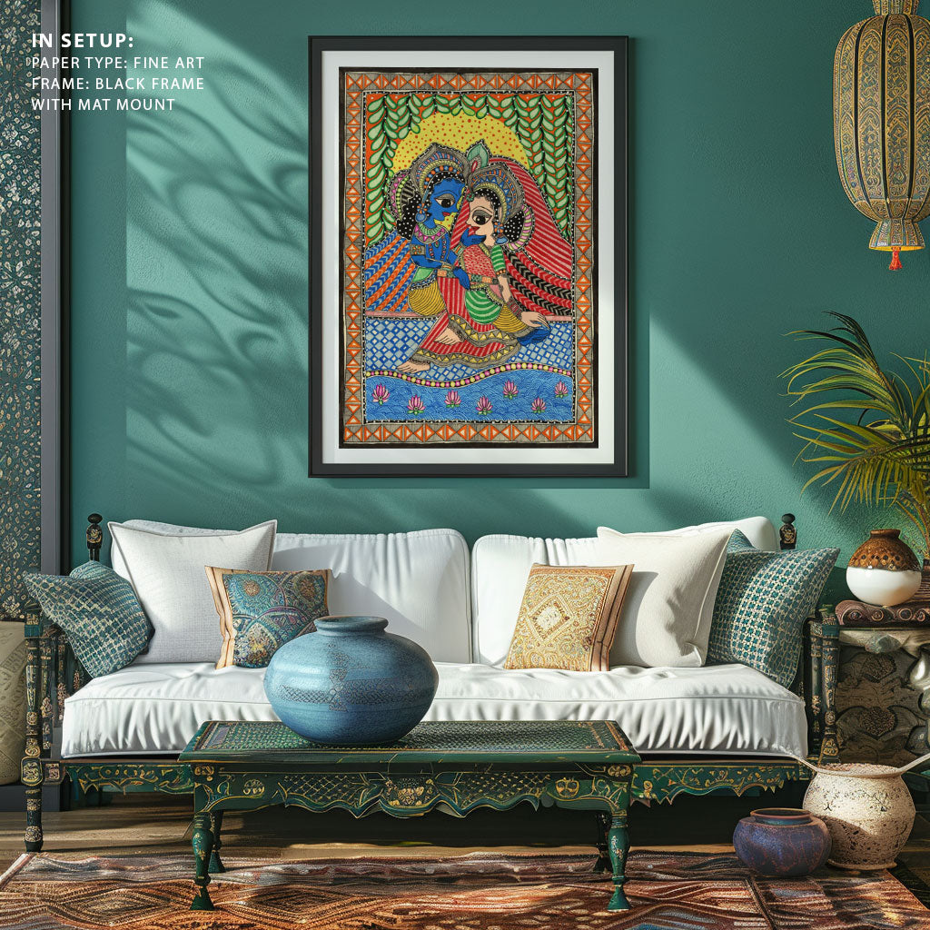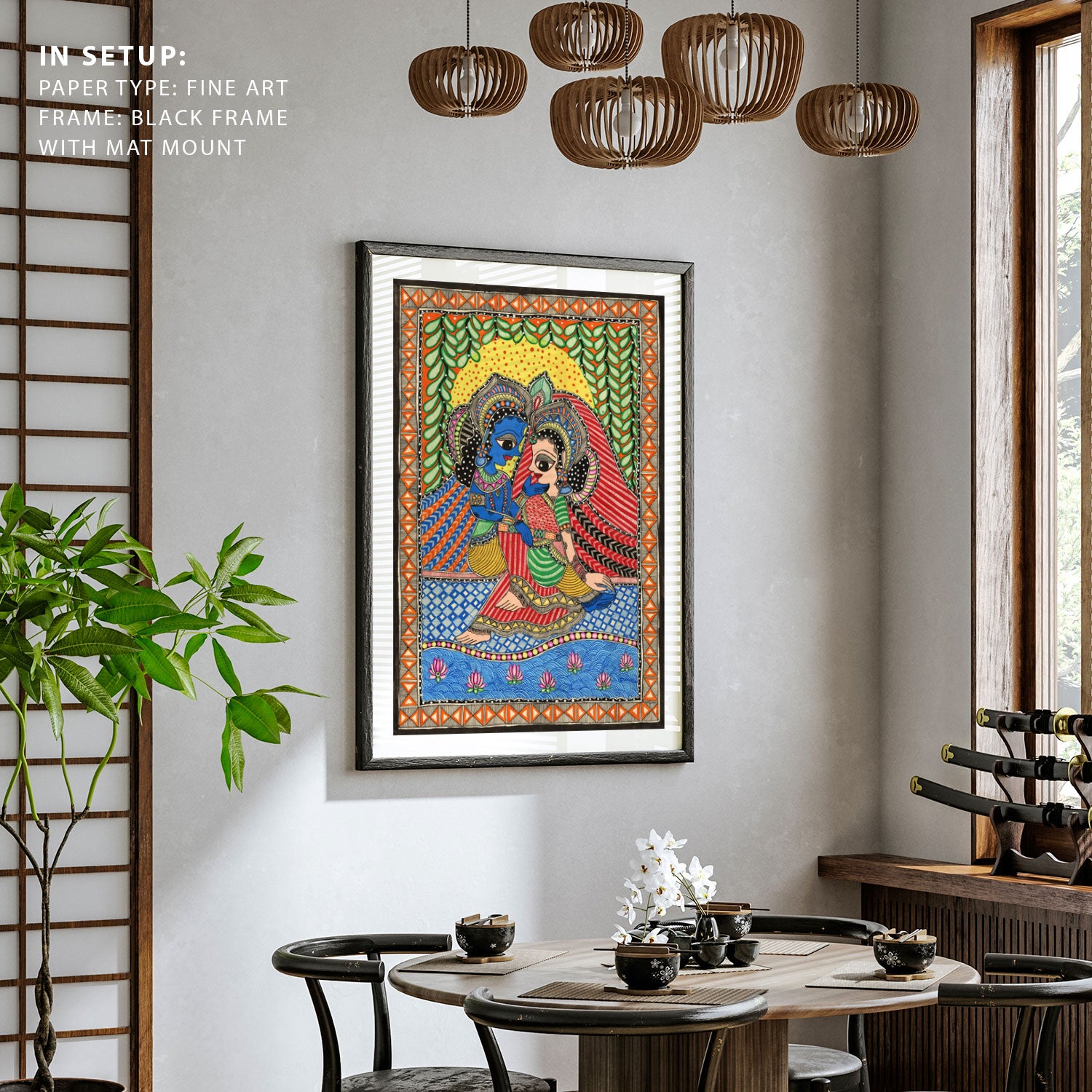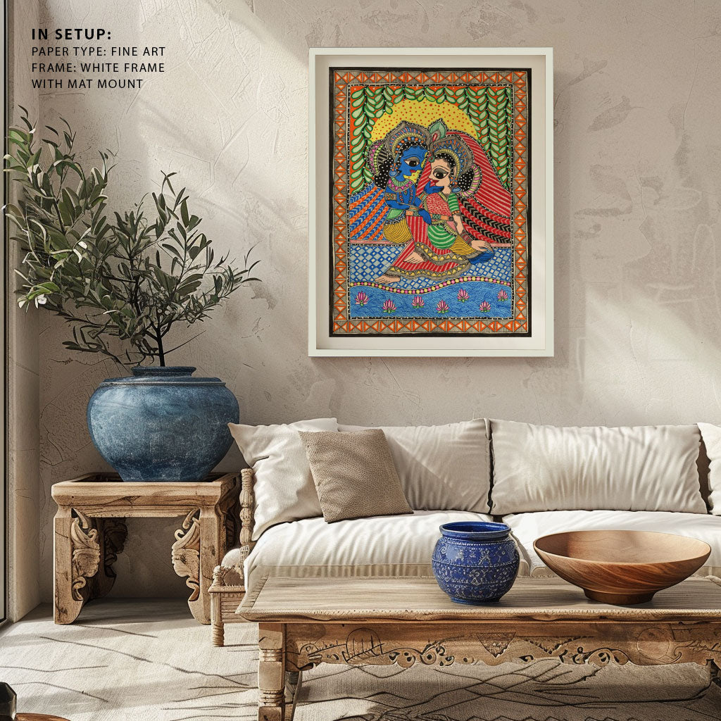 Beautiful Mithila Art Radha Krishna Painting from the Madhubani Paintings Collection is produced on Premium Museum Grade Canvas and Hahnemuhle Fine Art Media. This beautiful Madhubani Painting Art Print product is made with a matte finish and premium quality with vibrant colors. These Madhubani Miniature Paintings Art Prints are produced with the most extreme shading precision and using the most advanced giclee printing technique in the world. We use the same standard that the various museums and art galleries use across the globe to recreate the Madhubani Miniature Paintings Art Prints. These Madhubani Paintings are perfect for you if you're a Madhubani or Indian Culture Lover or if you want to add a Traditional Look to your space. The vibrancy of colors and the unique detailing of every Madhubani Painting Art Print makes them the best in so many ways. This Madhubani Art Print will add charm to any room in your home. These Madhubani Painting Art Prints can be the perfect gift to your friends, colleagues, or family as they sync in very well in your Bedroom, living room, lobby, Balcony, Bathroom, etc.