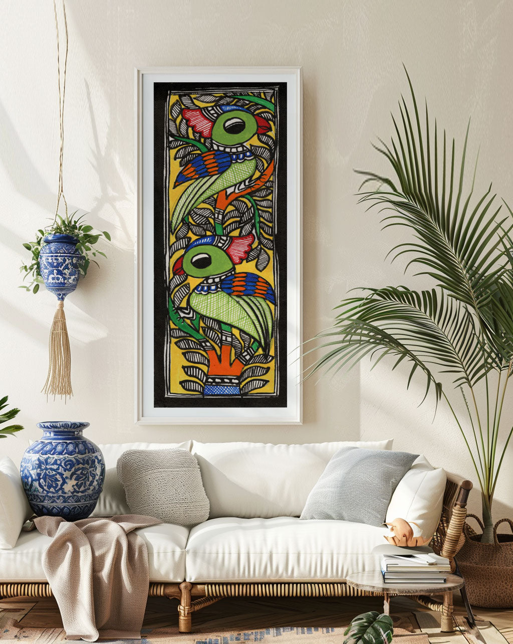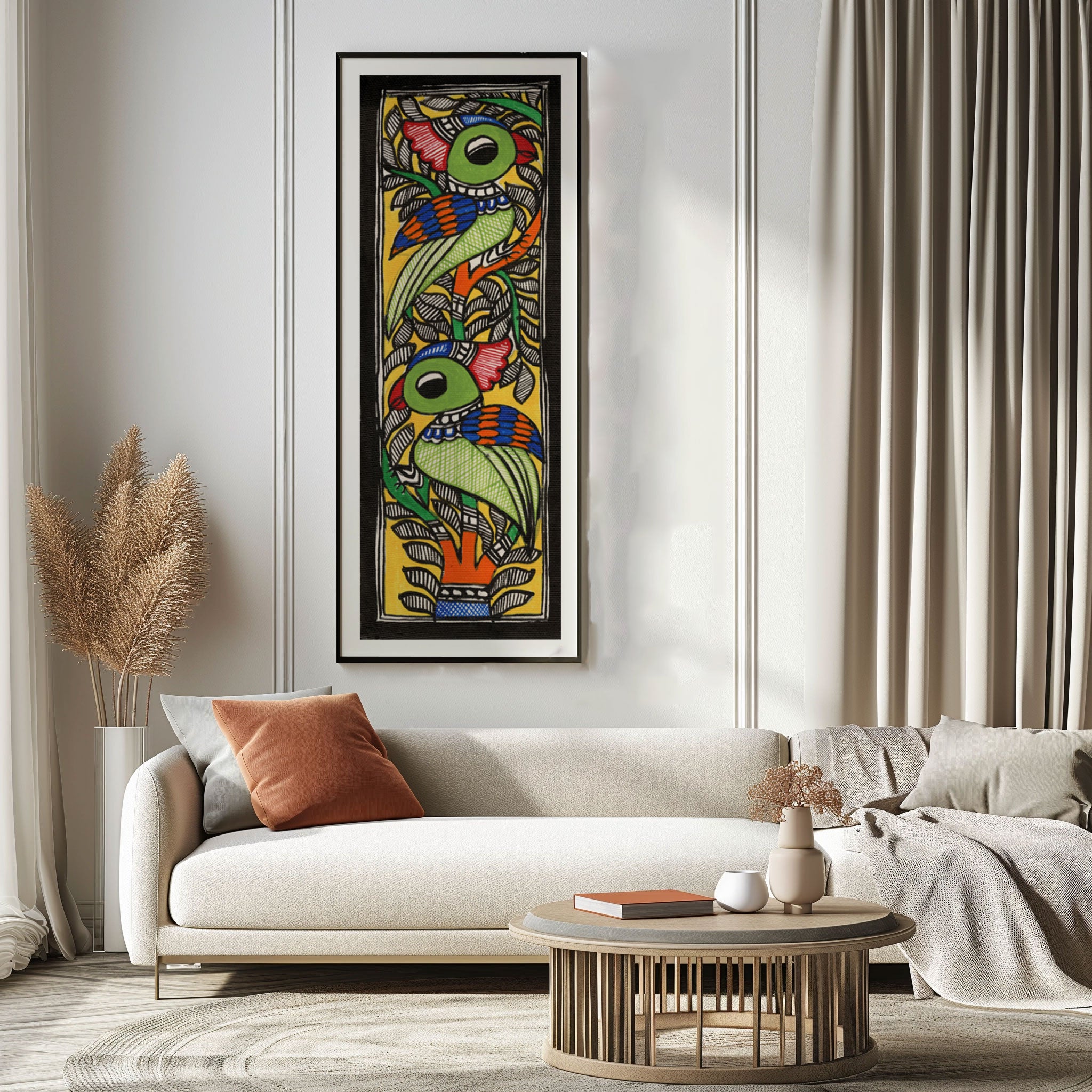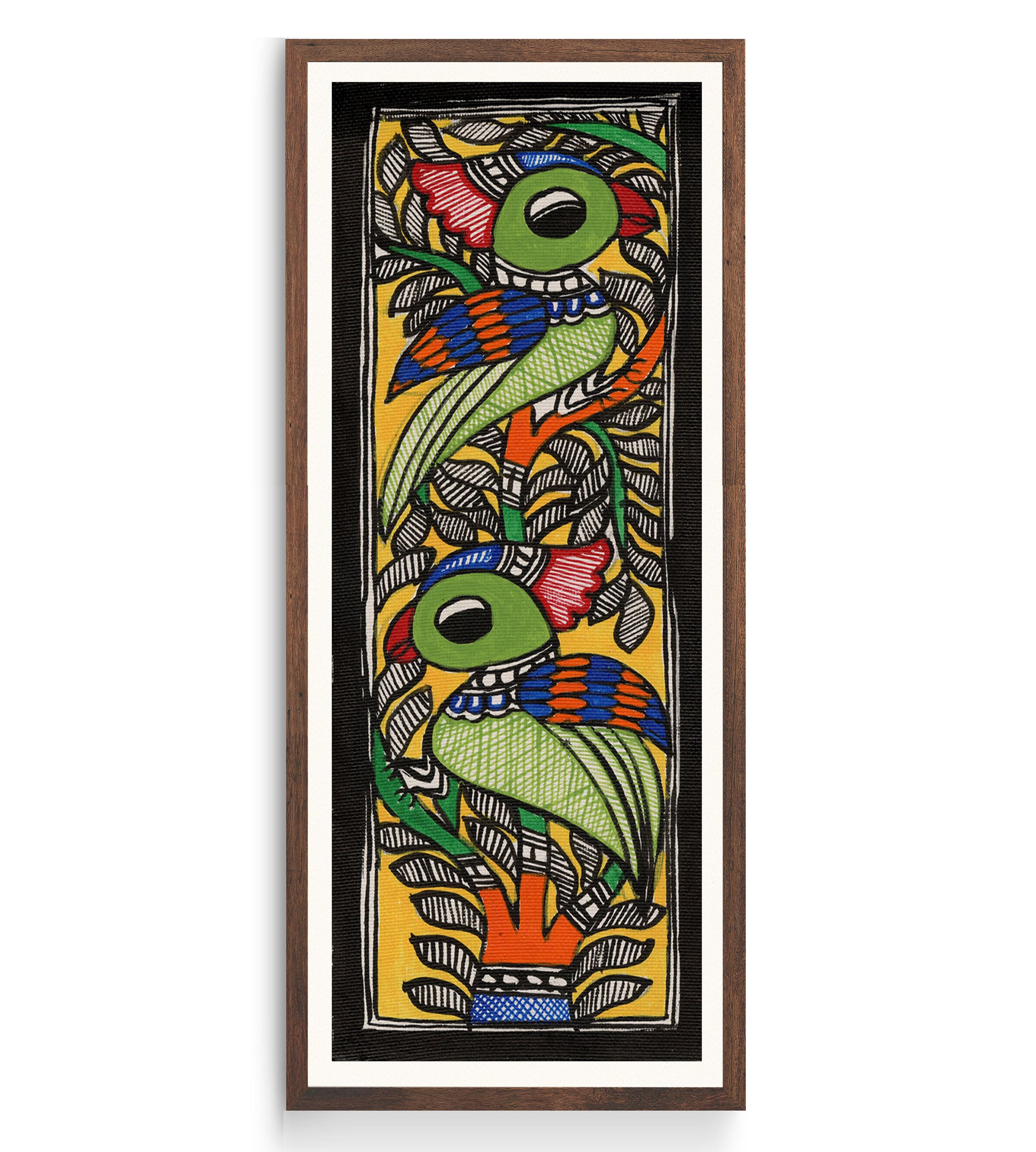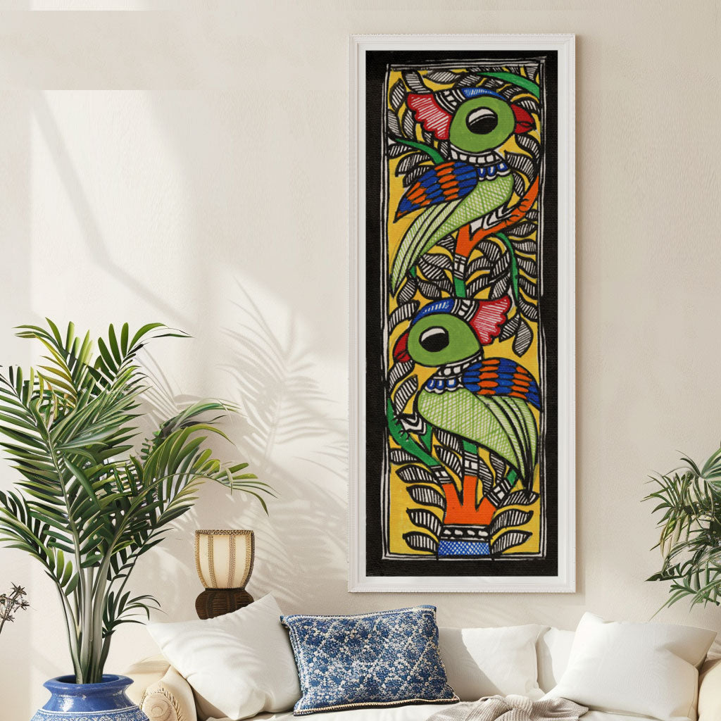 Beautiful Parrots Madhubani Art from the Madhubani Paintings Collection is produced on Premium Museum Grade Canvas and Hahnemuhle Fine Art Media. This beautiful Madhubani Painting Art Print product is made with a matte finish and premium quality with vibrant colors. These Madhubani Miniature Paintings Art Prints are produced with the most extreme shading precision and using the most advanced giclee printing technique in the world. We use the same standard that the various museums and art galleries use across the globe to recreate the Madhubani Miniature Paintings Art Prints. These Madhubani Paintings are perfect for you if you're a Madhubani or Indian Culture Lover or if you want to add a Traditional Look to your space. The vibrancy of colors and the unique detailing of every Madhubani Painting Art Print makes them the best in so many ways. This Madhubani Art Print will add charm to any room in your home. These Madhubani Painting Art Prints can be the perfect gift to your friends, colleagues, or family as they sync in very well in your Bedroom, living room, lobby, Balcony, Bathroom, etc.