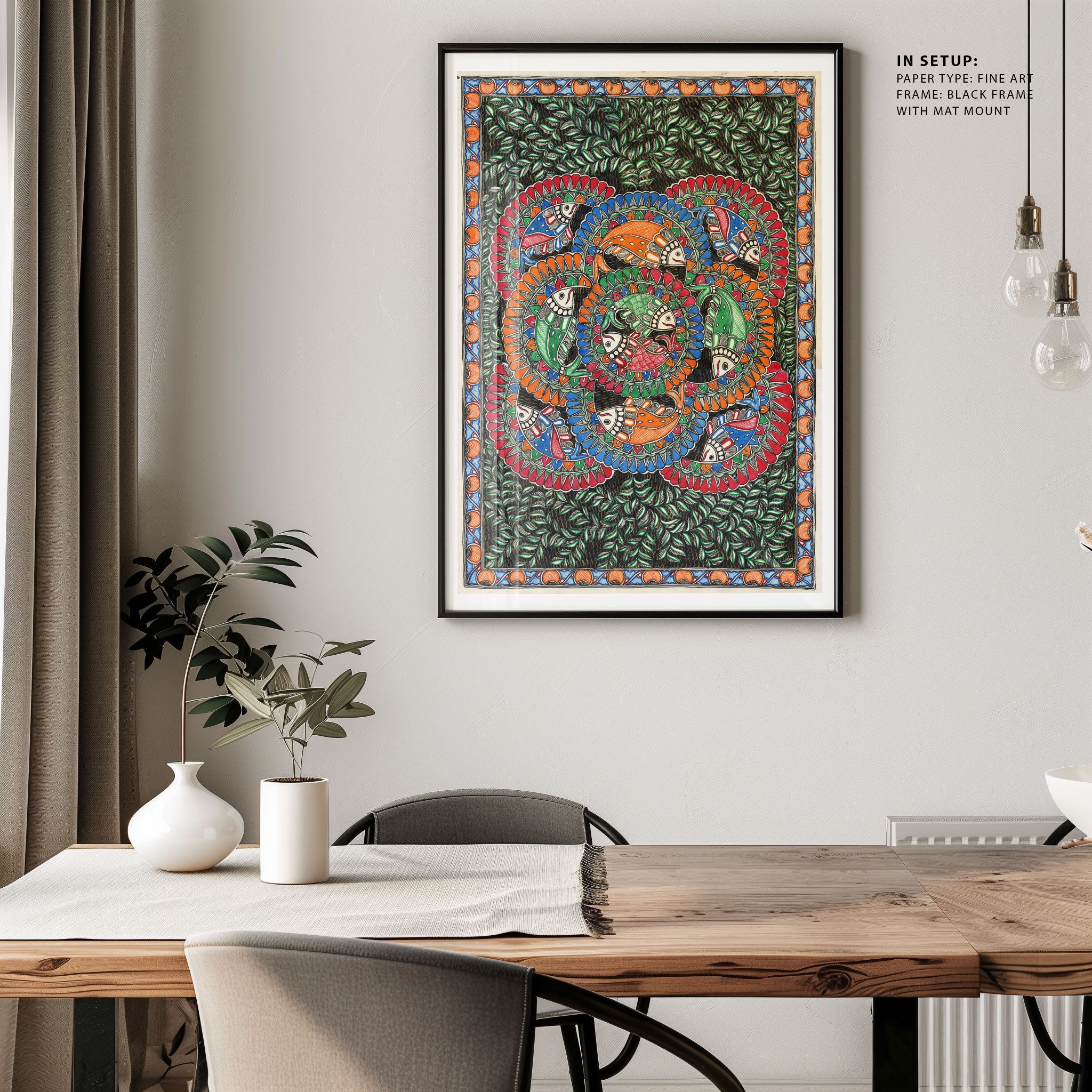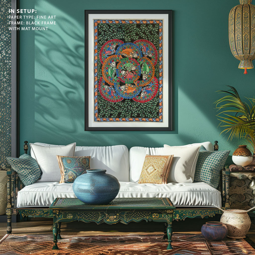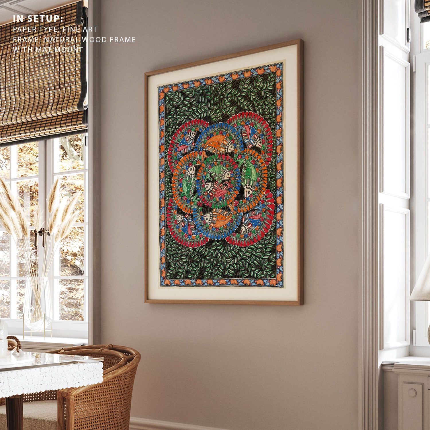 Circular Fishes Madhubani Art from the Madhubani Paintings Collection is produced on Premium Museum Grade Canvas and Hahnemuhle Fine Art Media. This beautiful Madhubani Painting Art Print product is made with a matte finish and premium quality with vibrant colors. These Madhubani Miniature Paintings Art Prints are produced with the most extreme shading precision and using the most advanced giclee printing technique in the world. We use the same standard that the various museums and art galleries use across the globe to recreate the Madhubani Miniature Paintings Art Prints. These Madhubani Paintings are perfect for you if you're a Madhubani or Indian Culture Lover or if you want to add a Traditional Look to your space. The vibrancy of colors and the unique detailing of every Madhubani Painting Art Print makes them the best in so many ways. This Madhubani Art Print will add charm to any room in your home. These Madhubani Painting Art Prints can be the perfect gift to your friends, colleagues, or family as they sync in very well in your Bedroom, living room, lobby, Balcony, Bathroom, etc.