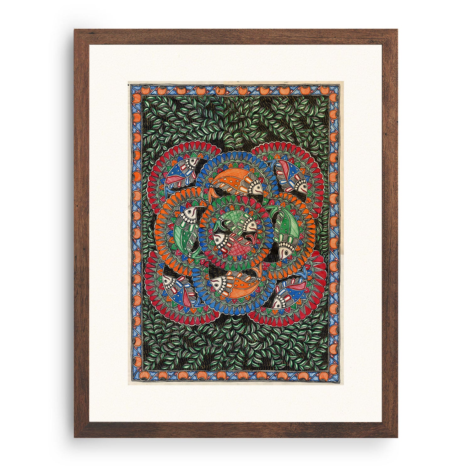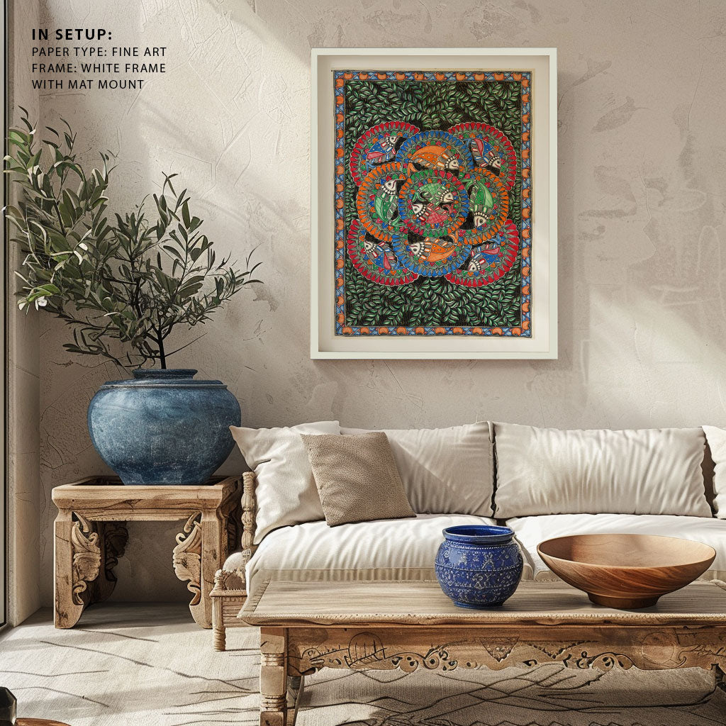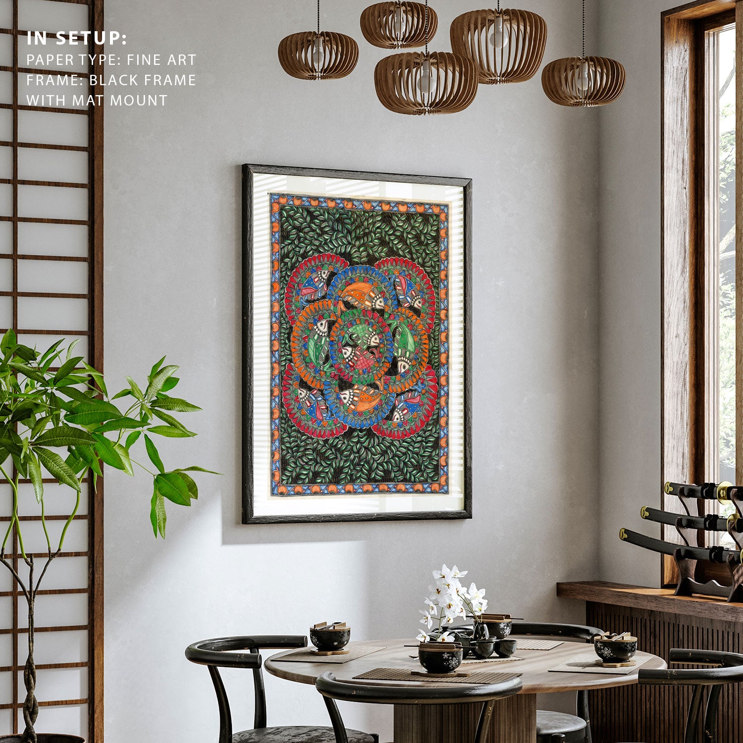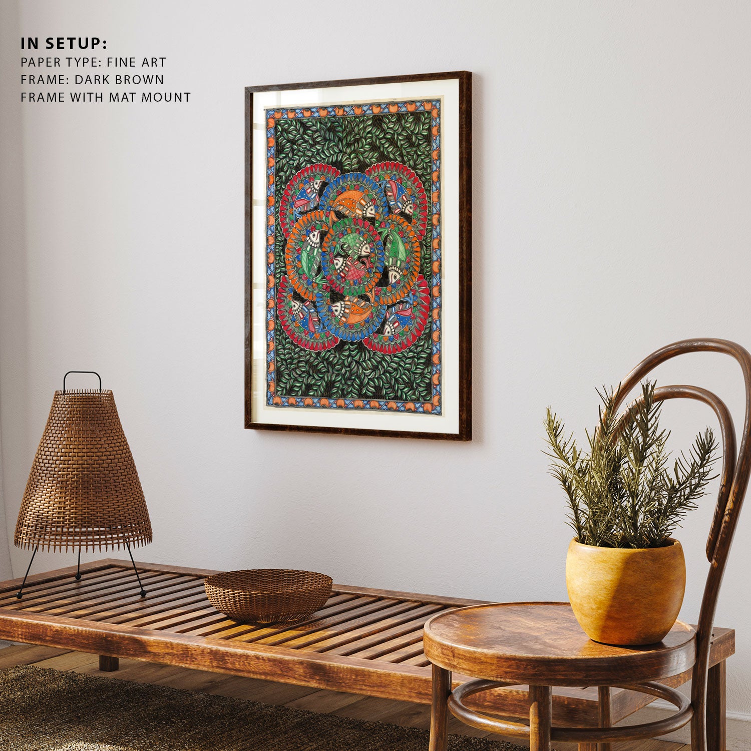 Circular Fishes Madhubani Art from the Madhubani Paintings Collection is produced on Premium Museum Grade Canvas and Hahnemuhle Fine Art Media. This beautiful Madhubani Painting Art Print product is made with a matte finish and premium quality with vibrant colors. These Madhubani Miniature Paintings Art Prints are produced with the most extreme shading precision and using the most advanced giclee printing technique in the world. We use the same standard that the various museums and art galleries use across the globe to recreate the Madhubani Miniature Paintings Art Prints. These Madhubani Paintings are perfect for you if you're a Madhubani or Indian Culture Lover or if you want to add a Traditional Look to your space. The vibrancy of colors and the unique detailing of every Madhubani Painting Art Print makes them the best in so many ways. This Madhubani Art Print will add charm to any room in your home. These Madhubani Painting Art Prints can be the perfect gift to your friends, colleagues, or family as they sync in very well in your Bedroom, living room, lobby, Balcony, Bathroom, etc.