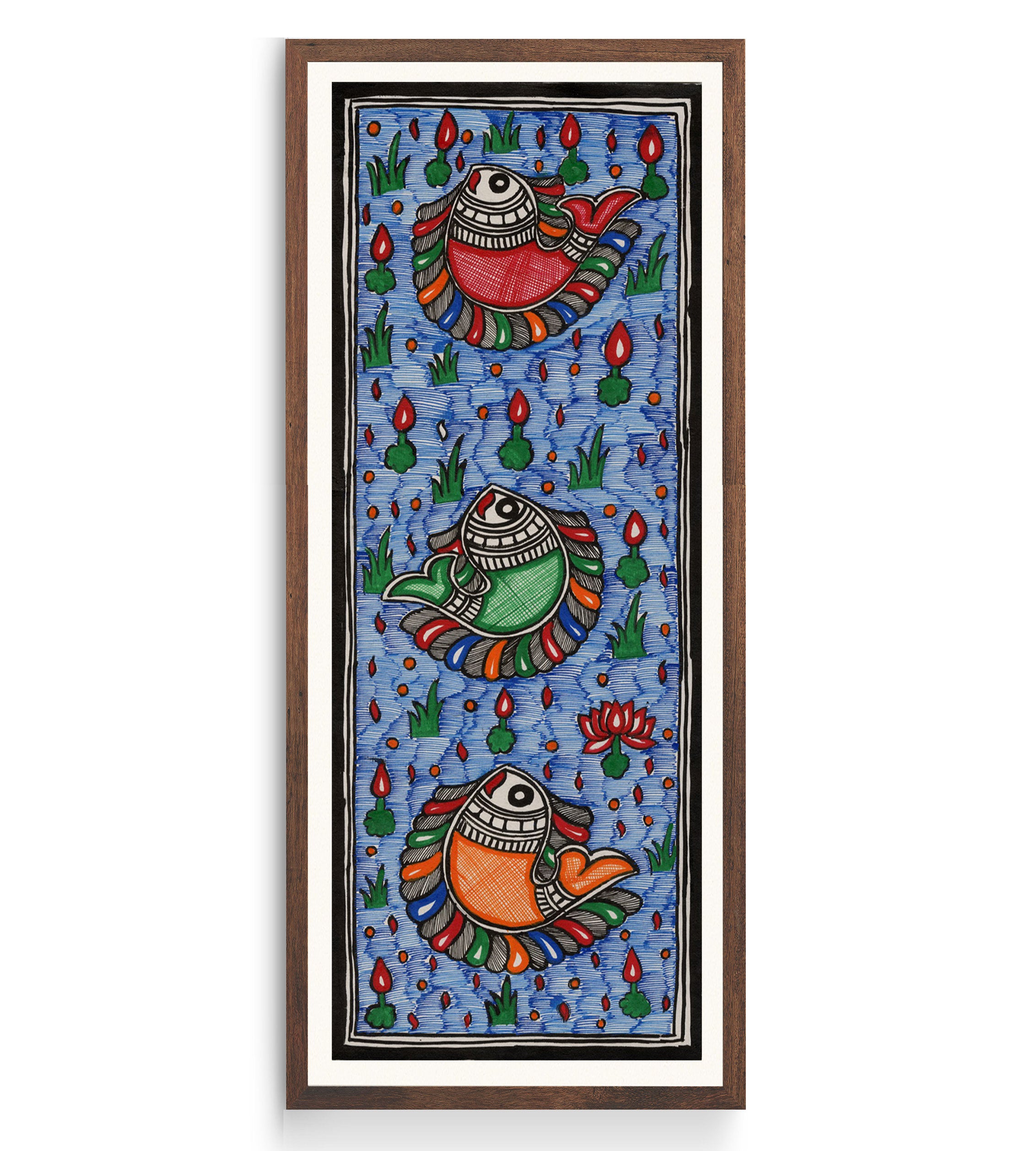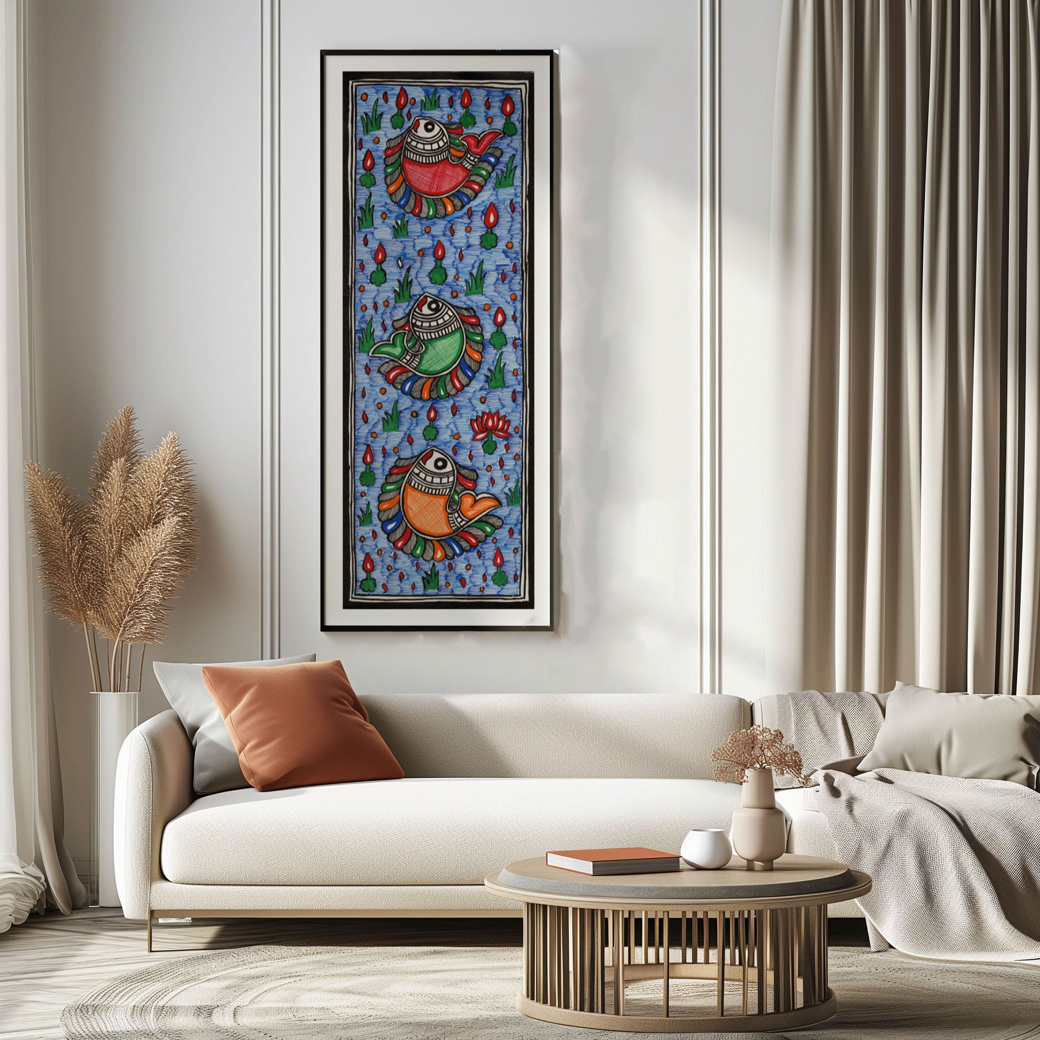 Colorful Fish Art in Madhubani Style from the Madhubani Paintings Collection is produced on Premium Museum Grade Canvas and Hahnemuhle Fine Art Media. This beautiful Madhubani Painting Art Print product is made with a matte finish and premium quality with vibrant colors. These Madhubani Miniature Paintings Art Prints are produced with the most extreme shading precision and using the most advanced giclee printing technique in the world. We use the same standard that the various museums and art galleries use across the globe to recreate the Madhubani Miniature Paintings Art Prints. These Madhubani Paintings are perfect for you if you're a Madhubani or Indian Culture Lover or if you want to add a Traditional Look to your space. The vibrancy of colors and the unique detailing of every Madhubani Painting Art Print makes them the best in so many ways. This Madhubani Art Print will add charm to any room in your home. These Madhubani Painting Art Prints can be the perfect gift to your friends, colleagues, or family as they sync in very well in your Bedroom, living room, lobby, Balcony, Bathroom, etc.