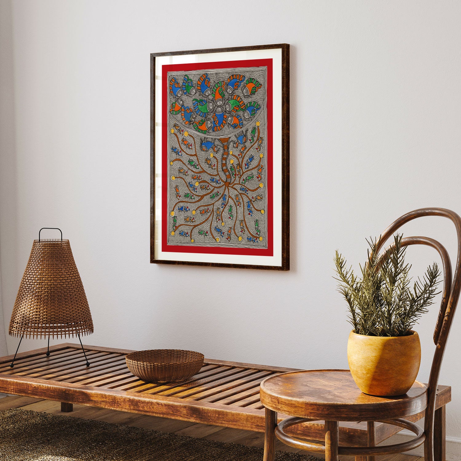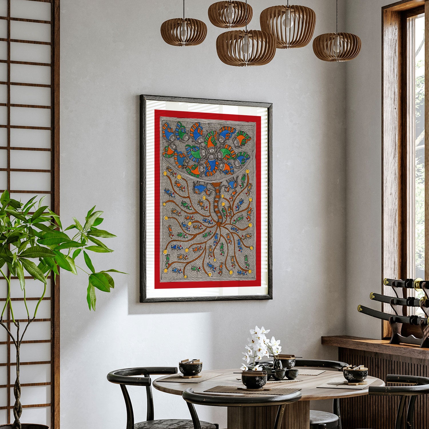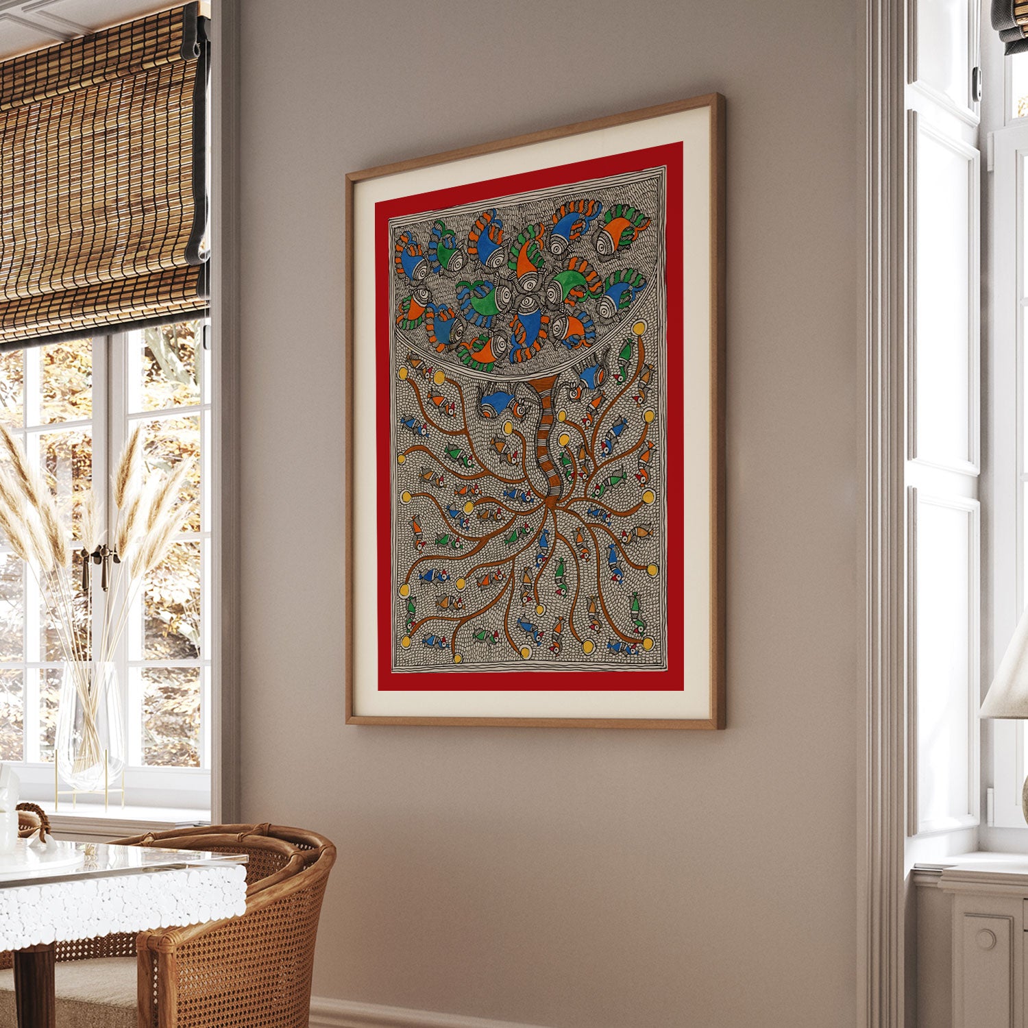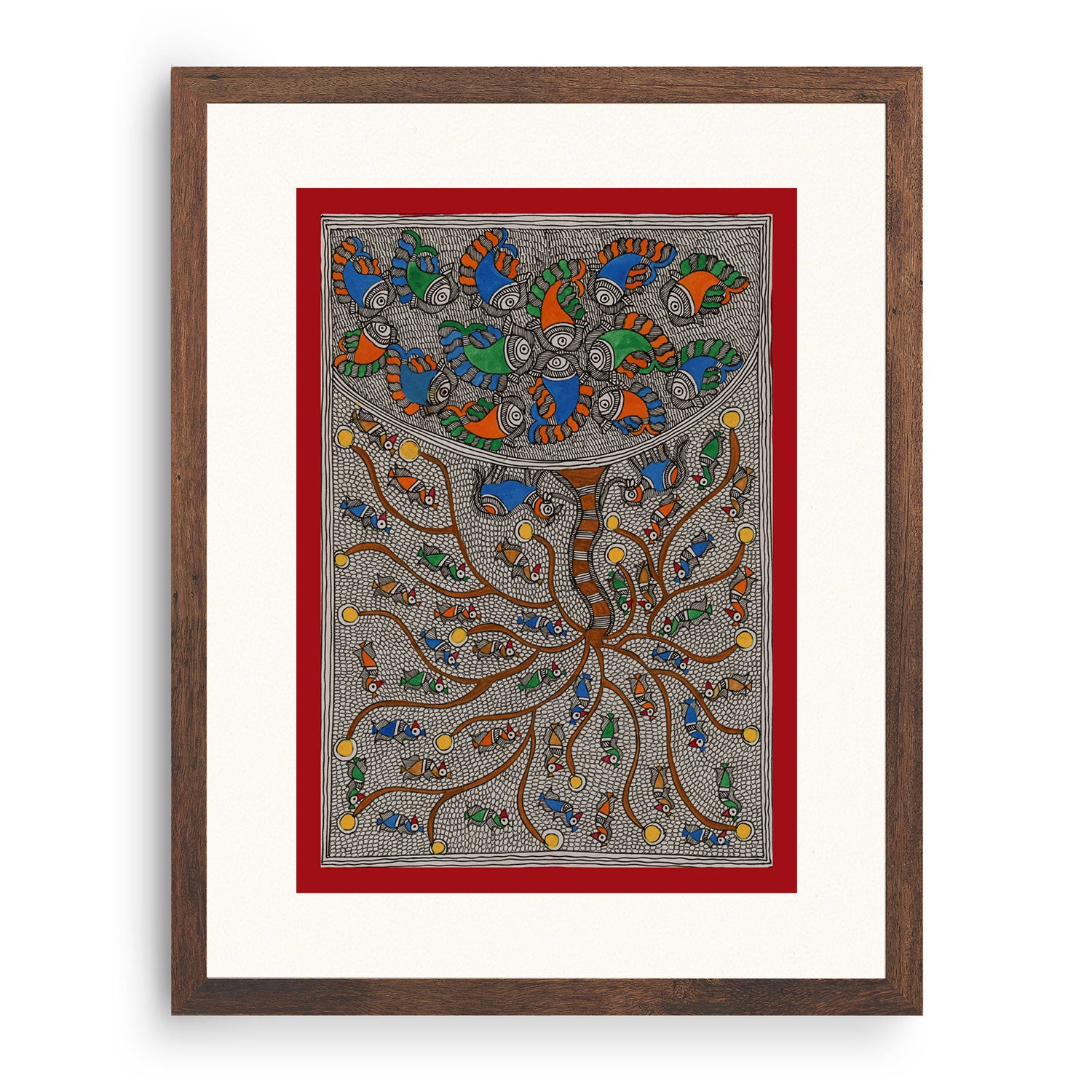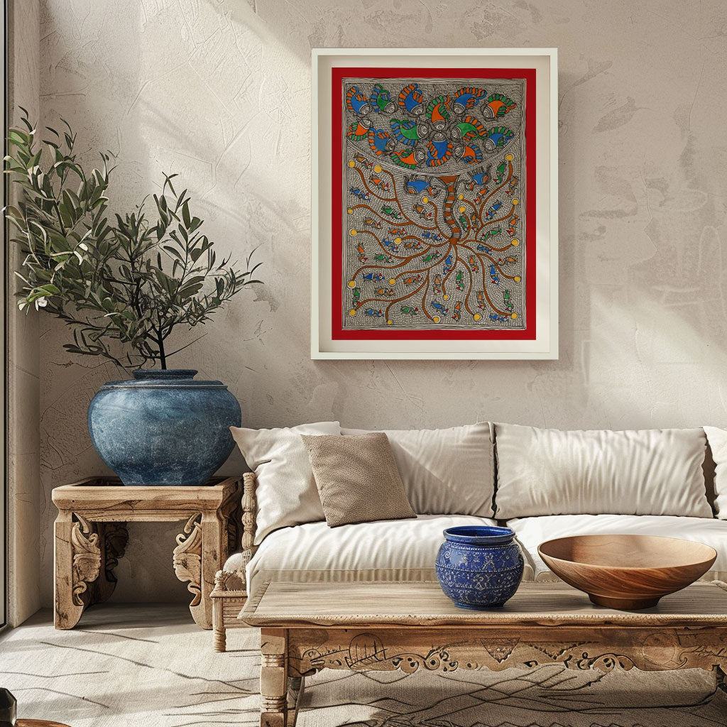 Fish Bloom Tree - Madhubani Art from the Madhubani Paintings Collection is produced on Premium Museum Grade Canvas and Hahnemuhle Fine Art Media. This beautiful Madhubani Painting Art Print product is made with a matte finish and premium quality with vibrant colors. These Madhubani Miniature Paintings Art Prints are produced with the most extreme shading precision and using the most advanced giclee printing technique in the world. We use the same standard that the various museums and art galleries use across the globe to recreate the Madhubani Miniature Paintings Art Prints. These Madhubani Paintings are perfect for you if you're a Madhubani or Indian Culture Lover or if you want to add a Traditional Look to your space. The vibrancy of colors and the unique detailing of every Madhubani Painting Art Print makes them the best in so many ways. This Madhubani Art Print will add charm to any room in your home. These Madhubani Painting Art Prints can be the perfect gift to your friends, colleagues, or family as they sync in very well in your Bedroom, living room, lobby, Balcony, Bathroom, etc.