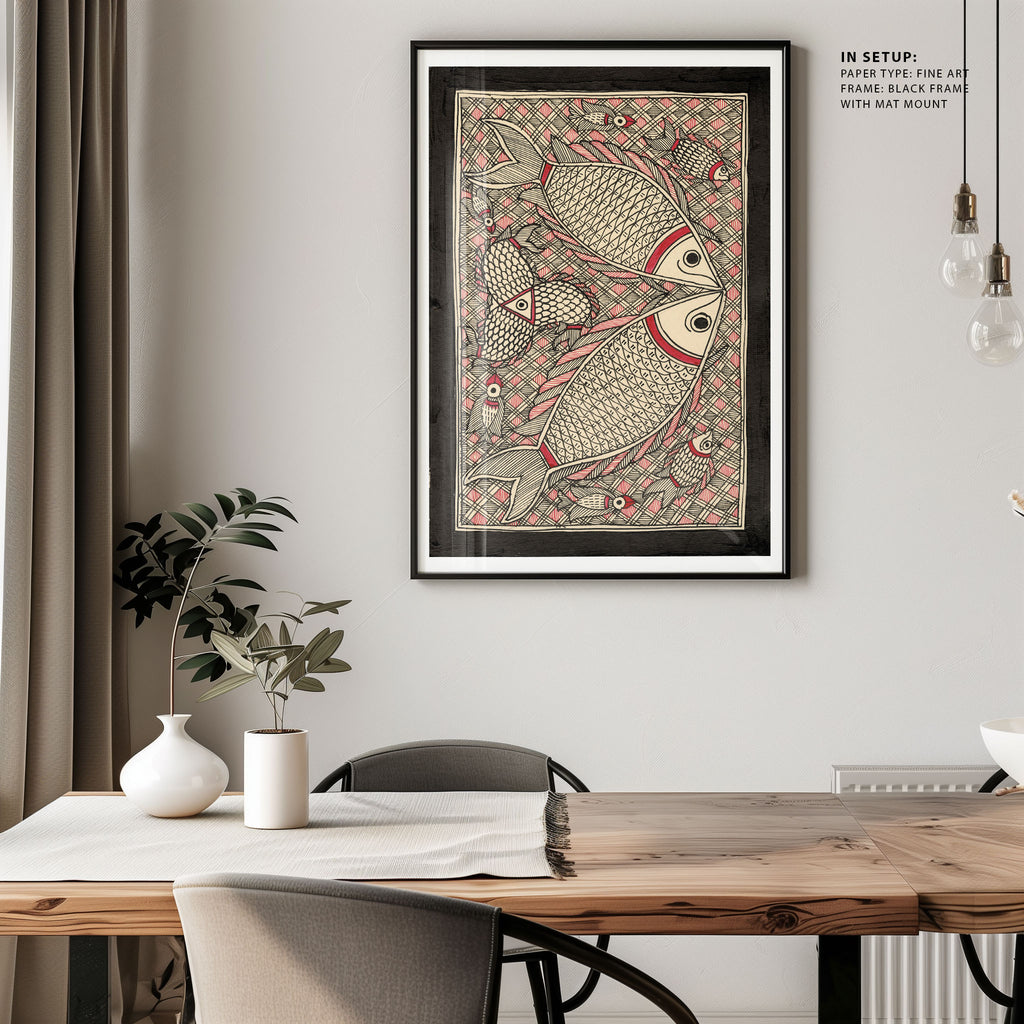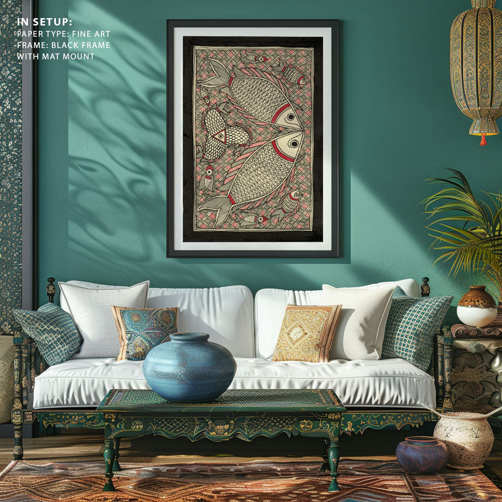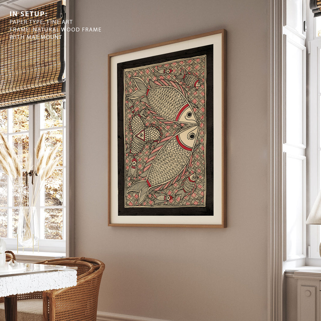 Flowing Fishes in Mithila Madhubani Art from the Madhubani Paintings Collection is produced on Premium Museum Grade Canvas and Hahnemuhle Fine Art Media. This beautiful Madhubani Painting Art Print product is made with a matte finish and premium quality with vibrant colors. These Madhubani Miniature Paintings Art Prints are produced with the most extreme shading precision and using the most advanced giclee printing technique in the world. We use the same standard that the various museums and art galleries use across the globe to recreate the Madhubani Miniature Paintings Art Prints. These Madhubani Paintings are perfect for you if you're a Madhubani or Indian Culture Lover or if you want to add a Traditional Look to your space. The vibrancy of colors and the unique detailing of every Madhubani Painting Art Print makes them the best in so many ways. This Madhubani Art Print will add charm to any room in your home. These Madhubani Painting Art Prints can be the perfect gift to your friends, colleagues, or family as they sync in very well in your Bedroom, living room, lobby, Balcony, Bathroom, etc.
