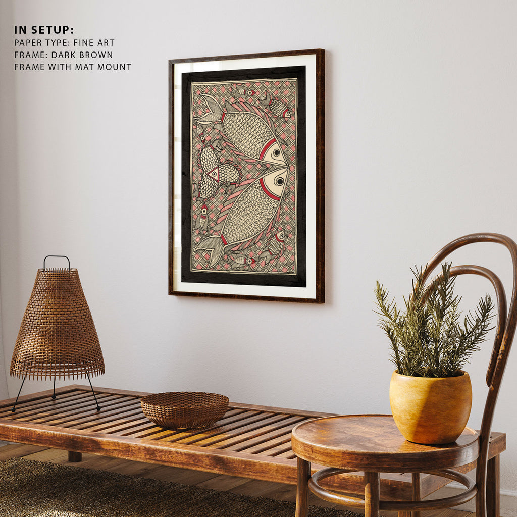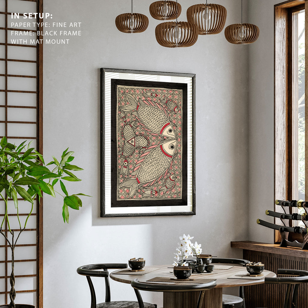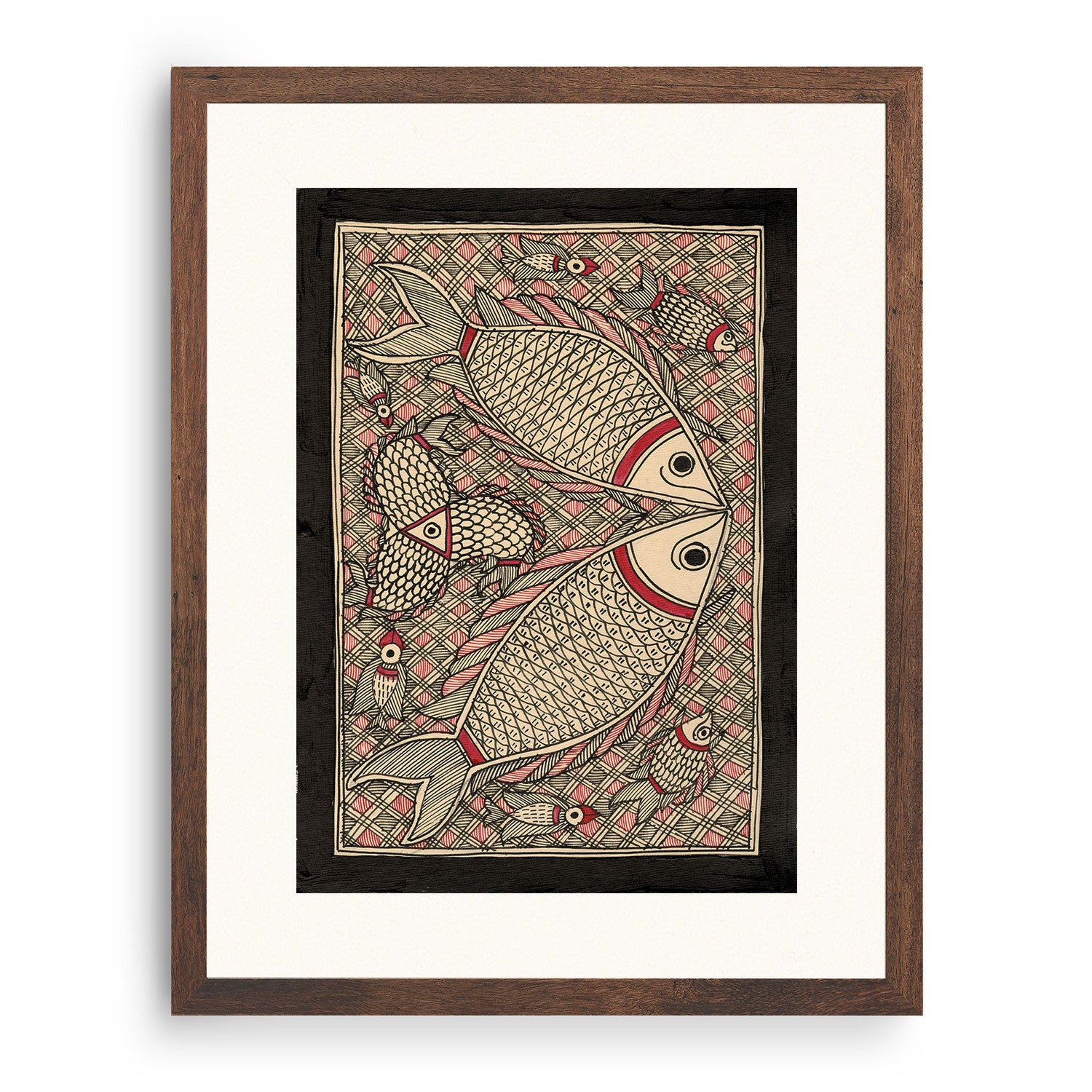 Flowing Fishes in Mithila Madhubani Art from the Madhubani Paintings Collection is produced on Premium Museum Grade Canvas and Hahnemuhle Fine Art Media. This beautiful Madhubani Painting Art Print product is made with a matte finish and premium quality with vibrant colors. These Madhubani Miniature Paintings Art Prints are produced with the most extreme shading precision and using the most advanced giclee printing technique in the world. We use the same standard that the various museums and art galleries use across the globe to recreate the Madhubani Miniature Paintings Art Prints. These Madhubani Paintings are perfect for you if you're a Madhubani or Indian Culture Lover or if you want to add a Traditional Look to your space. The vibrancy of colors and the unique detailing of every Madhubani Painting Art Print makes them the best in so many ways. This Madhubani Art Print will add charm to any room in your home. These Madhubani Painting Art Prints can be the perfect gift to your friends, colleagues, or family as they sync in very well in your Bedroom, living room, lobby, Balcony, Bathroom, etc.