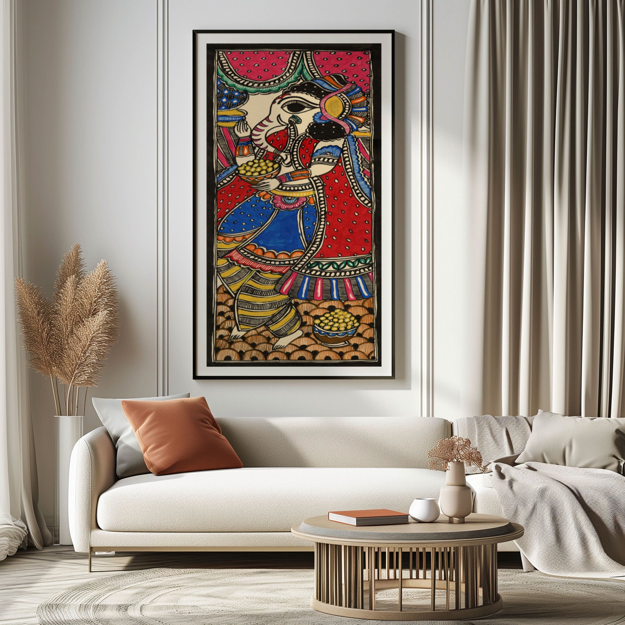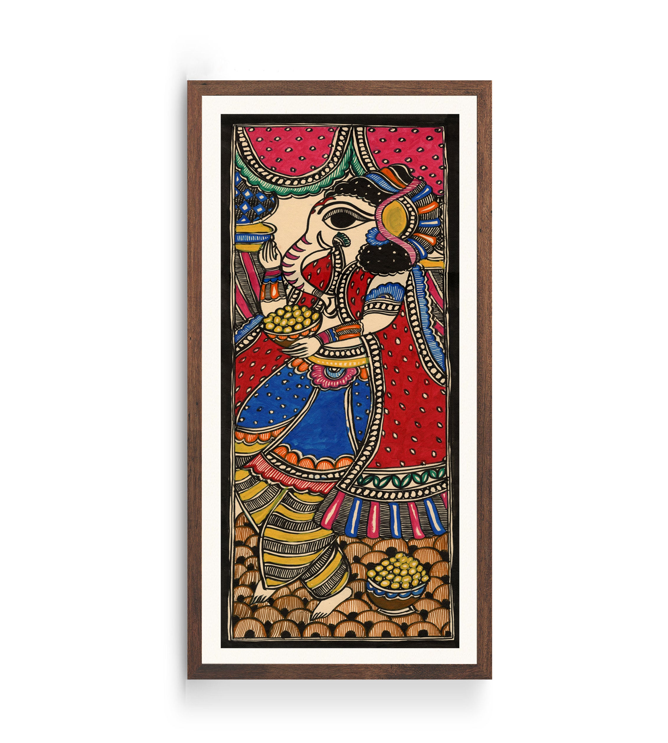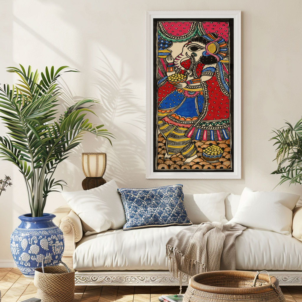 Ganesha Mithila Painting - Madhubani Art from the Madhubani Paintings Collection is produced on Premium Museum Grade Canvas and Hahnemuhle Fine Art Media. This beautiful Madhubani Painting Art Print product is made with a matte finish and premium quality with vibrant colors. These Madhubani Miniature Paintings Art Prints are produced with the most extreme shading precision and using the most advanced giclee printing technique in the world. We use the same standard that the various museums and art galleries use across the globe to recreate the Madhubani Miniature Paintings Art Prints. These Madhubani Paintings are perfect for you if you're a Madhubani or Indian Culture Lover or if you want to add a Traditional Look to your space. The vibrancy of colors and the unique detailing of every Madhubani Painting Art Print makes them the best in so many ways. This Madhubani Art Print will add charm to any room in your home. These Madhubani Painting Art Prints can be the perfect gift to your friends, colleagues, or family as they sync in very well in your Bedroom, living room, lobby, Balcony, Bathroom, etc.