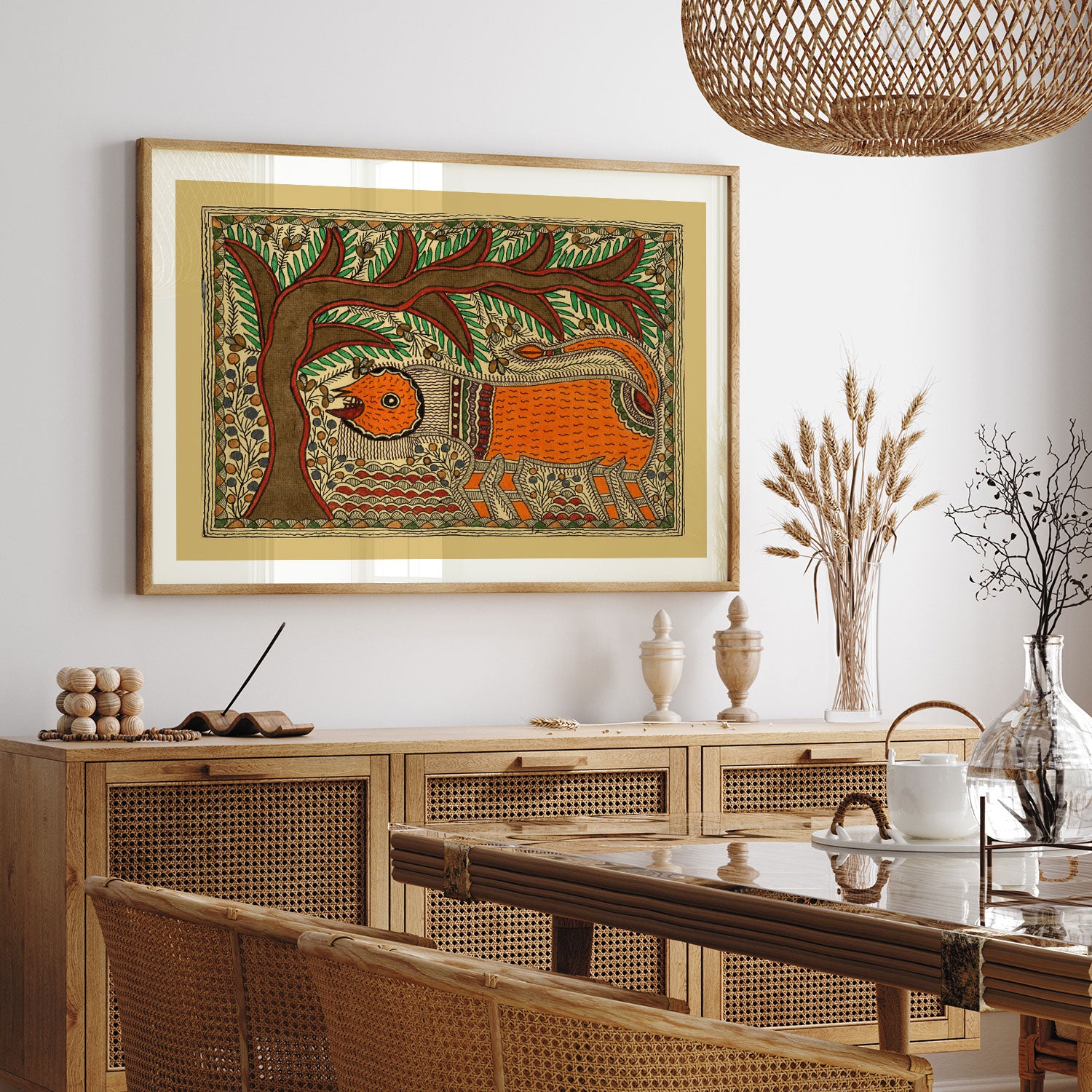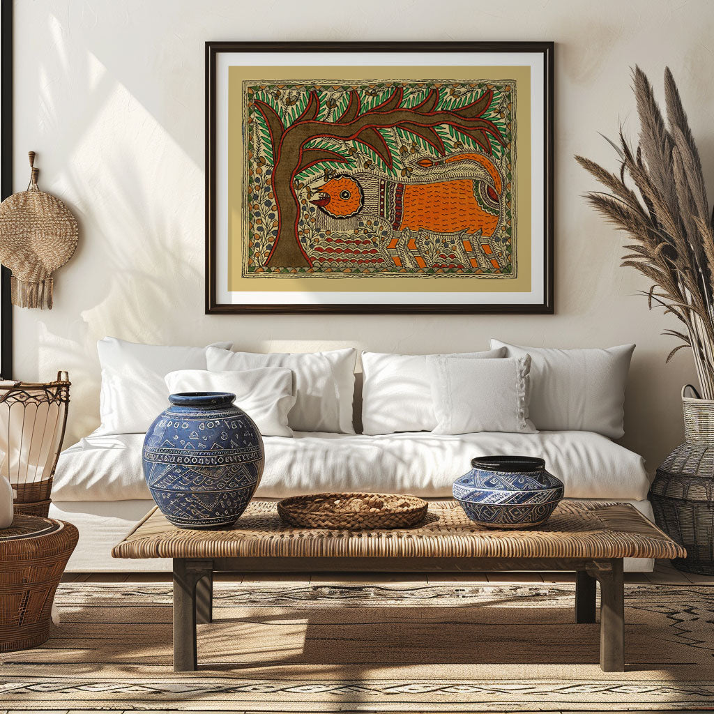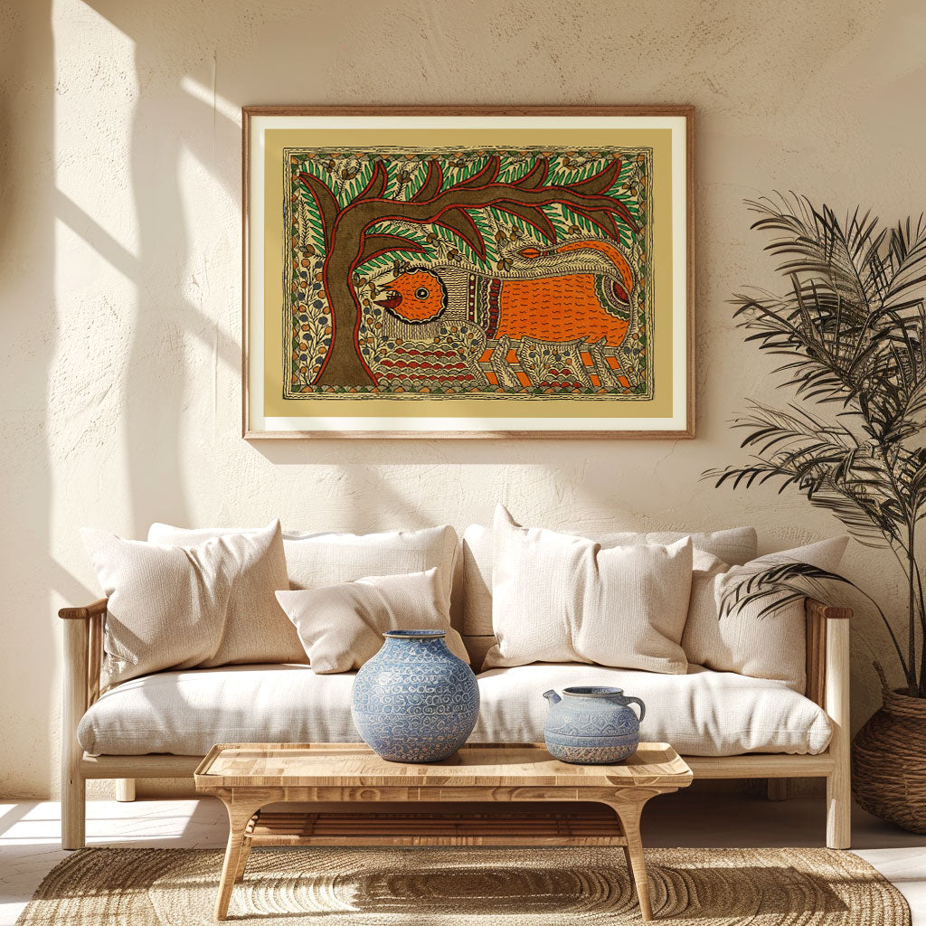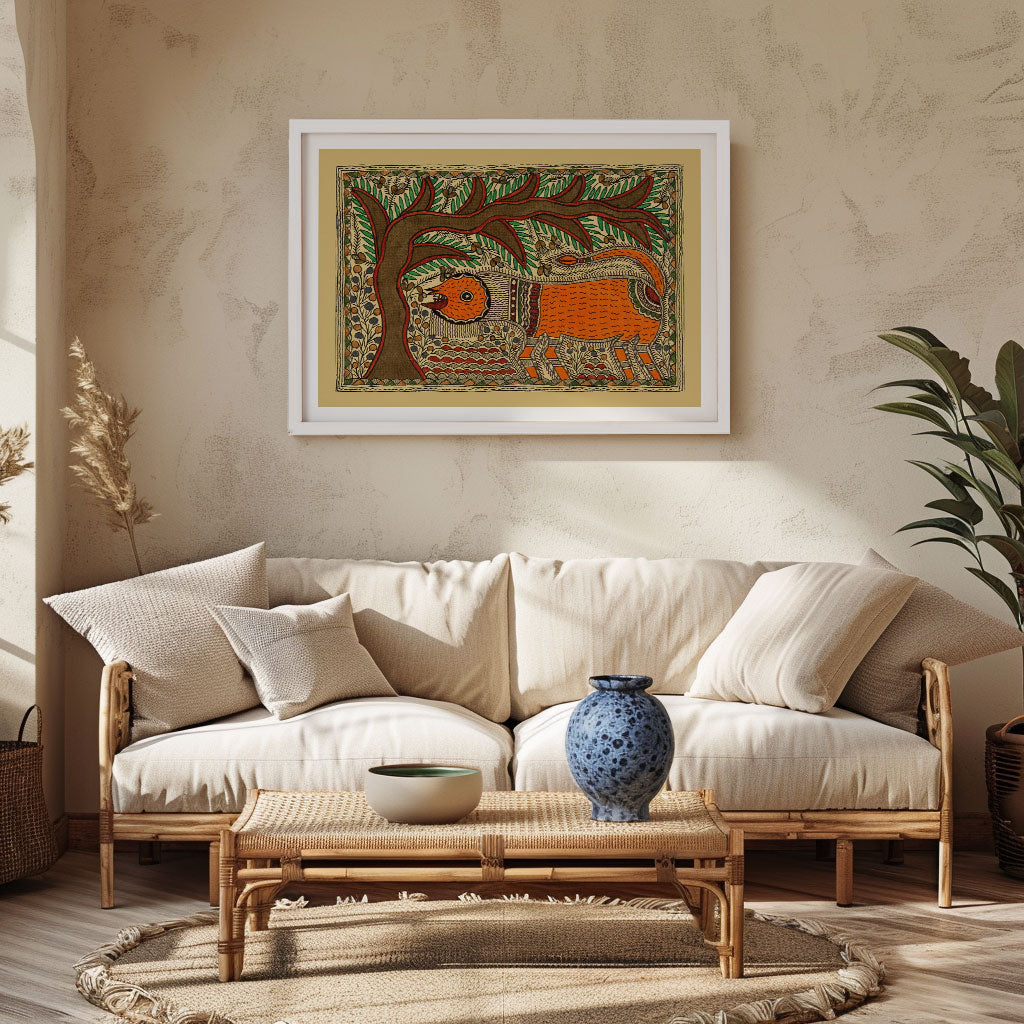 Elephant & Tree - Madhubani Art from the Madhubani Paintings Collection is produced on Premium Museum Grade Canvas and Hahnemuhle Fine Art Media. This beautiful Madhubani Painting Art Print product is made with a matte finish and premium quality with vibrant colors. These Madhubani Miniature Paintings Art Prints are produced with the most extreme shading precision and using the most advanced giclee printing technique in the world. We use the same standard that the various museums and art galleries use across the globe to recreate the Madhubani Miniature Paintings Art Prints. These Madhubani Paintings are perfect for you if you're a Madhubani or Indian Culture Lover or if you want to add a Traditional Look to your space. The vibrancy of colors and the unique detailing of every Madhubani Painting Art Print makes them the best in so many ways. This Madhubani Art Print will add charm to any room in your home. These Madhubani Painting Art Prints can be the perfect gift to your friends, colleagues, or family as they sync in very well in your Bedroom, living room, lobby, Balcony, Bathroom, etc.