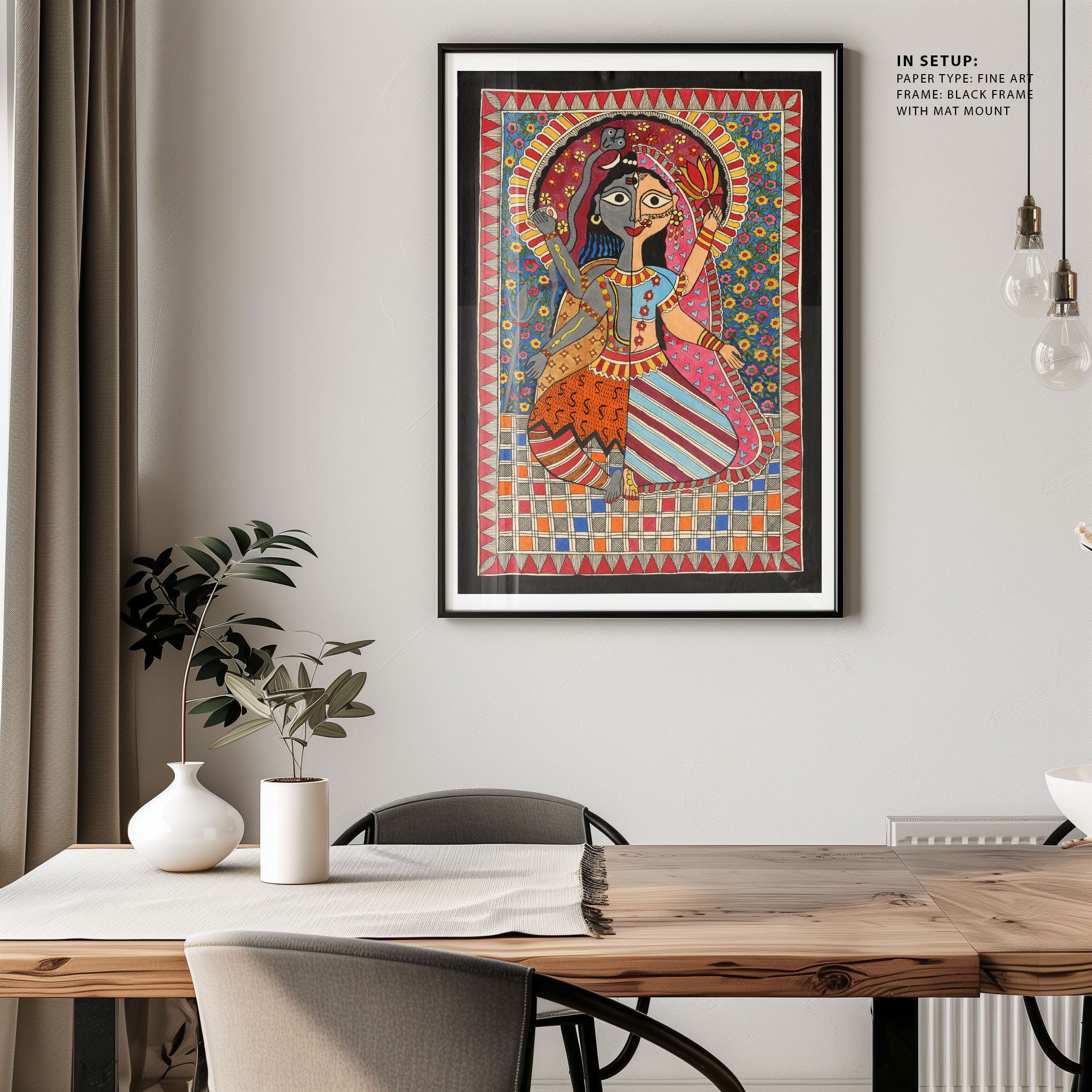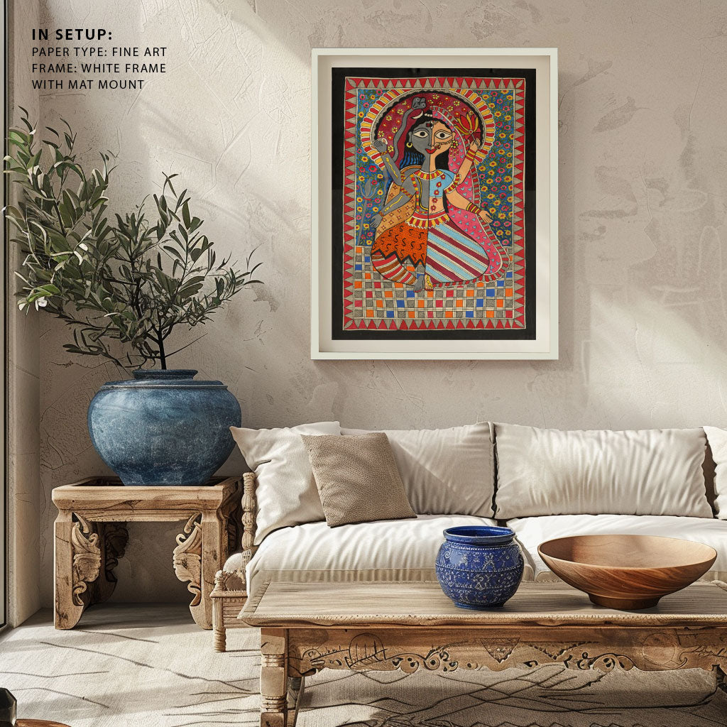 Madhubani Ardhanarishvara Art from the Madhubani Paintings Collection is produced on Premium Museum Grade Canvas and Hahnemuhle Fine Art Media. This beautiful Madhubani Painting Art Print product is made with a matte finish and premium quality with vibrant colors. These Madhubani Miniature Paintings Art Prints are produced with the most extreme shading precision and using the most advanced giclee printing technique in the world. We use the same standard that the various museums and art galleries use across the globe to recreate the Madhubani Miniature Paintings Art Prints. These Madhubani Paintings are perfect for you if you're a Madhubani or Indian Culture Lover or if you want to add a Traditional Look to your space. The vibrancy of colors and the unique detailing of every Madhubani Painting Art Print makes them the best in so many ways. This Madhubani Art Print will add charm to any room in your home. These Madhubani Painting Art Prints can be the perfect gift to your friends, colleagues, or family as they sync in very well in your Bedroom, living room, lobby, Balcony, Bathroom, etc.