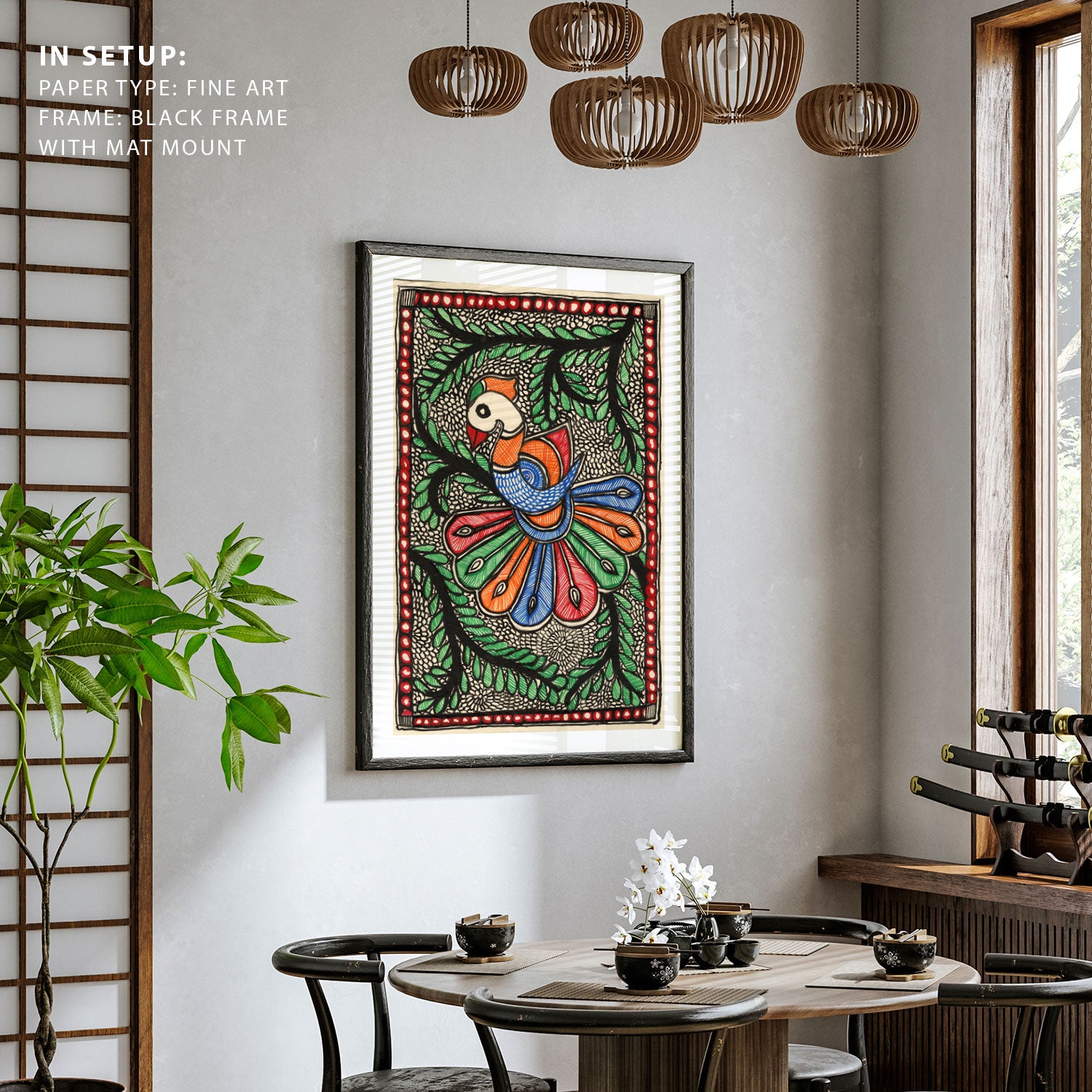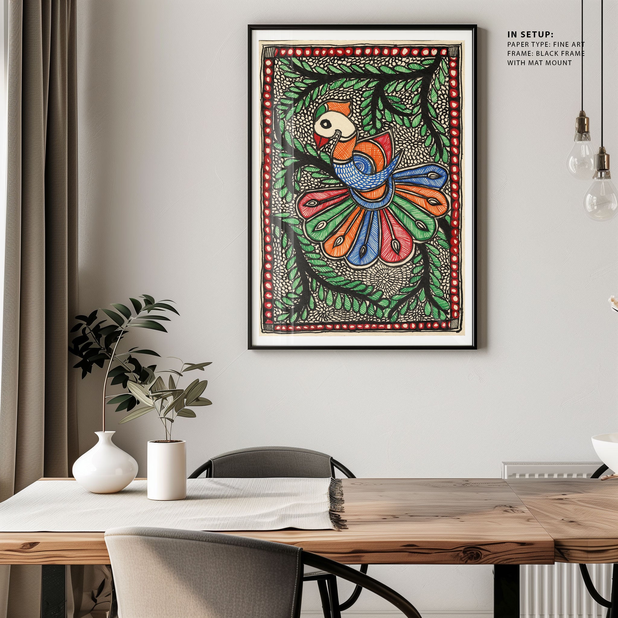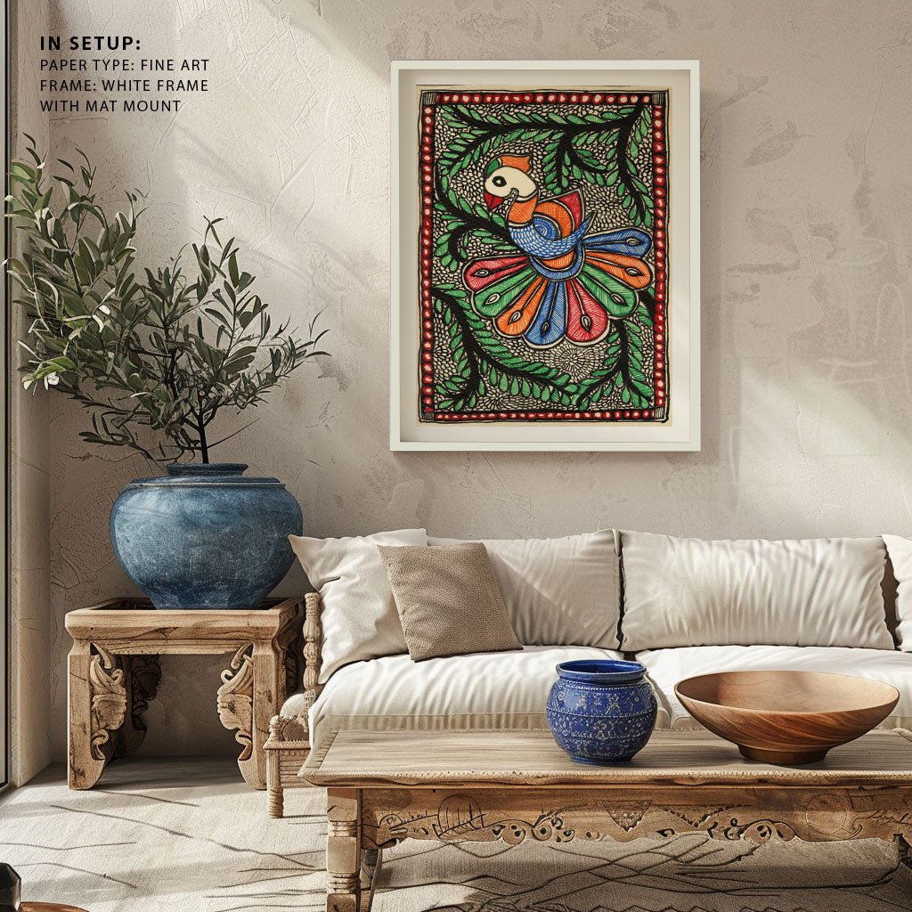 Madhubani Art Traditional Peacock from the Madhubani Paintings Collection is produced on Premium Museum Grade Canvas and Hahnemuhle Fine Art Media. This beautiful Madhubani Painting Art Print product is made with a matte finish and premium quality with vibrant colors. These Madhubani Miniature Paintings Art Prints are produced with the most extreme shading precision and using the most advanced giclee printing technique in the world. We use the same standard that the various museums and art galleries use across the globe to recreate the Madhubani Miniature Paintings Art Prints. These Madhubani Paintings are perfect for you if you're a Madhubani or Indian Culture Lover or if you want to add a Traditional Look to your space. The vibrancy of colors and the unique detailing of every Madhubani Painting Art Print makes them the best in so many ways. This Madhubani Art Print will add charm to any room in your home. These Madhubani Painting Art Prints can be the perfect gift to your friends, colleagues, or family as they sync in very well in your Bedroom, living room, lobby, Balcony, Bathroom, etc.