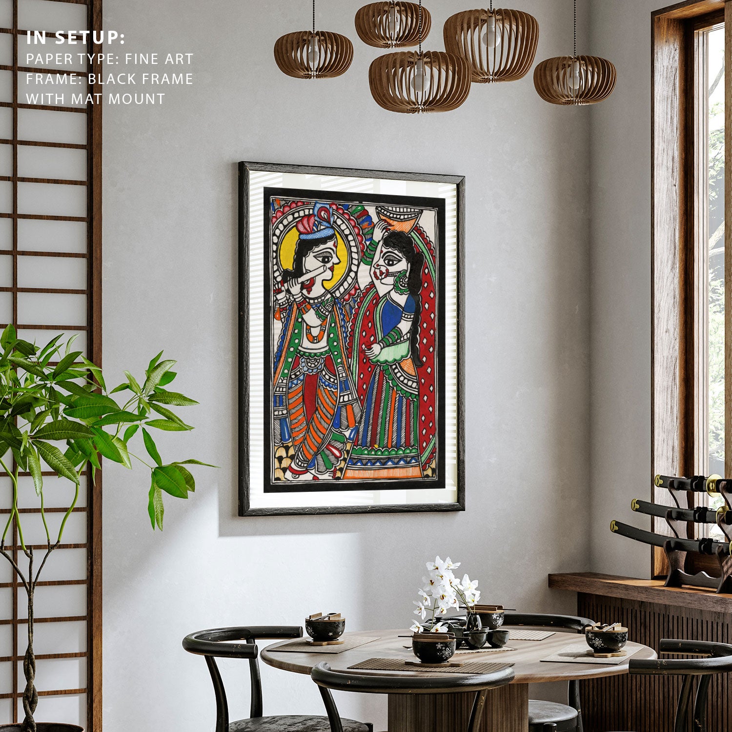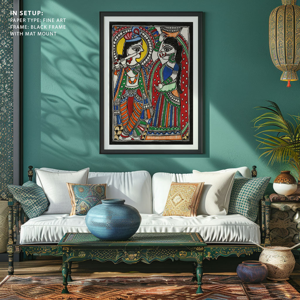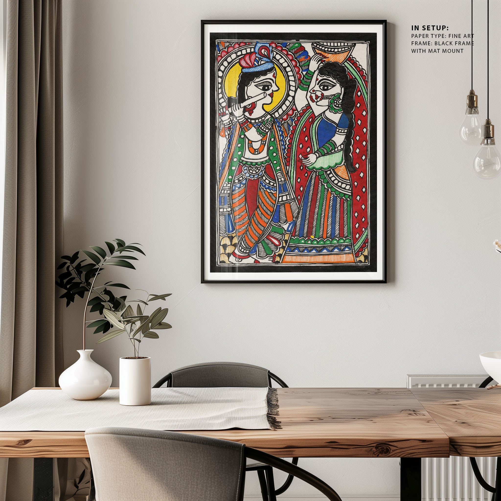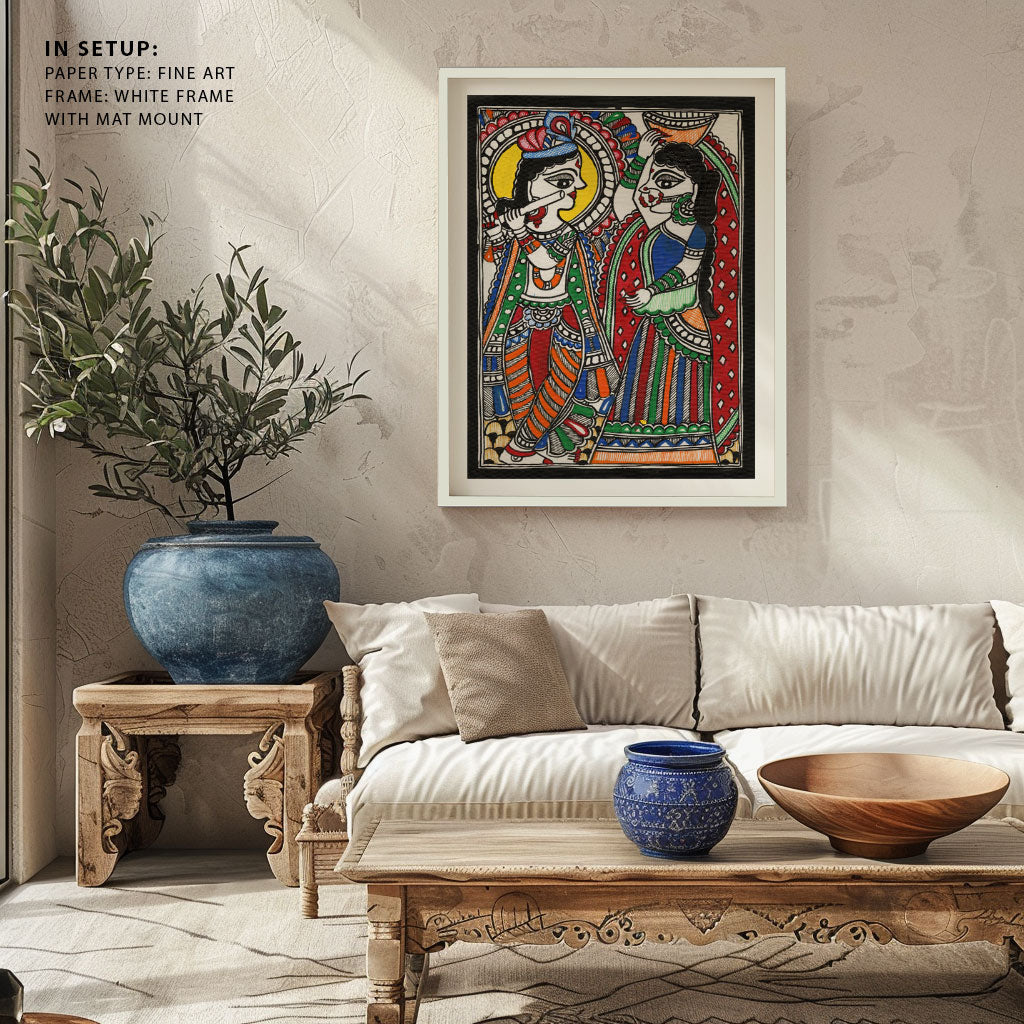 Madhubani Art Traditional Radha Krishna from the Madhubani Paintings Collection is produced on Premium Museum Grade Canvas and Hahnemuhle Fine Art Media. This beautiful Madhubani Painting Art Print product is made with a matte finish and premium quality with vibrant colors. These Madhubani Miniature Paintings Art Prints are produced with the most extreme shading precision and using the most advanced giclee printing technique in the world. We use the same standard that the various museums and art galleries use across the globe to recreate the Madhubani Miniature Paintings Art Prints. These Madhubani Paintings are perfect for you if you're a Madhubani or Indian Culture Lover or if you want to add a Traditional Look to your space. The vibrancy of colors and the unique detailing of every Madhubani Painting Art Print makes them the best in so many ways. This Madhubani Art Print will add charm to any room in your home. These Madhubani Painting Art Prints can be the perfect gift to your friends, colleagues, or family as they sync in very well in your Bedroom, living room, lobby, Balcony, Bathroom, etc.