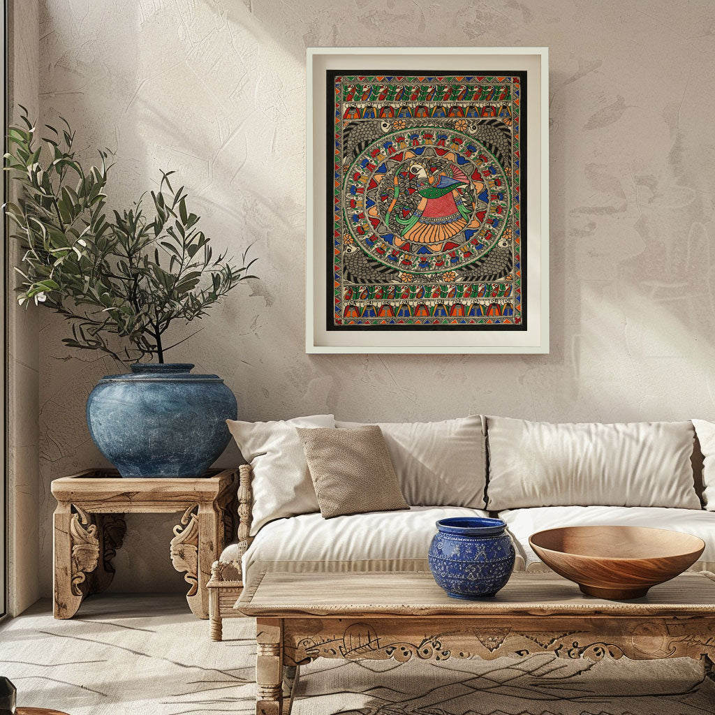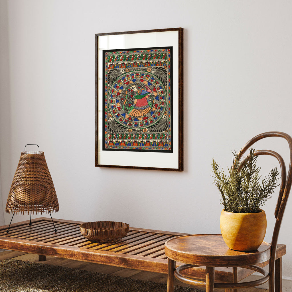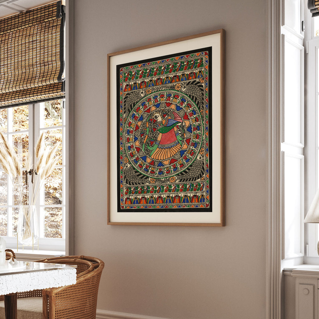Madhubani Peacock Art from the Madhubani Paintings Collection is produced on Premium Museum Grade Canvas and Hahnemuhle Fine Art Media. This beautiful Madhubani Painting Art Print product is made with a matte finish and premium quality with vibrant colors. These Madhubani Miniature Paintings Art Prints are produced with the most extreme shading precision and using the most advanced giclee printing technique in the world. We use the same standard that the various museums and art galleries use across the globe to recreate the Madhubani Miniature Paintings Art Prints. These Madhubani Paintings are perfect for you if you're a Madhubani or Indian Culture Lover or if you want to add a Traditional Look to your space. The vibrancy of colors and the unique detailing of every Madhubani Painting Art Print makes them the best in so many ways. This Madhubani Art Print will add charm to any room in your home. These Madhubani Painting Art Prints can be the perfect gift to your friends, colleagues, or family as they sync in very well in your Bedroom, living room, lobby, Balcony, Bathroom, etc.