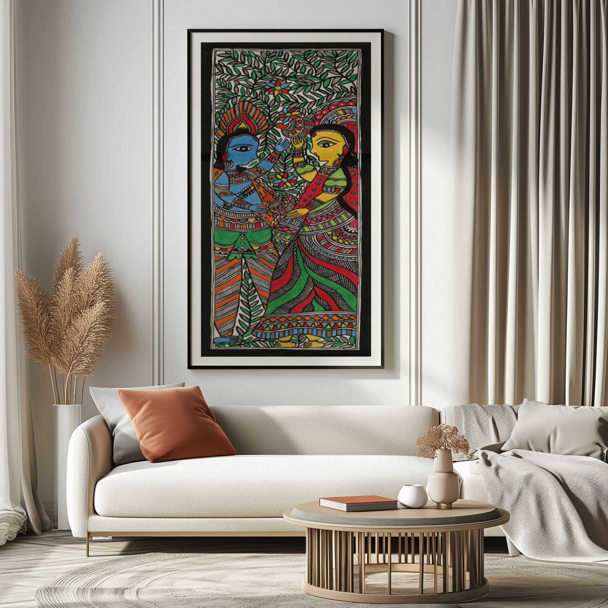 Radha Krishna Mithila Madhubani Art from the Madhubani Paintings Collection is produced on Premium Museum Grade Canvas and Hahnemuhle Fine Art Media. This beautiful Madhubani Painting Art Print product is made with a matte finish and premium quality with vibrant colors. These Madhubani Miniature Paintings Art Prints are produced with the most extreme shading precision and using the most advanced giclee printing technique in the world. We use the same standard that the various museums and art galleries use across the globe to recreate the Madhubani Miniature Paintings Art Prints. These Madhubani Paintings are perfect for you if you're a Madhubani or Indian Culture Lover or if you want to add a Traditional Look to your space. The vibrancy of colors and the unique detailing of every Madhubani Painting Art Print makes them the best in so many ways. This Madhubani Art Print will add charm to any room in your home. These Madhubani Painting Art Prints can be the perfect gift to your friends, colleagues, or family as they sync in very well in your Bedroom, living room, lobby, Balcony, Bathroom, etc.