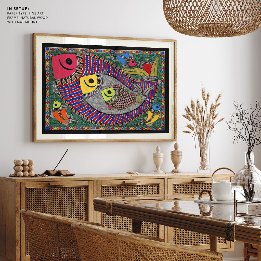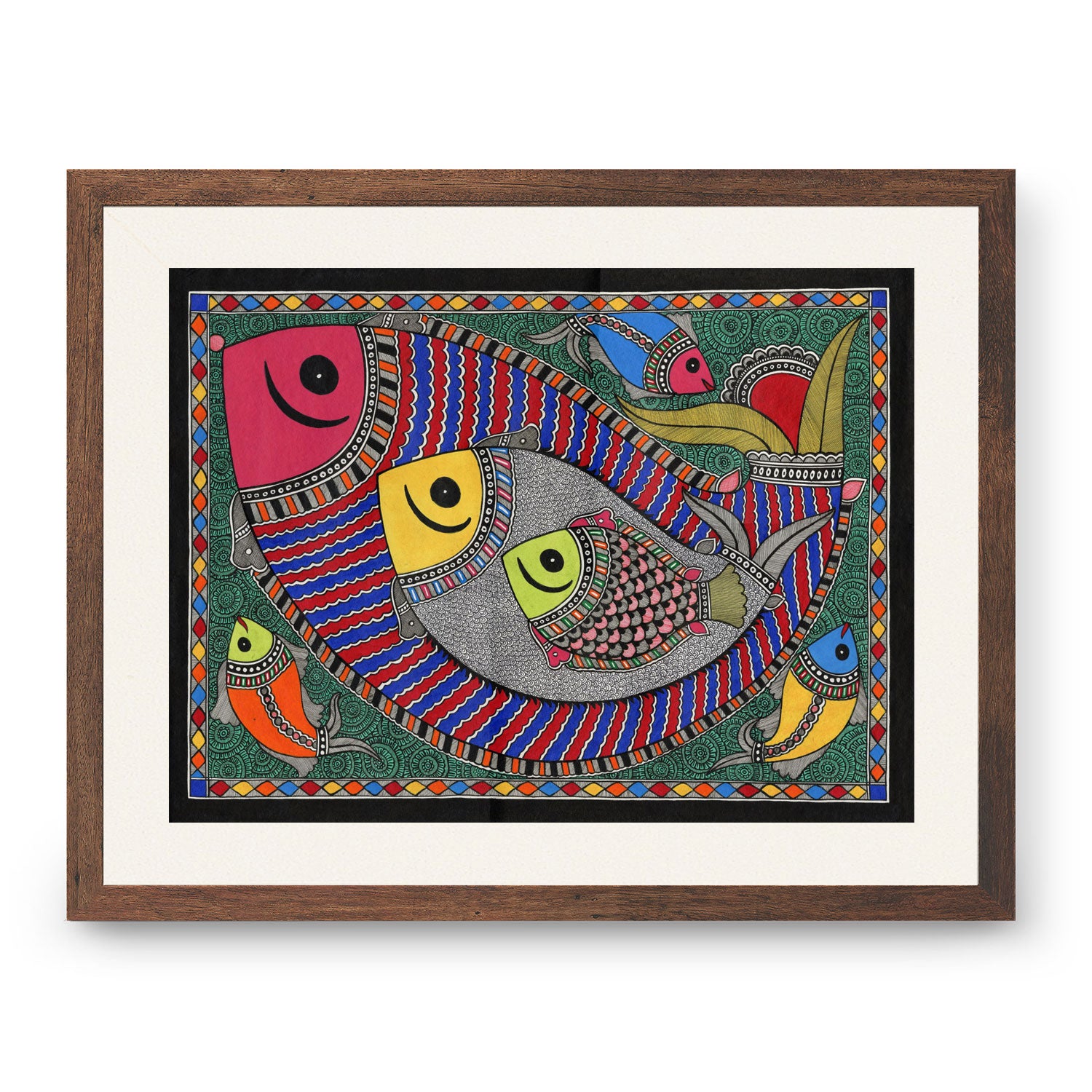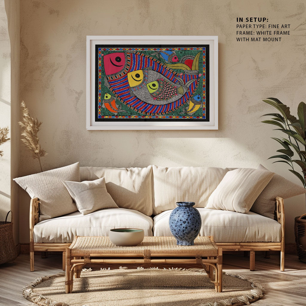 Tradition Painting Colorful Fish Madhubani Art  from the Madhubani Paintings Collection is produced on Premium Museum Grade Canvas and Hahnemuhle Fine Art Media. This beautiful Madhubani Painting Art Print product is made with a matte finish and premium quality with vibrant colors. These Madhubani Miniature Paintings Art Prints are produced with the most extreme shading precision and using the most advanced giclee printing technique in the world. We use the same standard that the various museums and art galleries use across the globe to recreate the Madhubani Miniature Paintings Art Prints. These Madhubani Paintings are perfect for you if you're a Madhubani or Indian Culture Lover or if you want to add a Traditional Look to your space. The vibrancy of colors and the unique detailing of every Madhubani Painting Art Print makes them the best in so many ways. This Madhubani Art Print will add charm to any room in your home. These Madhubani Painting Art Prints can be the perfect gift to your friends, colleagues, or family as they sync in very well in your Bedroom, living room, lobby, Balcony, Bathroom, etc.