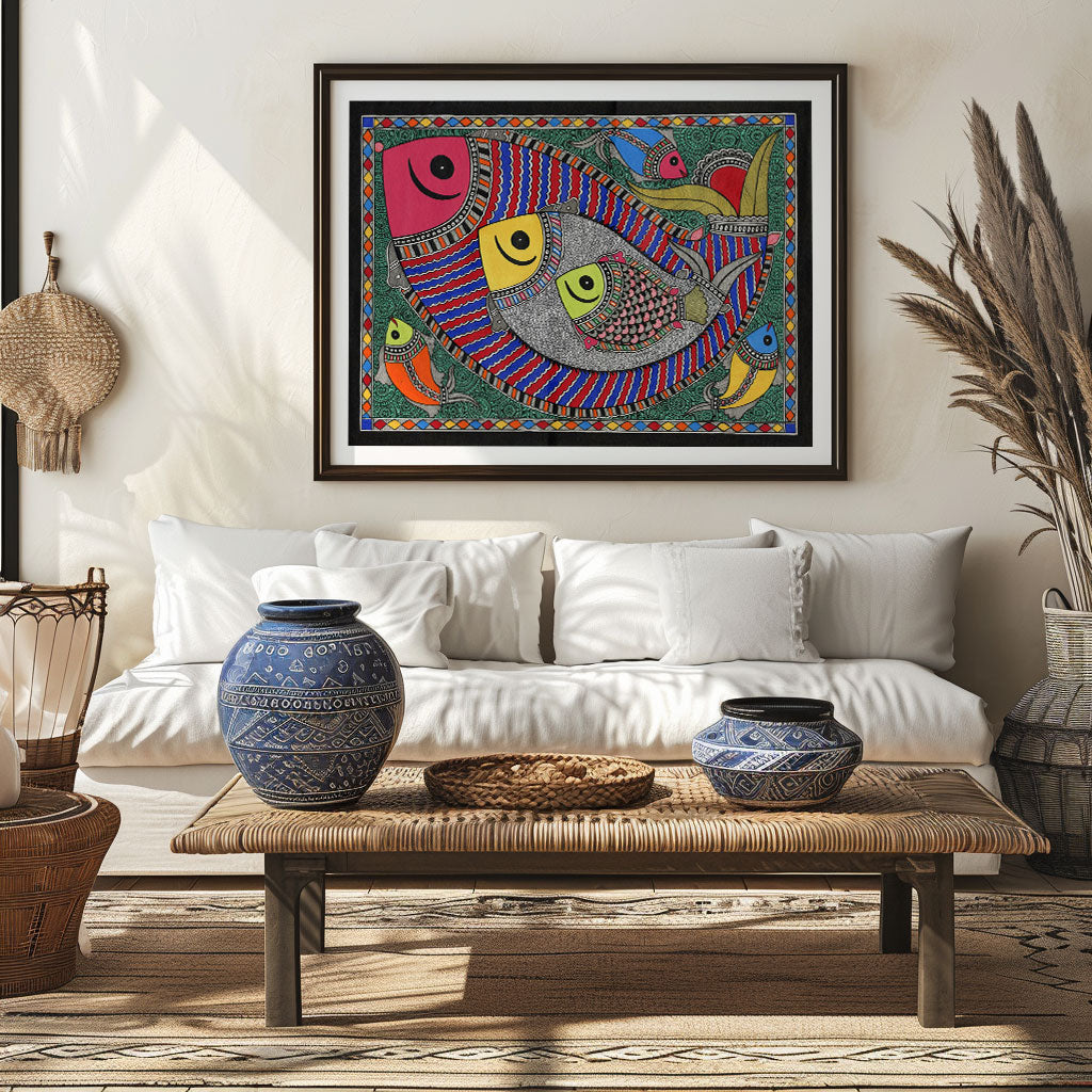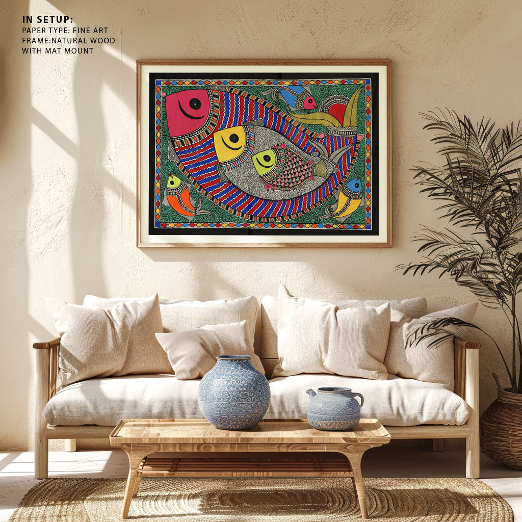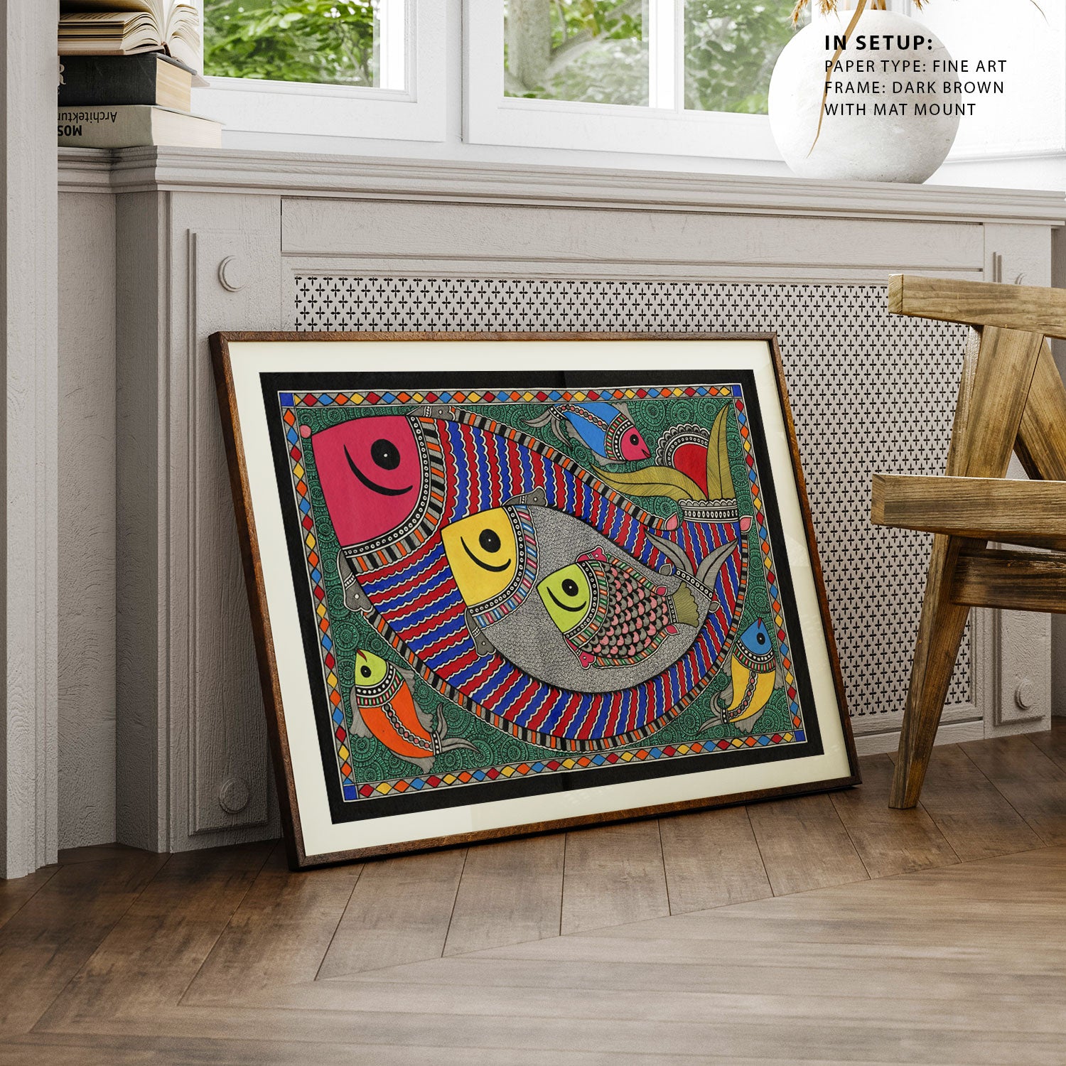 Tradition Painting Colorful Fish Madhubani Art  from the Madhubani Paintings Collection is produced on Premium Museum Grade Canvas and Hahnemuhle Fine Art Media. This beautiful Madhubani Painting Art Print product is made with a matte finish and premium quality with vibrant colors. These Madhubani Miniature Paintings Art Prints are produced with the most extreme shading precision and using the most advanced giclee printing technique in the world. We use the same standard that the various museums and art galleries use across the globe to recreate the Madhubani Miniature Paintings Art Prints. These Madhubani Paintings are perfect for you if you're a Madhubani or Indian Culture Lover or if you want to add a Traditional Look to your space. The vibrancy of colors and the unique detailing of every Madhubani Painting Art Print makes them the best in so many ways. This Madhubani Art Print will add charm to any room in your home. These Madhubani Painting Art Prints can be the perfect gift to your friends, colleagues, or family as they sync in very well in your Bedroom, living room, lobby, Balcony, Bathroom, etc.