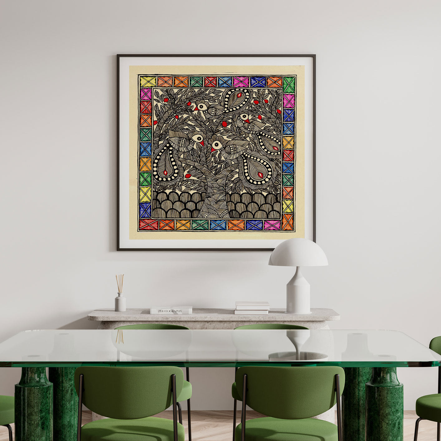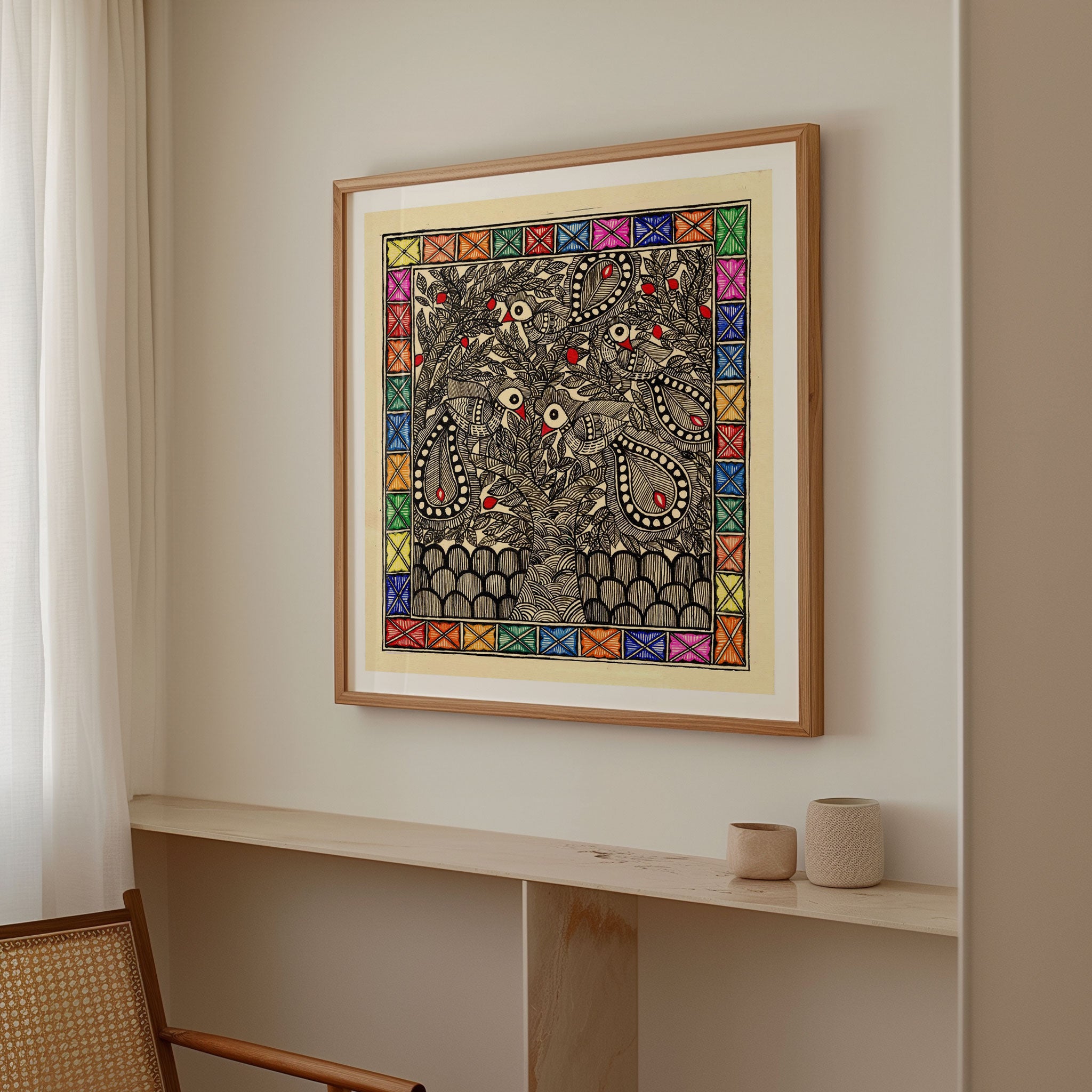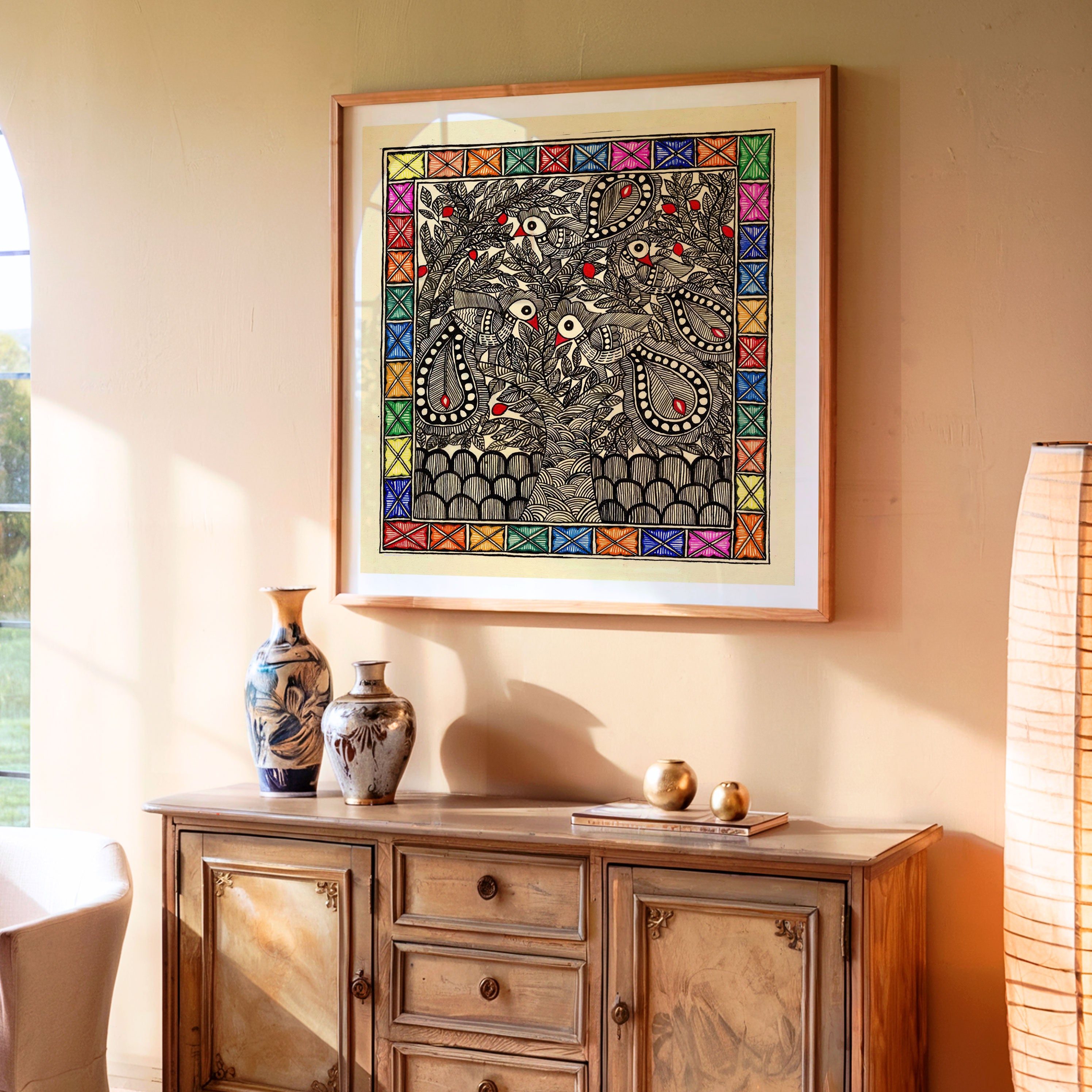 Traditional Peacock Madhubani Art from the Madhubani Paintings Collection is produced on Premium Museum Grade Canvas and Hahnemuhle Fine Art Media. This beautiful Madhubani Painting Art Print product is made with a matte finish and premium quality with vibrant colors. These Madhubani Miniature Paintings Art Prints are produced with the most extreme shading precision and using the most advanced giclee printing technique in the world. We use the same standard that the various museums and art galleries use across the globe to recreate the Madhubani Miniature Paintings Art Prints. These Madhubani Paintings are perfect for you if you're a Madhubani or Indian Culture Lover or if you want to add a Traditional Look to your space. The vibrancy of colors and the unique detailing of every Madhubani Painting Art Print makes them the best in so many ways. This Madhubani Art Print will add charm to any room in your home. These Madhubani Painting Art Prints can be the perfect gift to your friends, colleagues, or family as they sync in very well in your Bedroom, living room, lobby, Balcony, Bathroom, etc.