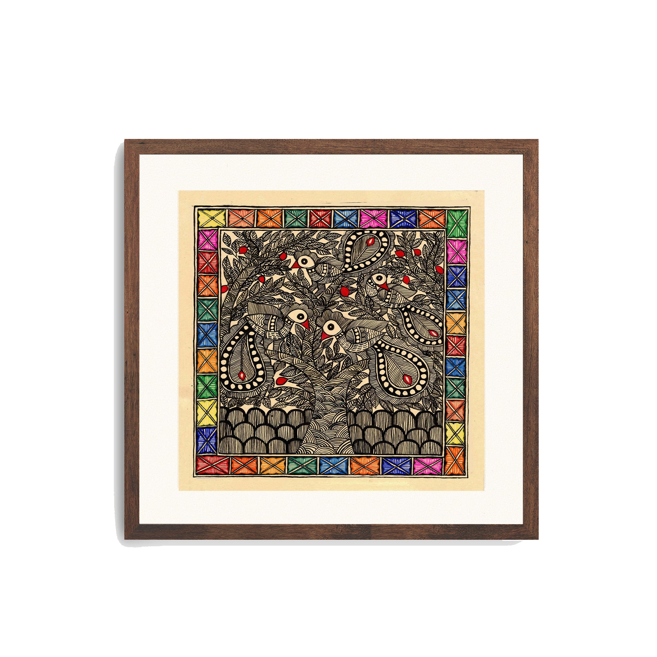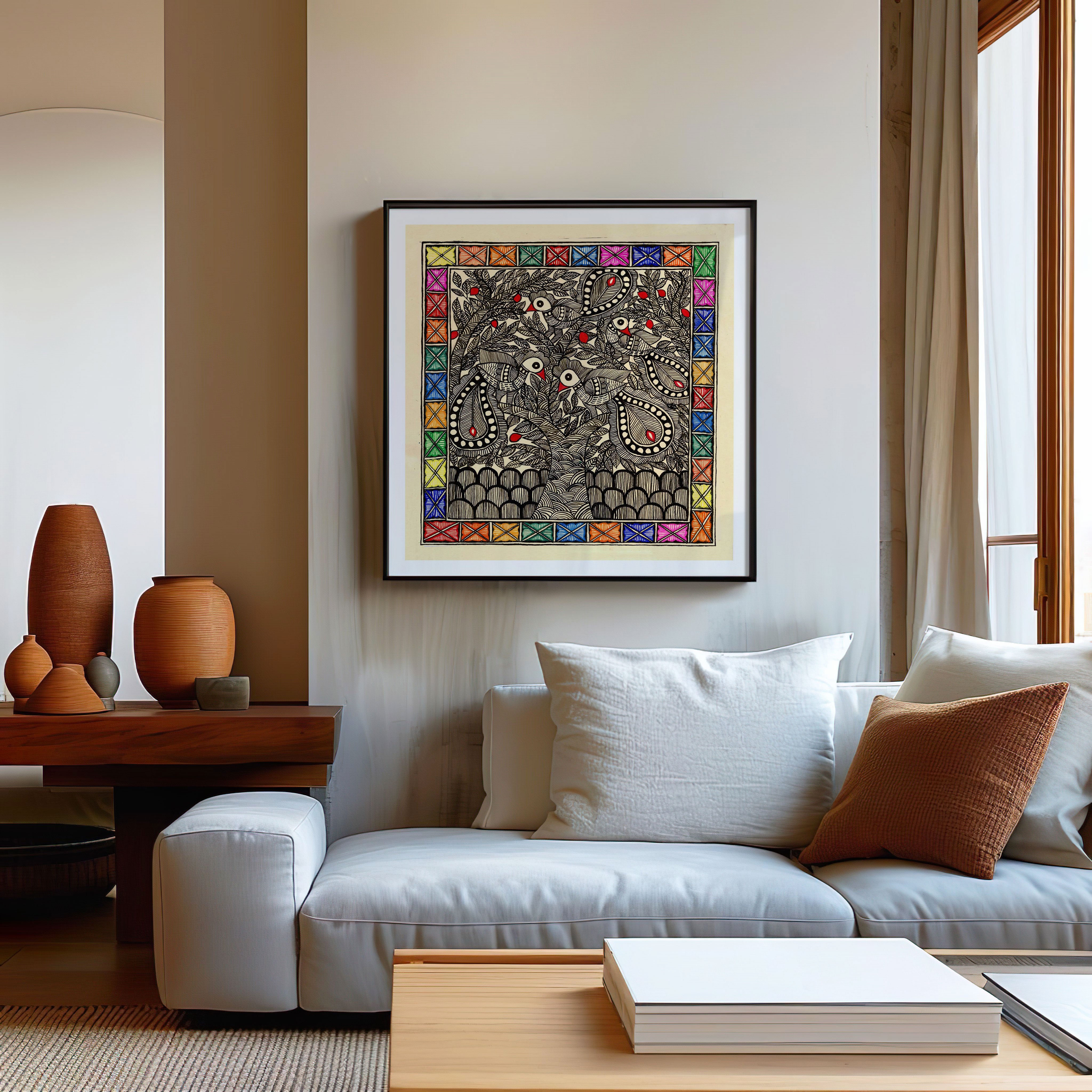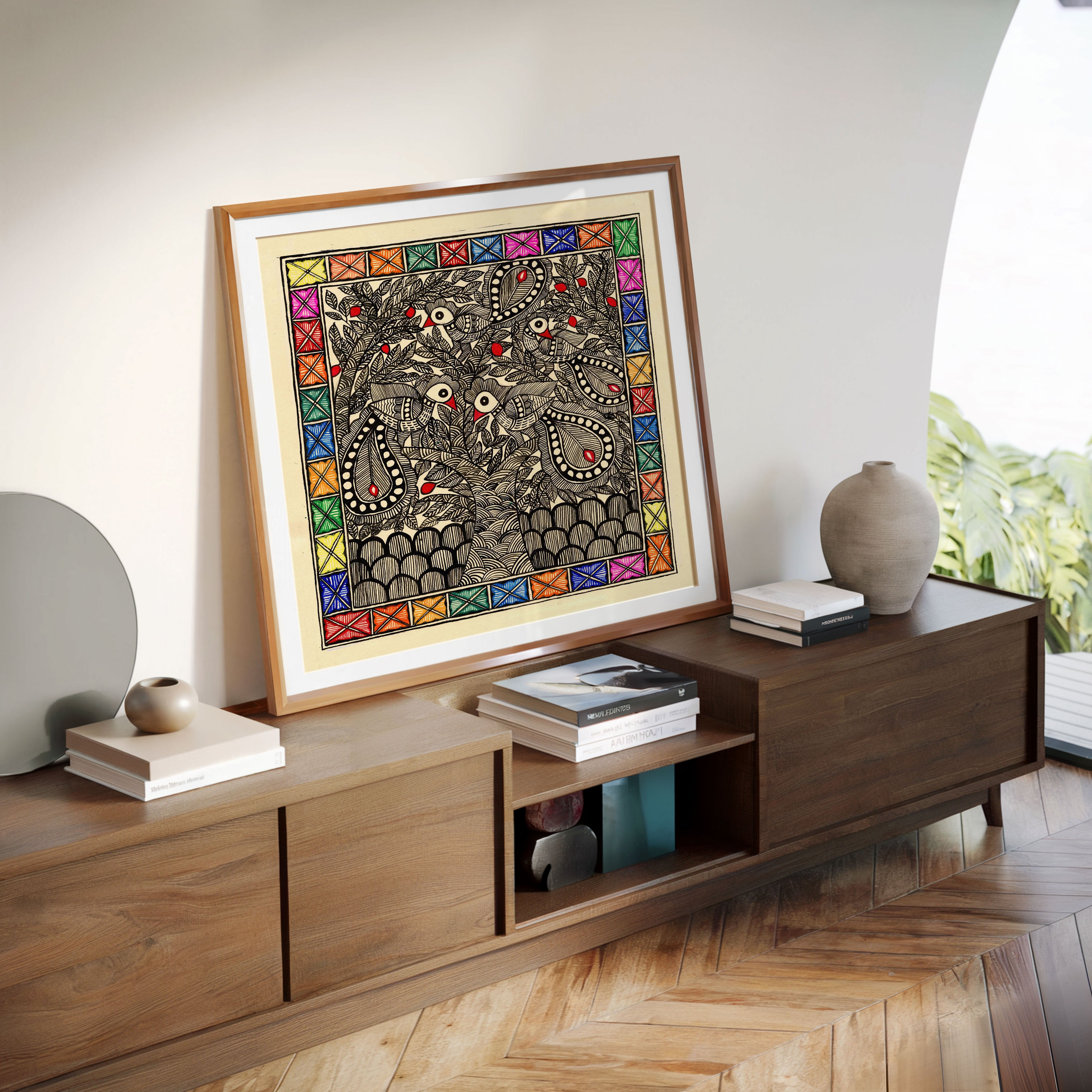 Traditional Peacock Madhubani Art from the Madhubani Paintings Collection is produced on Premium Museum Grade Canvas and Hahnemuhle Fine Art Media. This beautiful Madhubani Painting Art Print product is made with a matte finish and premium quality with vibrant colors. These Madhubani Miniature Paintings Art Prints are produced with the most extreme shading precision and using the most advanced giclee printing technique in the world. We use the same standard that the various museums and art galleries use across the globe to recreate the Madhubani Miniature Paintings Art Prints. These Madhubani Paintings are perfect for you if you're a Madhubani or Indian Culture Lover or if you want to add a Traditional Look to your space. The vibrancy of colors and the unique detailing of every Madhubani Painting Art Print makes them the best in so many ways. This Madhubani Art Print will add charm to any room in your home. These Madhubani Painting Art Prints can be the perfect gift to your friends, colleagues, or family as they sync in very well in your Bedroom, living room, lobby, Balcony, Bathroom, etc.