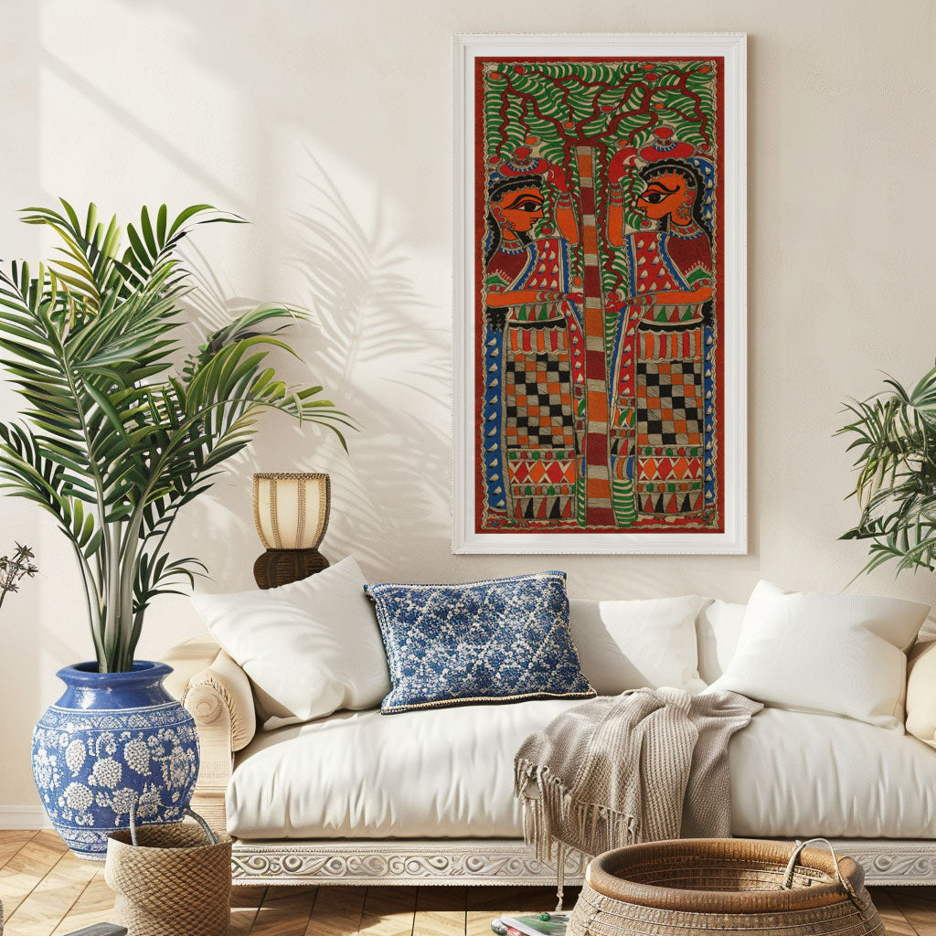 Village Women Carrying Water - Madhubani Art from the Madhubani Paintings Collection is produced on Premium Museum Grade Canvas and Hahnemuhle Fine Art Media. This beautiful Madhubani Painting Art Print product is made with a matte finish and premium quality with vibrant colors. These Madhubani Miniature Paintings Art Prints are produced with the most extreme shading precision and using the most advanced giclee printing technique in the world. We use the same standard that the various museums and art galleries use across the globe to recreate the Madhubani Miniature Paintings Art Prints. These Madhubani Paintings are perfect for you if you're a Madhubani or Indian Culture Lover or if you want to add a Traditional Look to your space. The vibrancy of colors and the unique detailing of every Madhubani Painting Art Print makes them the best in so many ways. This Madhubani Art Print will add charm to any room in your home. These Madhubani Painting Art Prints can be the perfect gift to your friends, colleagues, or family as they sync in very well in your Bedroom, living room, lobby, Balcony, Bathroom, etc.