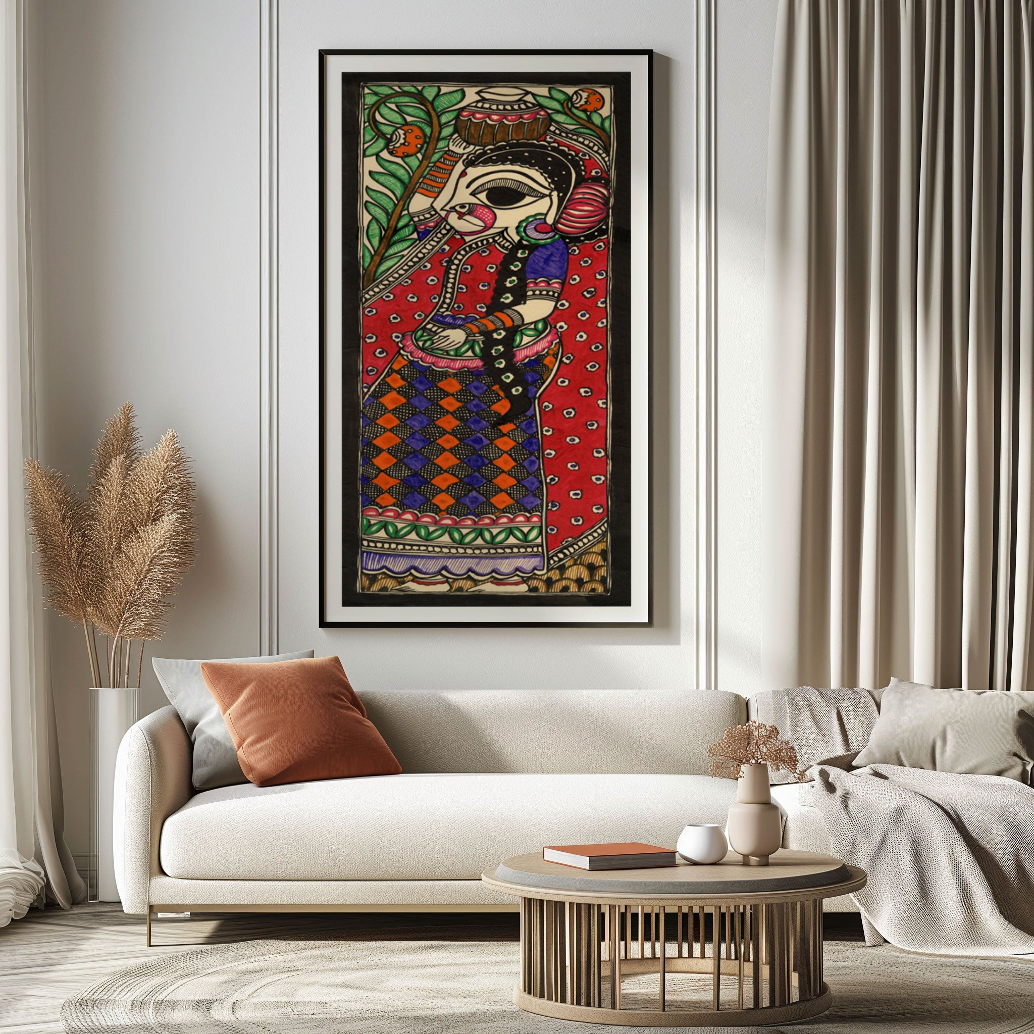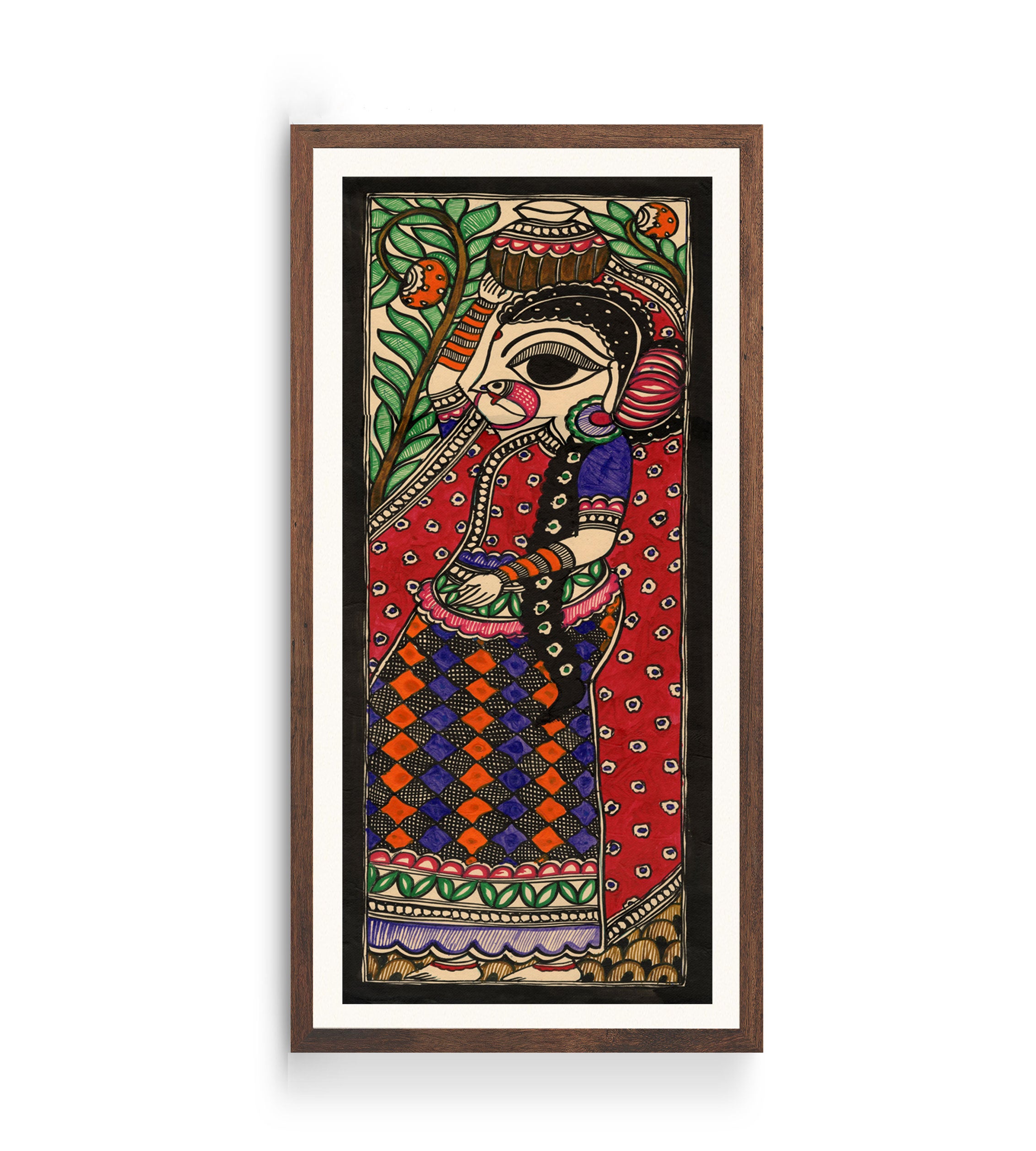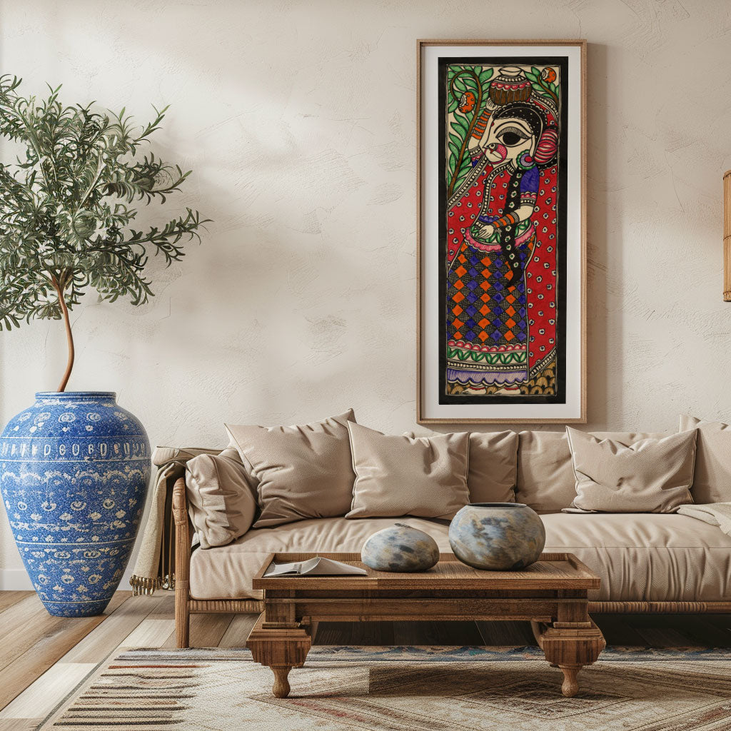 Woman with Water Pot - Madhubani Art from the Madhubani Paintings Collection is produced on Premium Museum Grade Canvas and Hahnemuhle Fine Art Media. This beautiful Madhubani Painting Art Print product is made with a matte finish and premium quality with vibrant colors. These Madhubani Miniature Paintings Art Prints are produced with the most extreme shading precision and using the most advanced giclee printing technique in the world. We use the same standard that the various museums and art galleries use across the globe to recreate the Madhubani Miniature Paintings Art Prints. These Madhubani Paintings are perfect for you if you're a Madhubani or Indian Culture Lover or if you want to add a Traditional Look to your space. The vibrancy of colors and the unique detailing of every Madhubani Painting Art Print makes them the best in so many ways. This Madhubani Art Print will add charm to any room in your home. These Madhubani Painting Art Prints can be the perfect gift to your friends, colleagues, or family as they sync in very well in your Bedroom, living room, lobby, Balcony, Bathroom, etc.