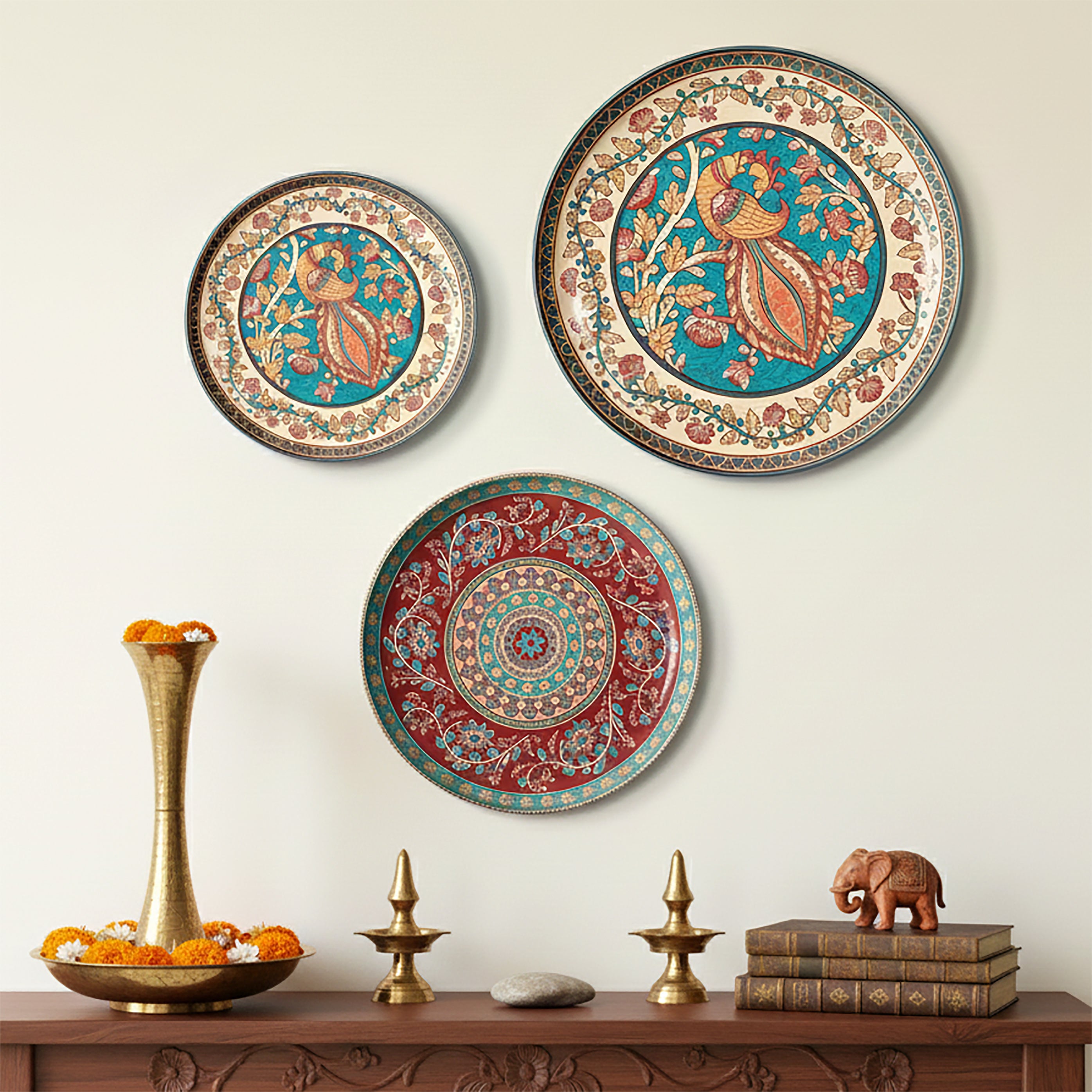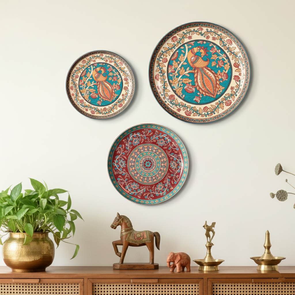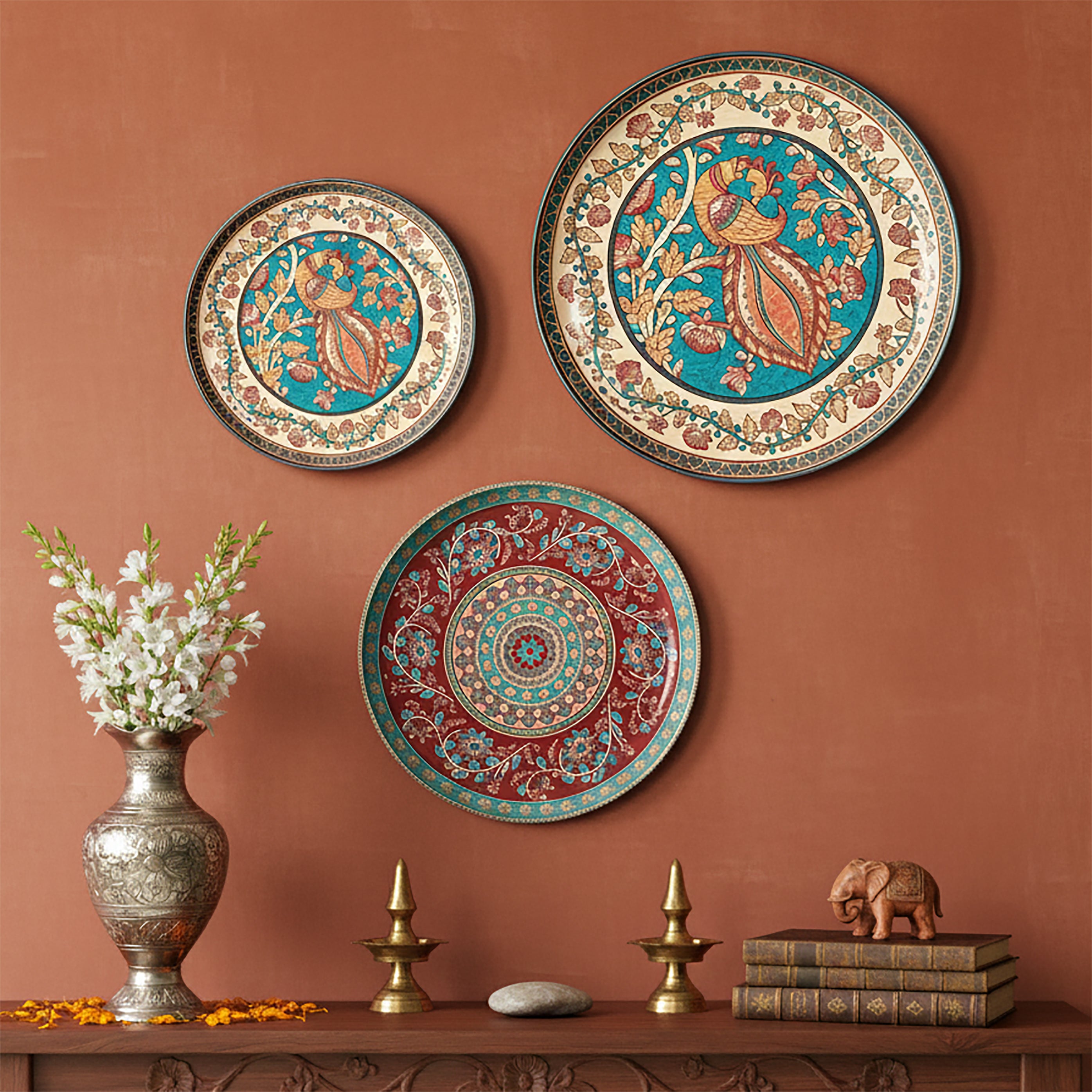 Madhubani Peacock Wall Decor Plate, Set of 3, Art Plate Set