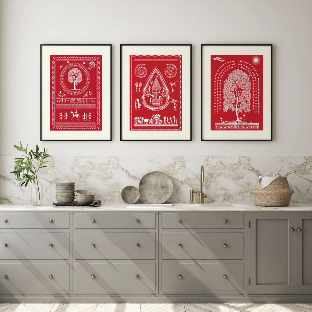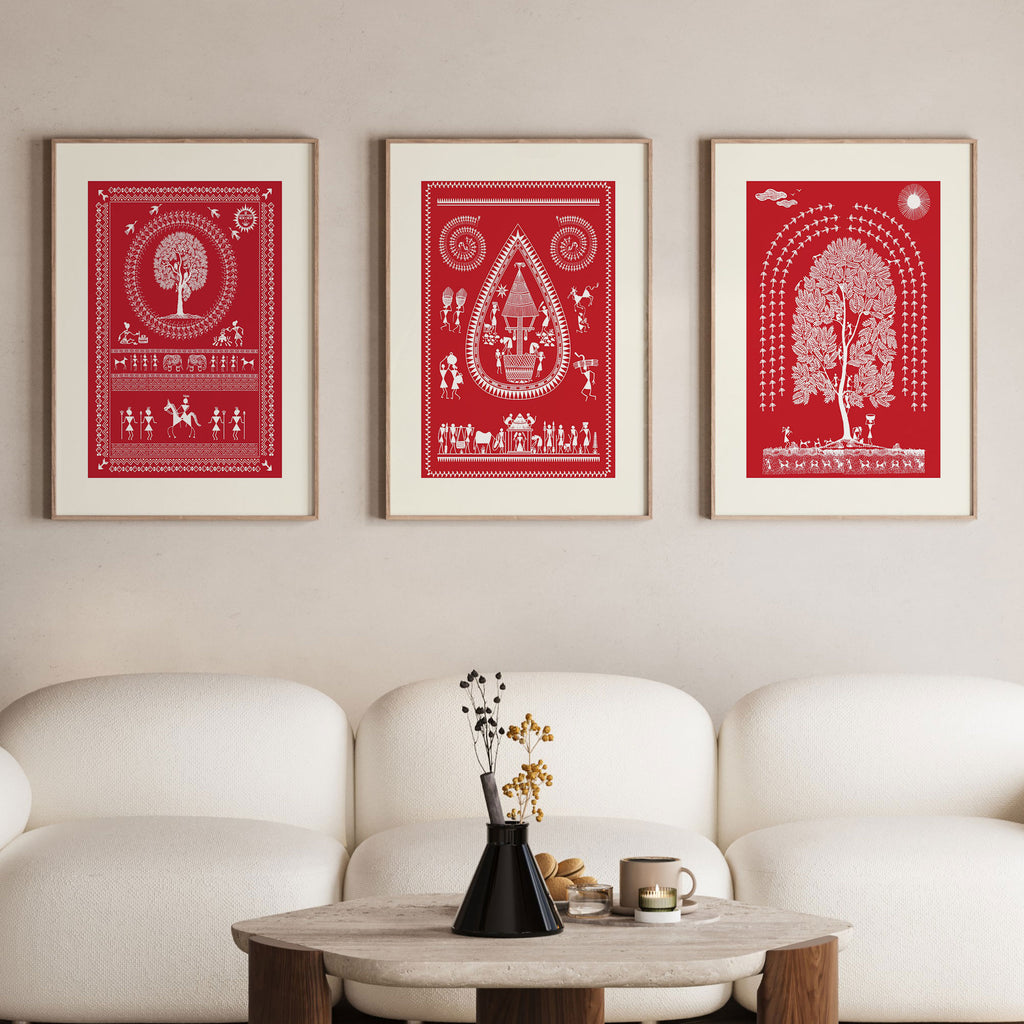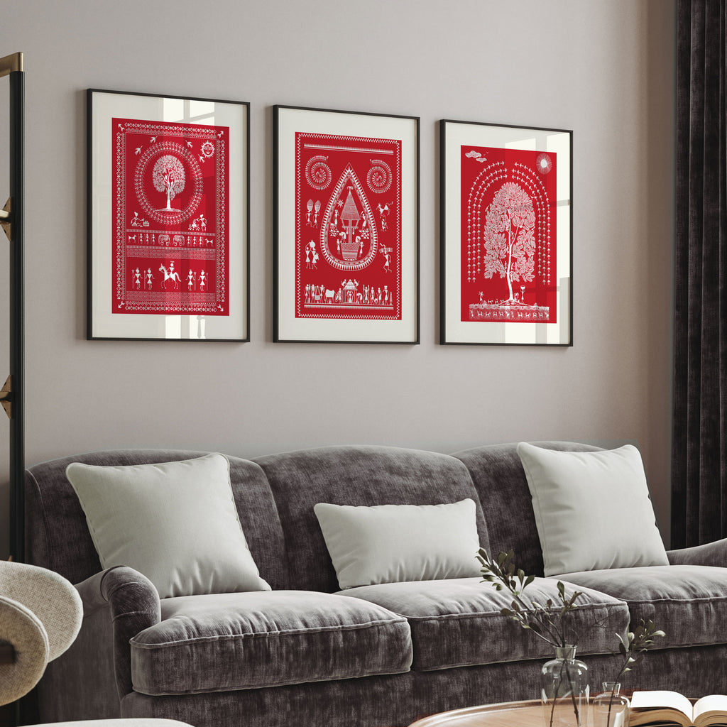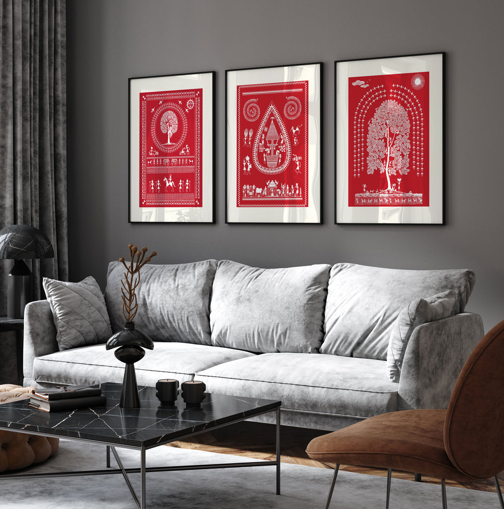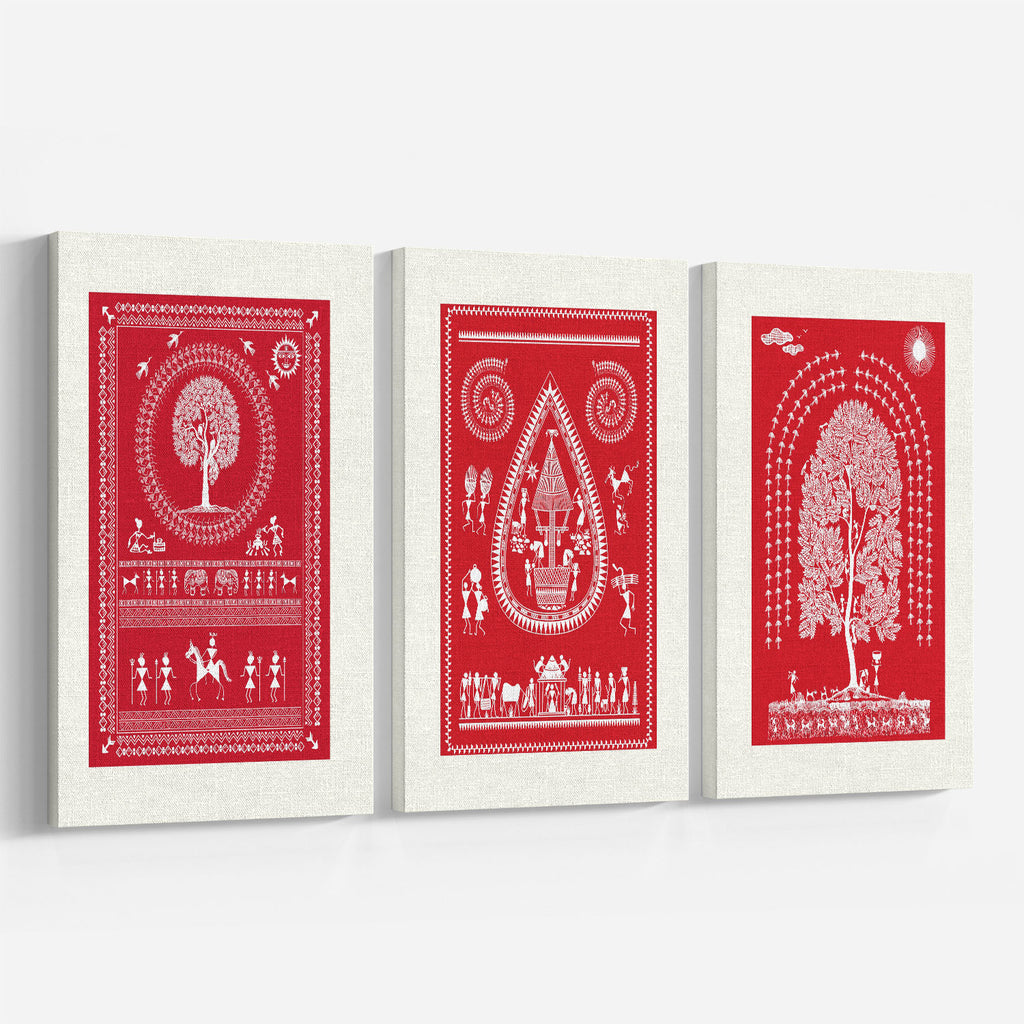 Set of 3 Warli Art Paintings Traditional Indian Wall Art. Collection is produced on Premium Museum Grade Canvas and Hahnemuhle Fine Art Media. This beauiful Set of 3 art product is made with matte finish and premium quality with vibrant colors. These Set of 3 paintings are produced with the most extreme shading precision and using the most advanced giclee printing technique in the world. We use the same standard that the various museums and art galleries use across the globe to recreate the art sets. These Modern Style Wall Art Sets are perfect for you if you're an Art Lover, Abstract Art Lover or if you want to add a Modern Look to your home. The vibrancy of colors and the unique detailing of every artwork makes them the best in so many ways. This Set of 3 art painting set will add charm to any room in your home. This art set can be the perfect gift to your friends, colleagues or family as they sync in very well in your Bedroom, living room, lobby, Balcony, Bathroom etc.