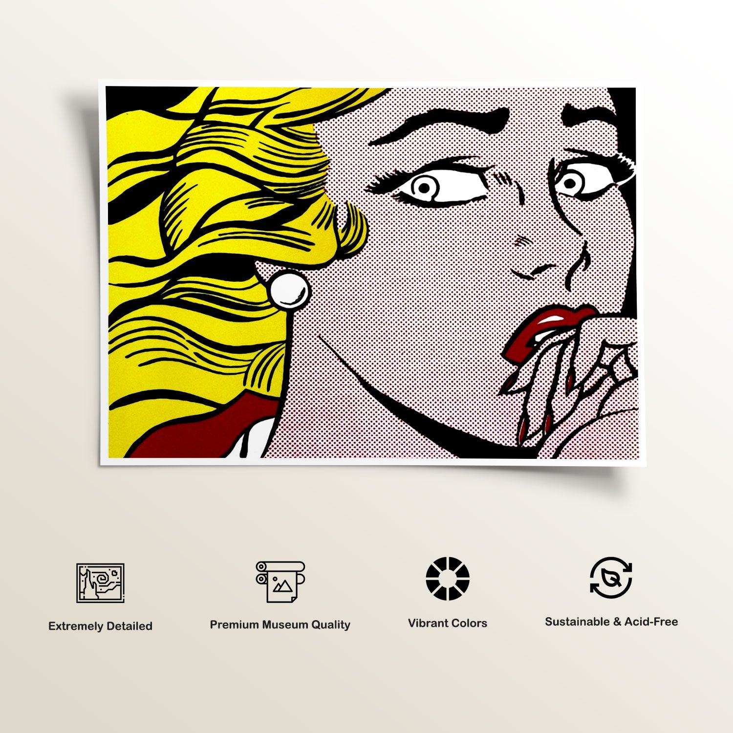 Crying Girl Roy Lichtenstein from the Pop Art Paintings Collection is produced on Premium Museum Grade Canvas and Hahnemuhle Fine Art Media. This product is made with matte finish and premium quality with vibrant colors. These Pop Art Paintings Prints are produced with the most extreme shading precision and using the most advanced giclee printing technique in the world. We use the same standard that the various museums and art galleries use across the globe to recreate the Pop Art Paintings Art Prints. These Pop Art Paintings are perfect for you if you're an Art Lover or if you want to add a Quirky, Contemporary or Cool Look to your space. The vibrancy of colors and the unique detailing of every Pop Art Painting Print makes them the best in so many ways. This Pop Art Painting Print will add quirk to any room in your home. This Pop Art Painting Artwork can be the perfect gift to your friends, colleagues or family as they sync in very well in your Bedroom, living room, lobby, Balcony, Bathroom etc.
