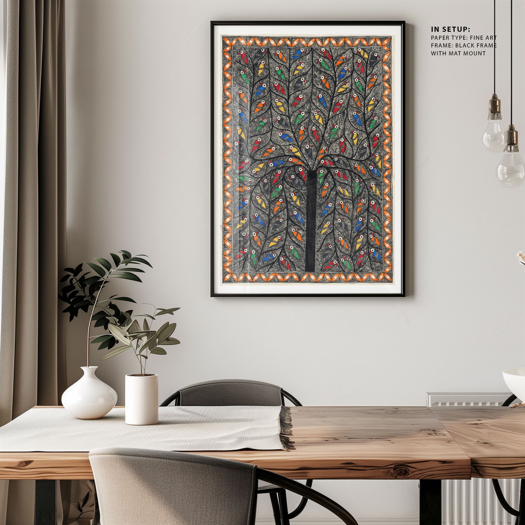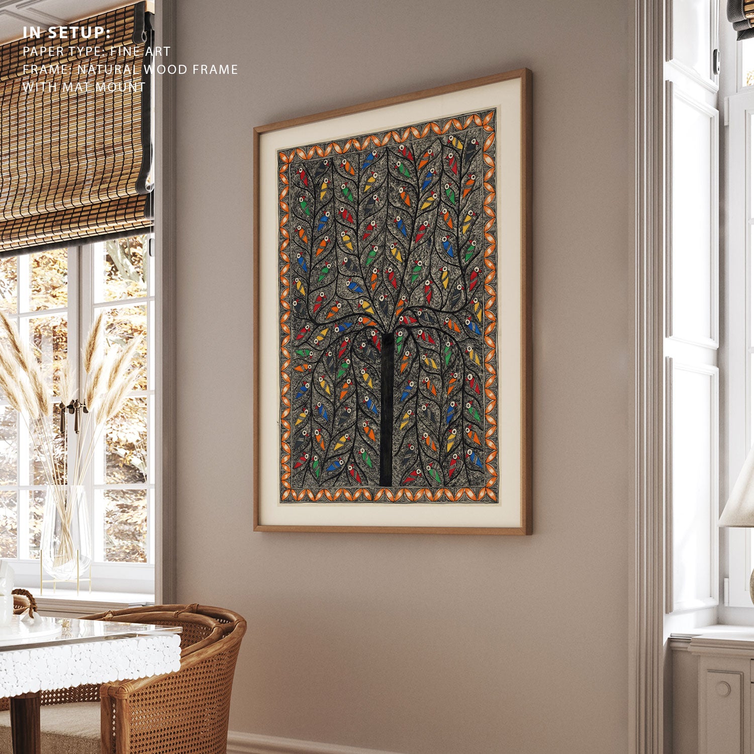 Madhubani Art Tree and Beautiful Birds Painting from the Madhubani Paintings Collection is produced on Premium Museum Grade Canvas and Hahnemuhle Fine Art Media. This beautiful Madhubani Painting Art Print product is made with a matte finish and premium quality with vibrant colors. These Madhubani Miniature Paintings Art Prints are produced with the most extreme shading precision and using the most advanced giclee printing technique in the world. We use the same standard that the various museums and art galleries use across the globe to recreate the Madhubani Miniature Paintings Art Prints. These Madhubani Paintings are perfect for you if you're a Madhubani or Indian Culture Lover or if you want to add a Traditional Look to your space. The vibrancy of colors and the unique detailing of every Madhubani Painting Art Print makes them the best in so many ways. This Madhubani Art Print will add charm to any room in your home. These Madhubani Painting Art Prints can be the perfect gift to your friends, colleagues, or family as they sync in very well in your Bedroom, living room, lobby, Balcony, Bathroom, etc.