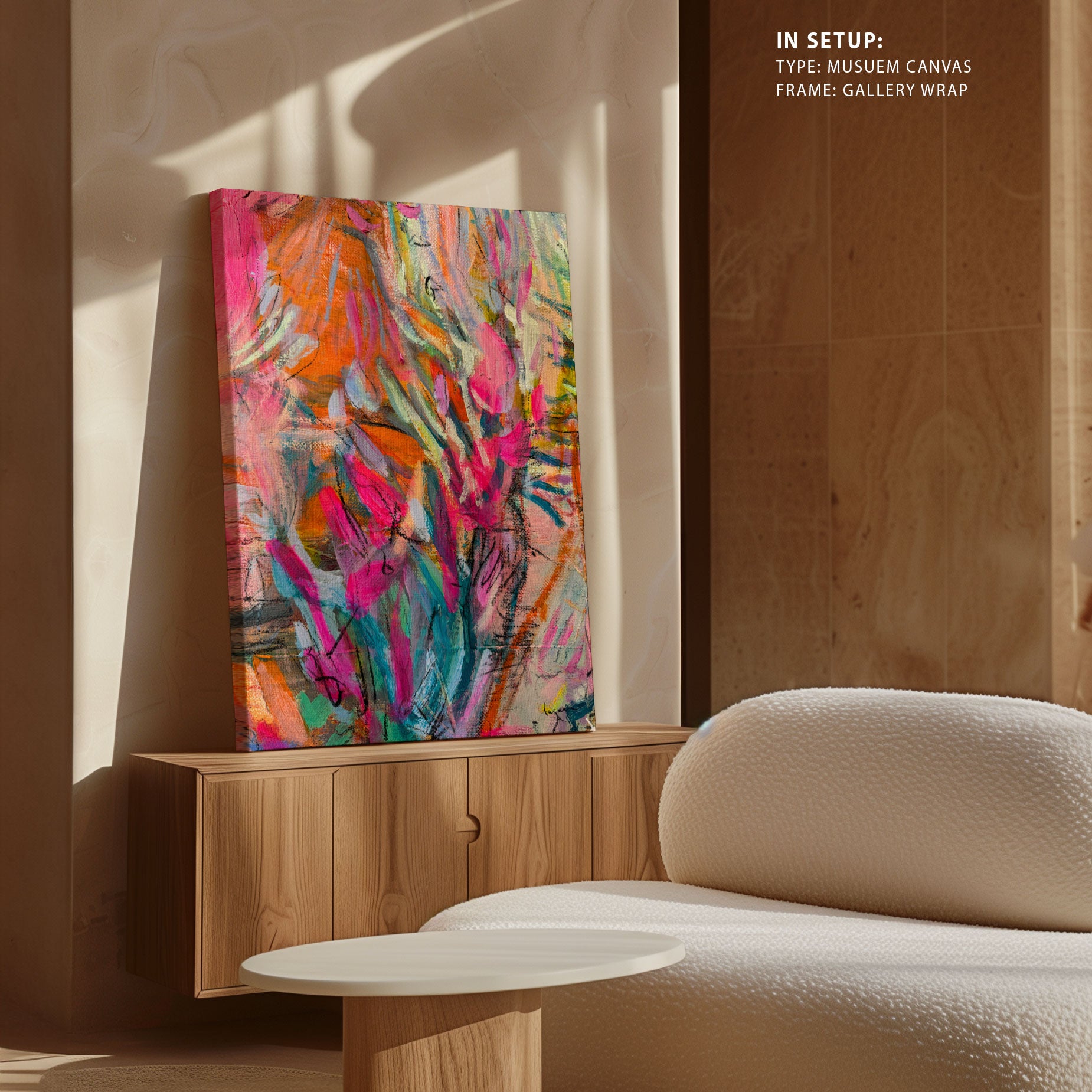 Museum Canvas Print is stretched on a wooden frame in such a way that it wraps around the sides of the stretcher. The sides of the canvas are prepared with white as natural white canvas for illustrations, pop-art and for Abstract, classical art canvas sides are stretched with the same painting as front of the canvas.