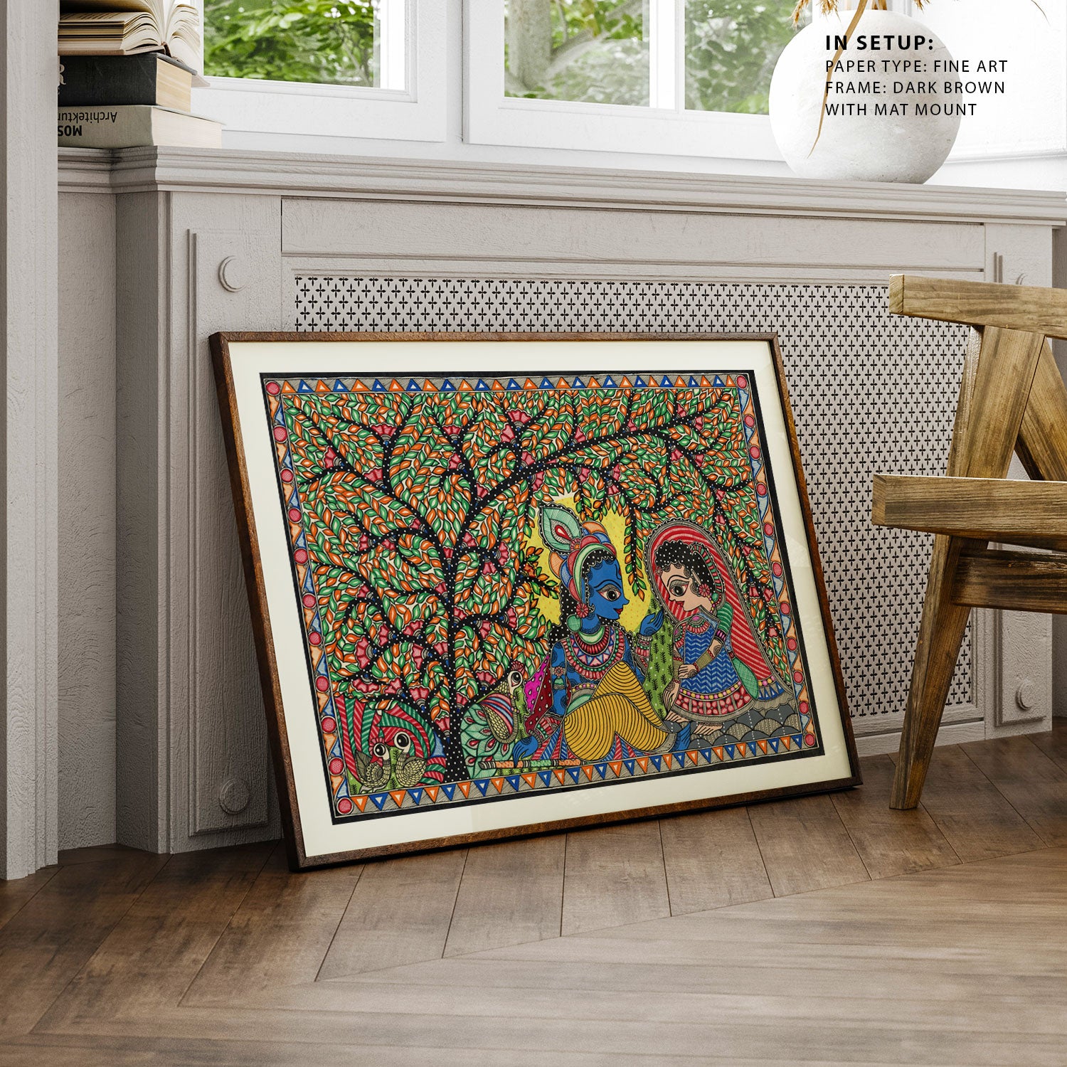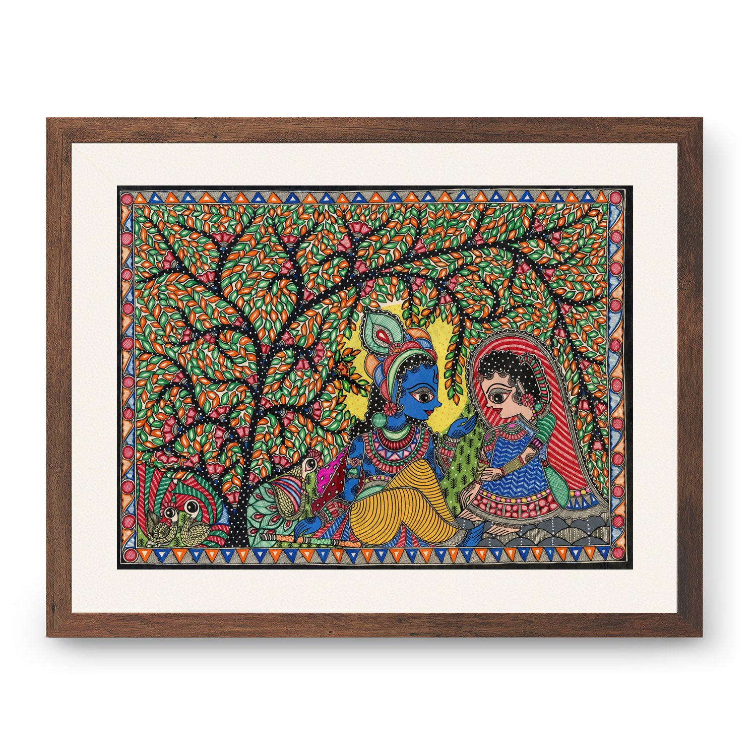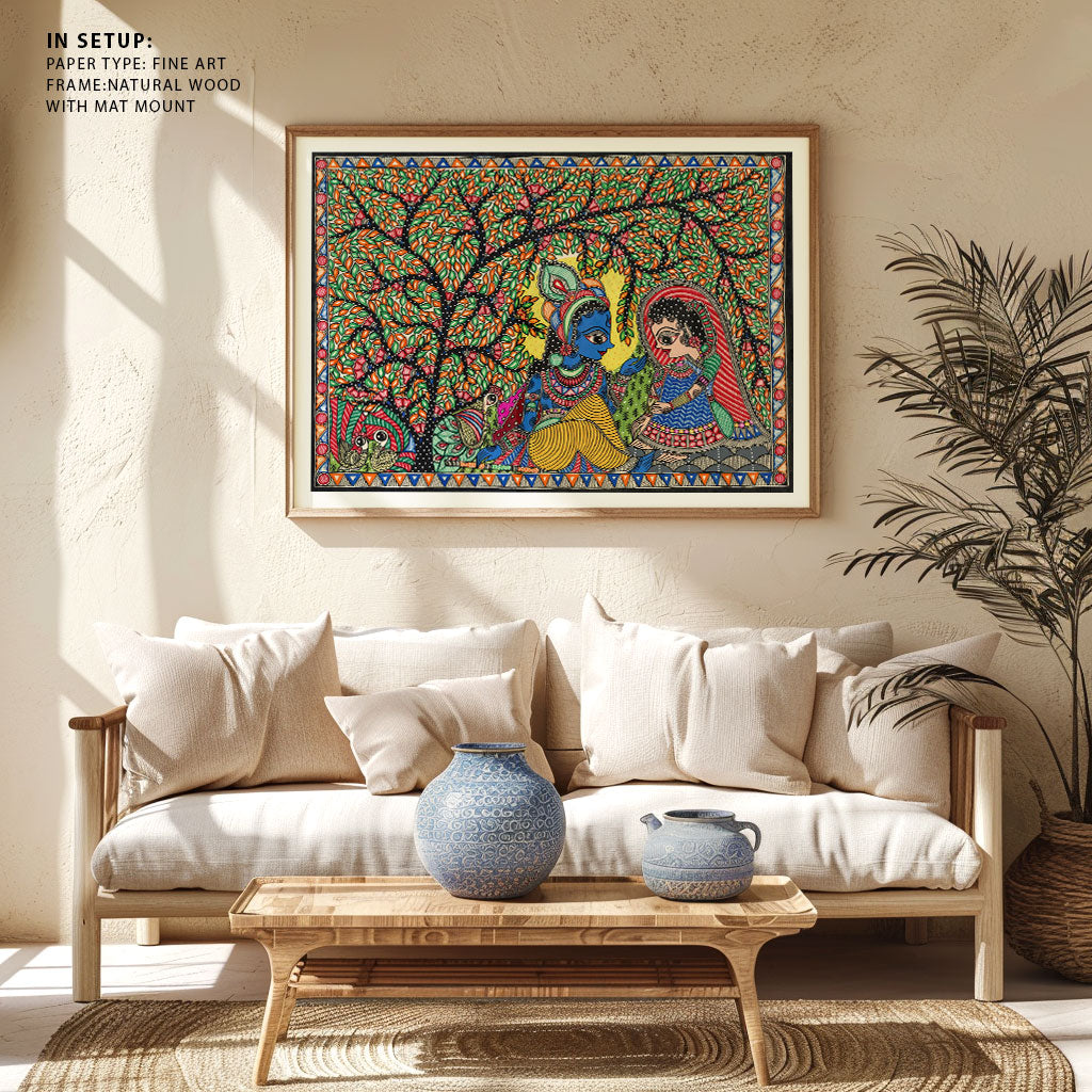 Radha Krishna Madhubani Art Mithila Painting from the Madhubani Paintings Collection is produced on Premium Museum Grade Canvas and Hahnemuhle Fine Art Media. This beautiful Madhubani Painting Art Print product is made with a matte finish and premium quality with vibrant colors. These Madhubani Miniature Paintings Art Prints are produced with the most extreme shading precision and using the most advanced giclee printing technique in the world. We use the same standard that the various museums and art galleries use across the globe to recreate the Madhubani Miniature Paintings Art Prints. These Madhubani Paintings are perfect for you if you're a Madhubani or Indian Culture Lover or if you want to add a Traditional Look to your space. The vibrancy of colors and the unique detailing of every Madhubani Painting Art Print makes them the best in so many ways. This Madhubani Art Print will add charm to any room in your home. These Madhubani Painting Art Prints can be the perfect gift to your friends, colleagues, or family as they sync in very well in your Bedroom, living room, lobby, Balcony, Bathroom, etc.