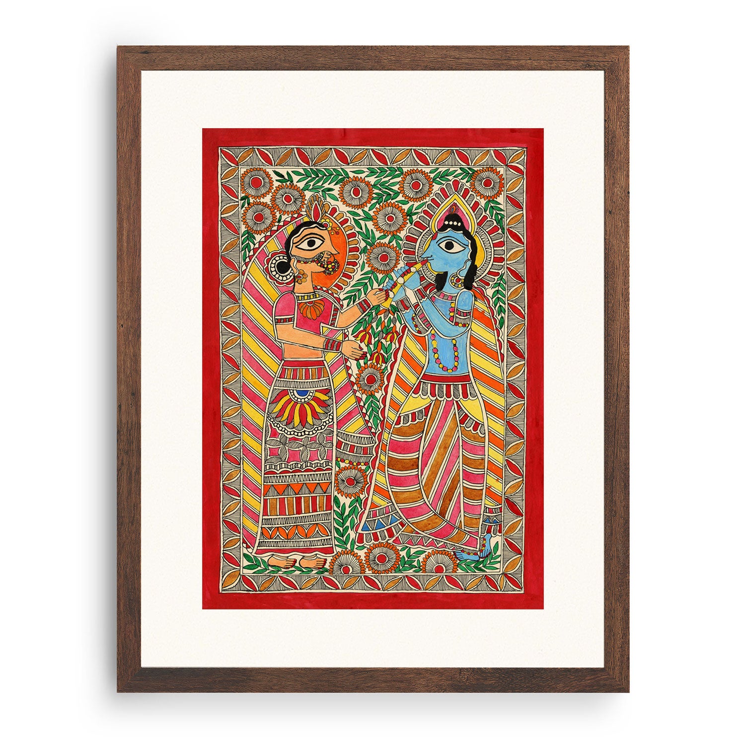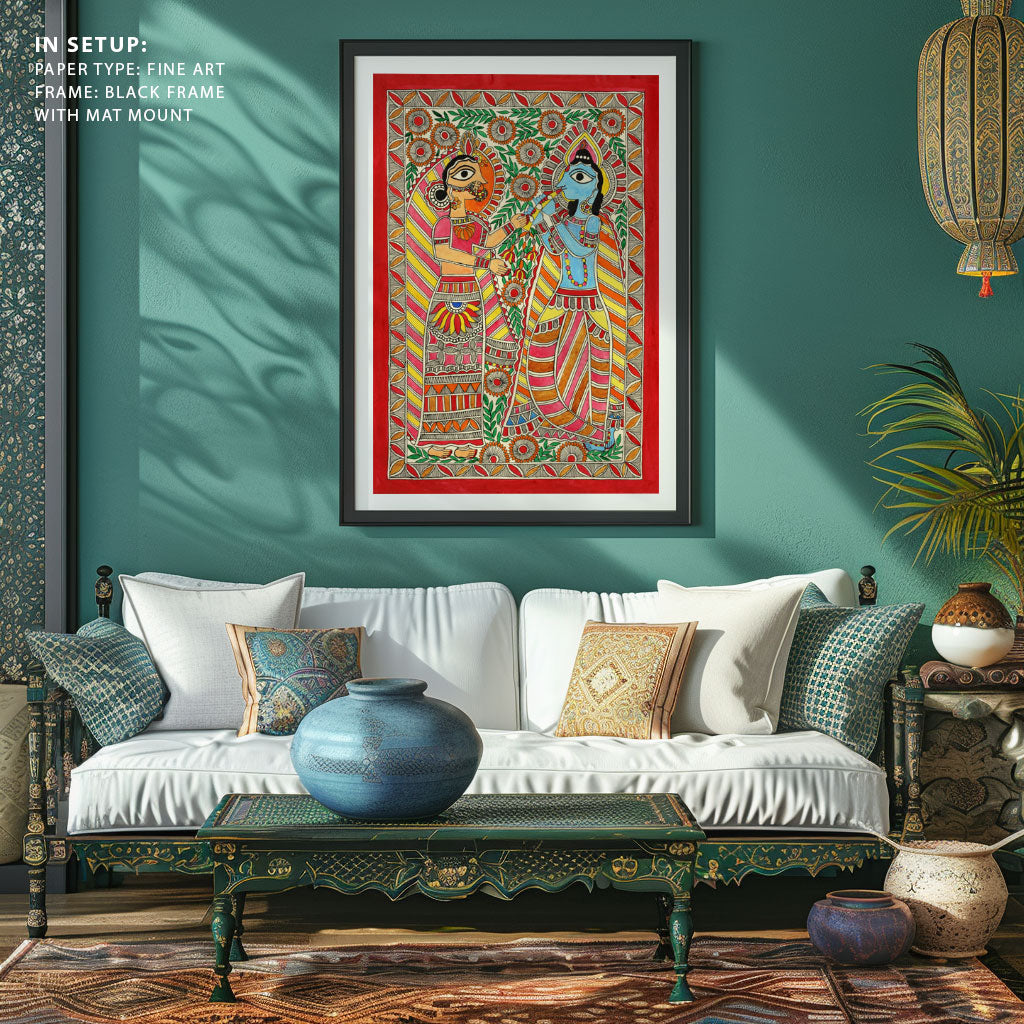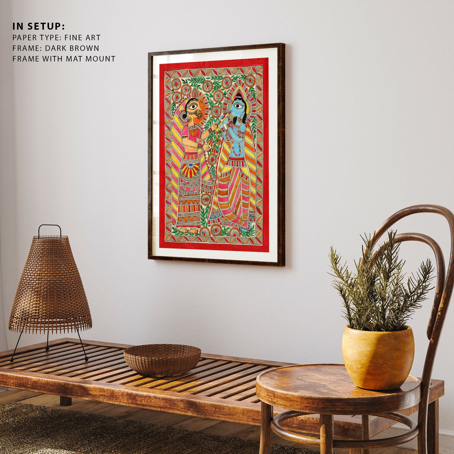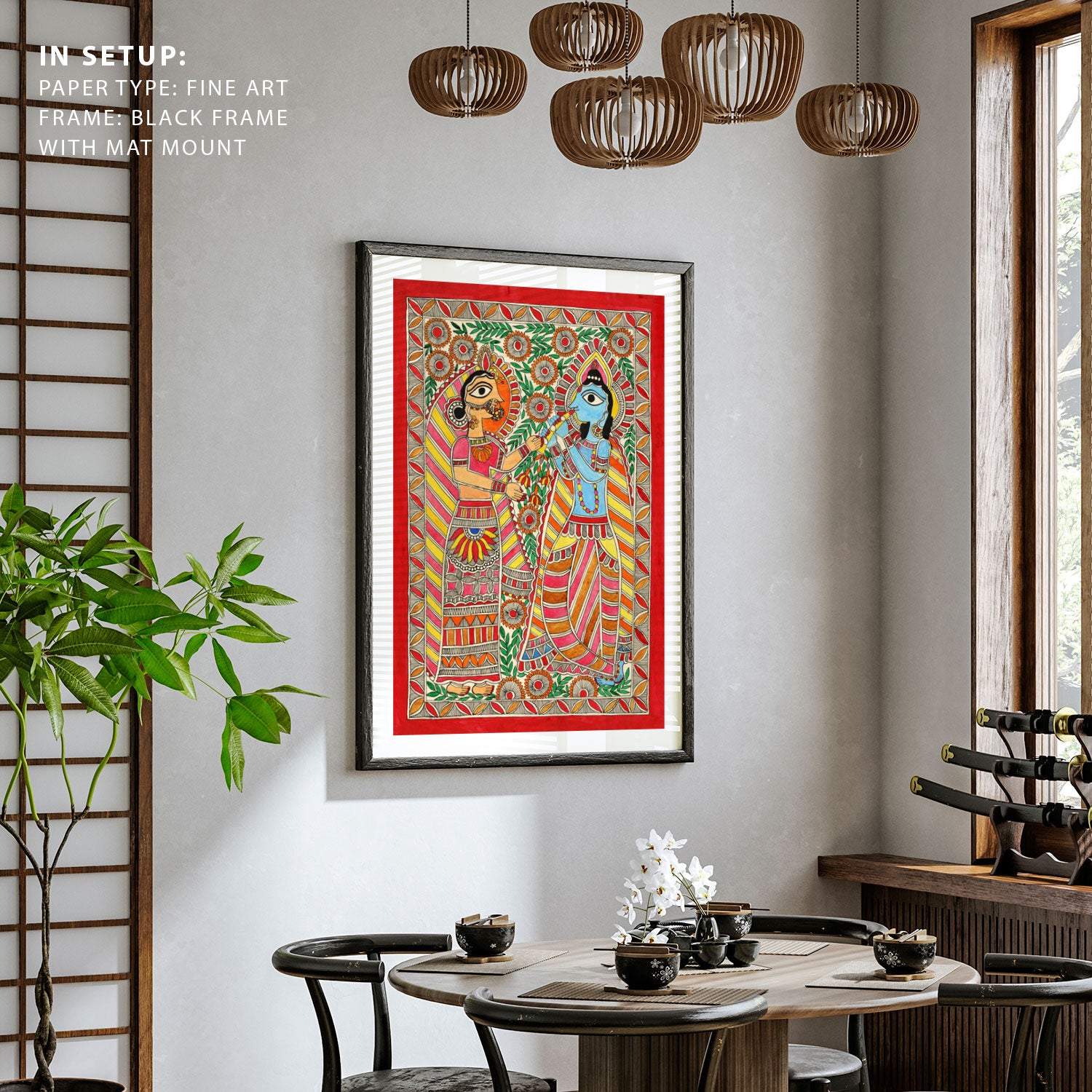 Radha Krishna Mithila Madhubani Art from the Madhubani Paintings Collection is produced on Premium Museum Grade Canvas and Hahnemuhle Fine Art Media. This beautiful Madhubani Painting Art Print product is made with a matte finish and premium quality with vibrant colors. These Madhubani Miniature Paintings Art Prints are produced with the most extreme shading precision and using the most advanced giclee printing technique in the world. We use the same standard that the various museums and art galleries use across the globe to recreate the Madhubani Miniature Paintings Art Prints. These Madhubani Paintings are perfect for you if you're a Madhubani or Indian Culture Lover or if you want to add a Traditional Look to your space. The vibrancy of colors and the unique detailing of every Madhubani Painting Art Print makes them the best in so many ways. This Madhubani Art Print will add charm to any room in your home. These Madhubani Painting Art Prints can be the perfect gift to your friends, colleagues, or family as they sync in very well in your Bedroom, living room, lobby, Balcony, Bathroom, etc.