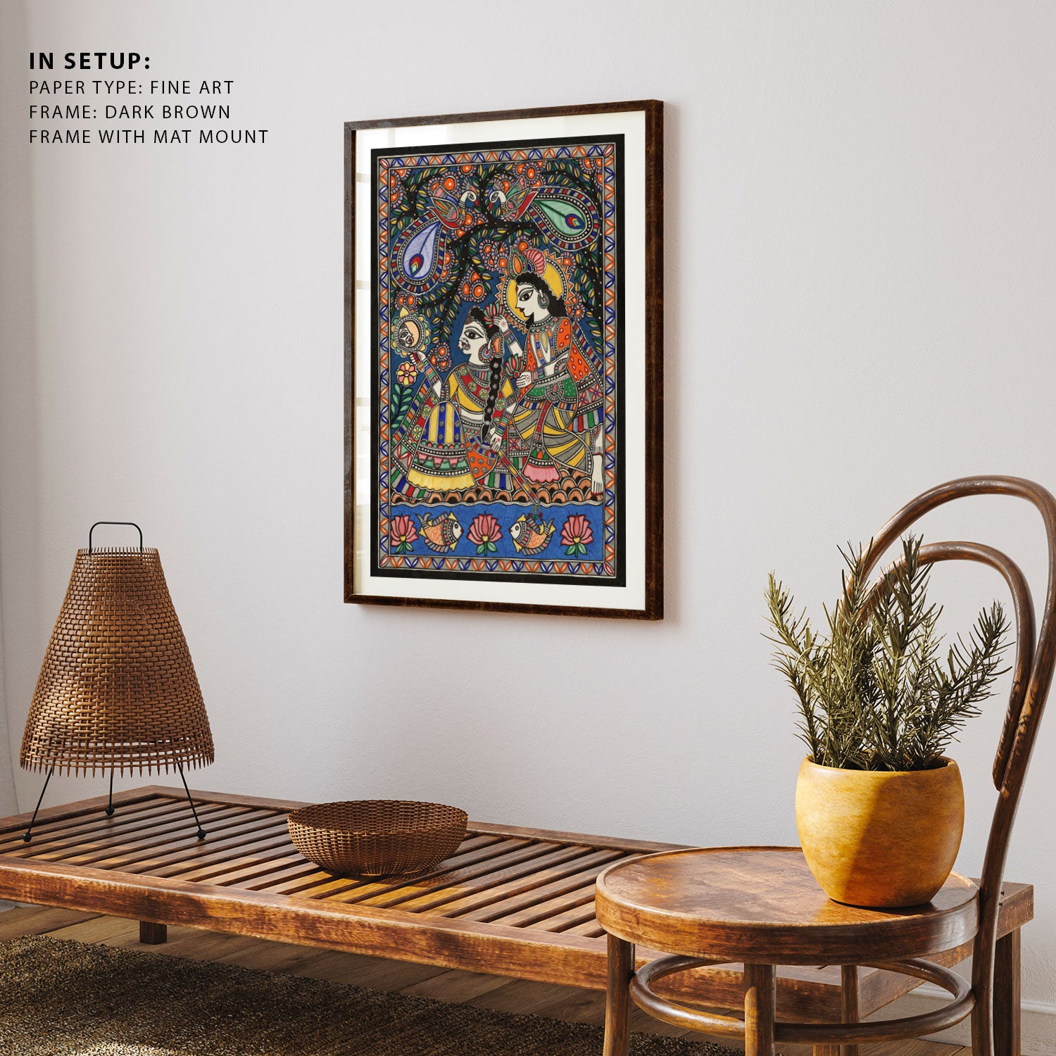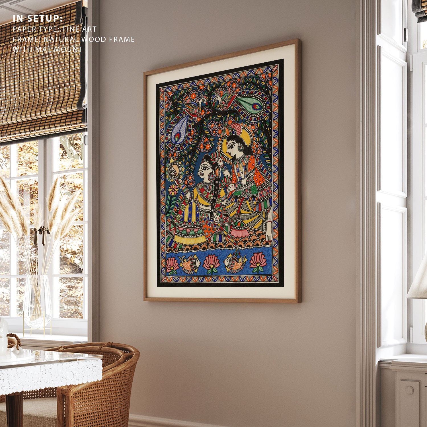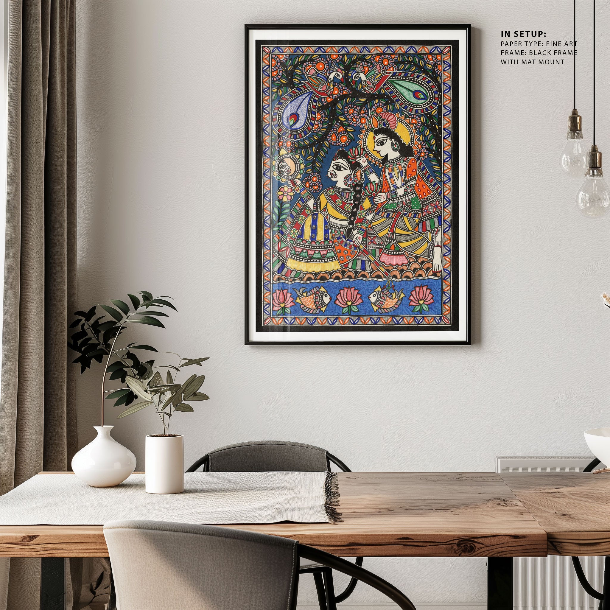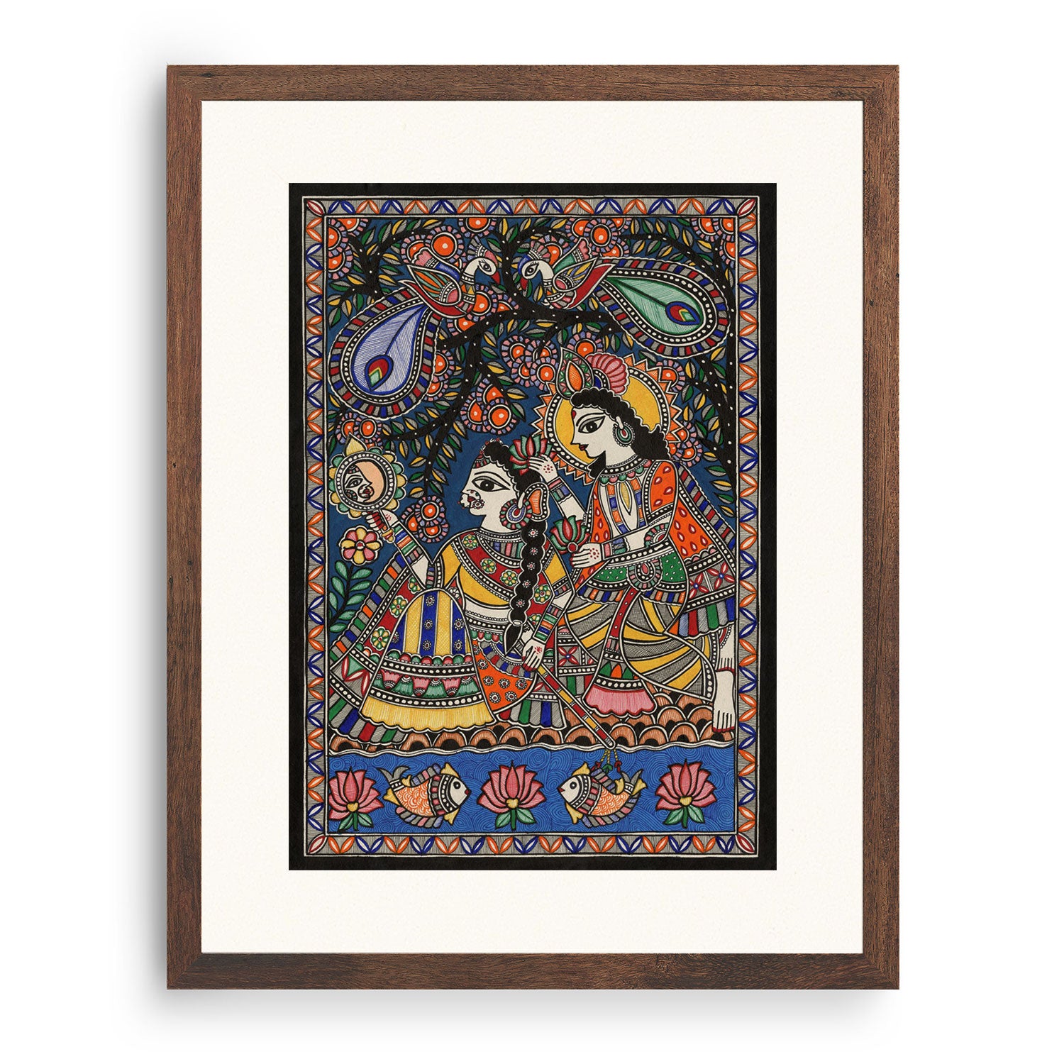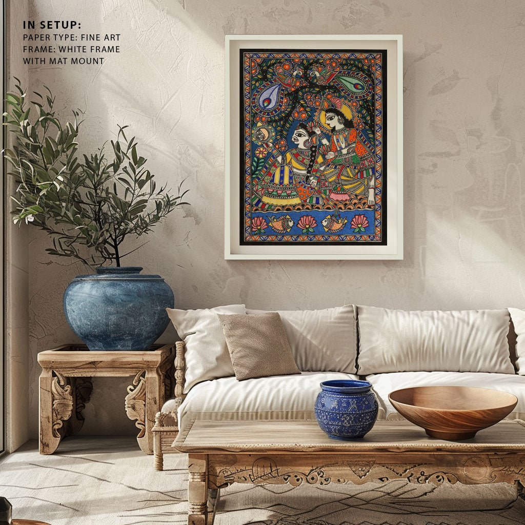 Radha Krishna’s Bond in Madhubani Art from the Madhubani Paintings Collection is produced on Premium Museum Grade Canvas and Hahnemuhle Fine Art Media. This beautiful Madhubani Painting Art Print product is made with a matte finish and premium quality with vibrant colors. These Madhubani Miniature Paintings Art Prints are produced with the most extreme shading precision and using the most advanced giclee printing technique in the world. We use the same standard that the various museums and art galleries use across the globe to recreate the Madhubani Miniature Paintings Art Prints. These Madhubani Paintings are perfect for you if you're a Madhubani or Indian Culture Lover or if you want to add a Traditional Look to your space. The vibrancy of colors and the unique detailing of every Madhubani Painting Art Print makes them the best in so many ways. This Madhubani Art Print will add charm to any room in your home. These Madhubani Painting Art Prints can be the perfect gift to your friends, colleagues, or family as they sync in very well in your Bedroom, living room, lobby, Balcony, Bathroom, etc.