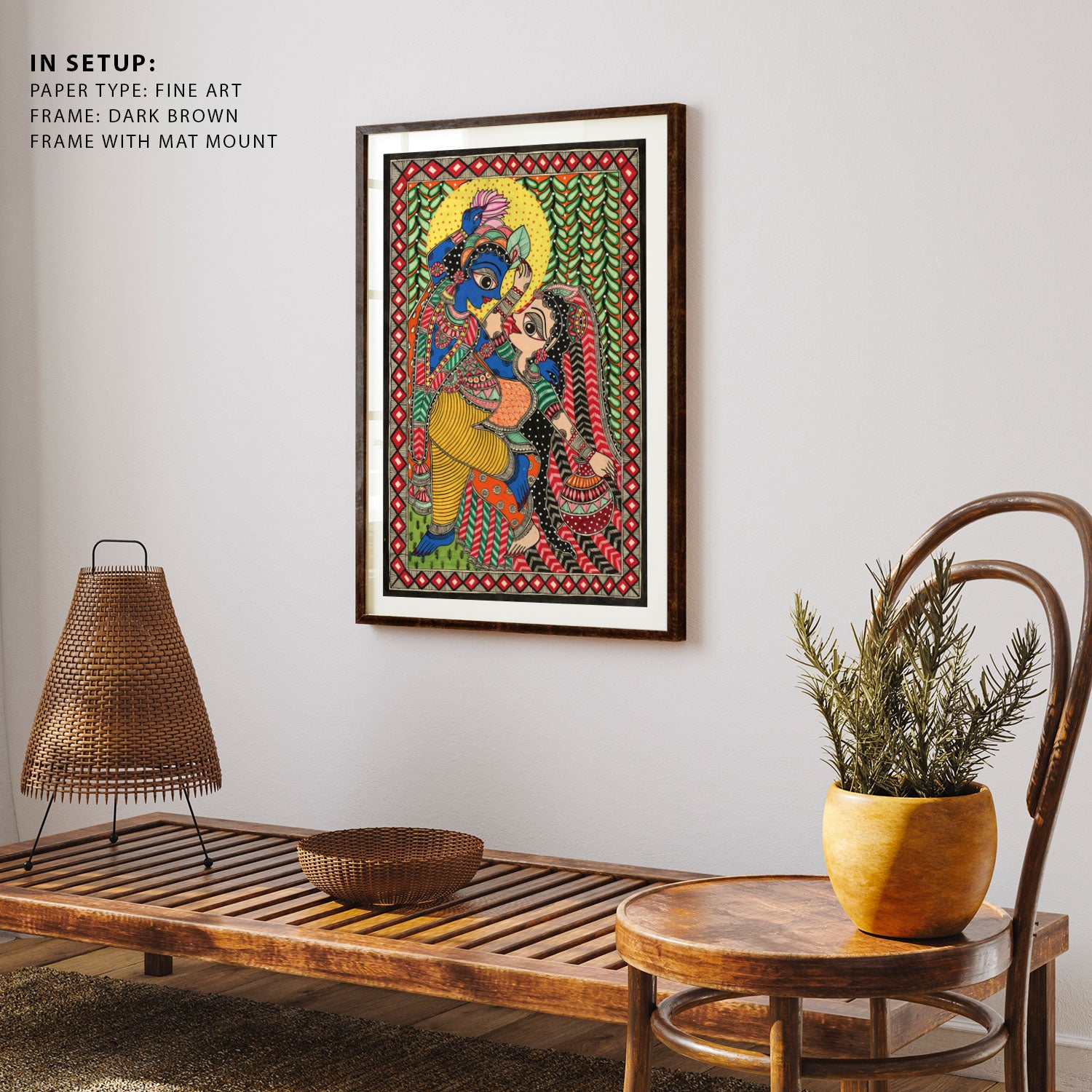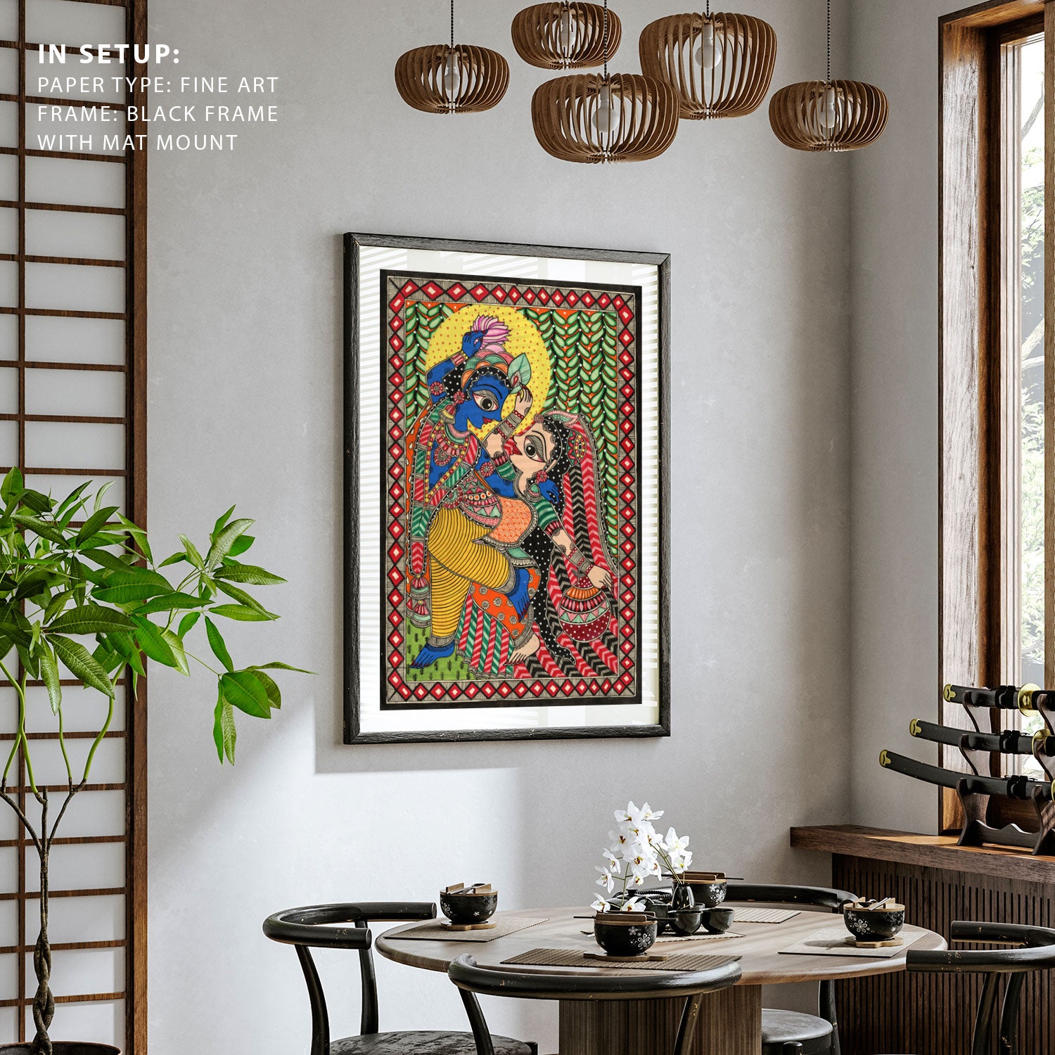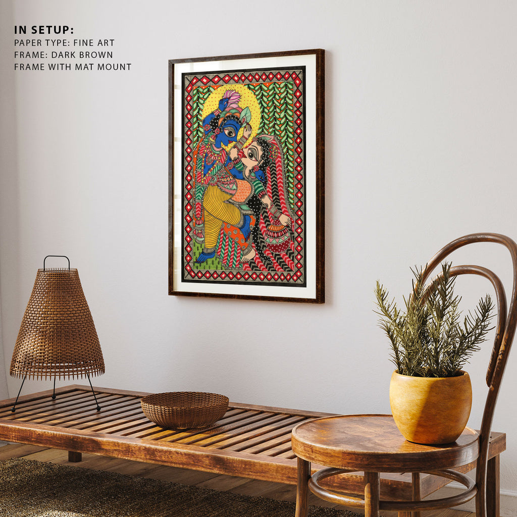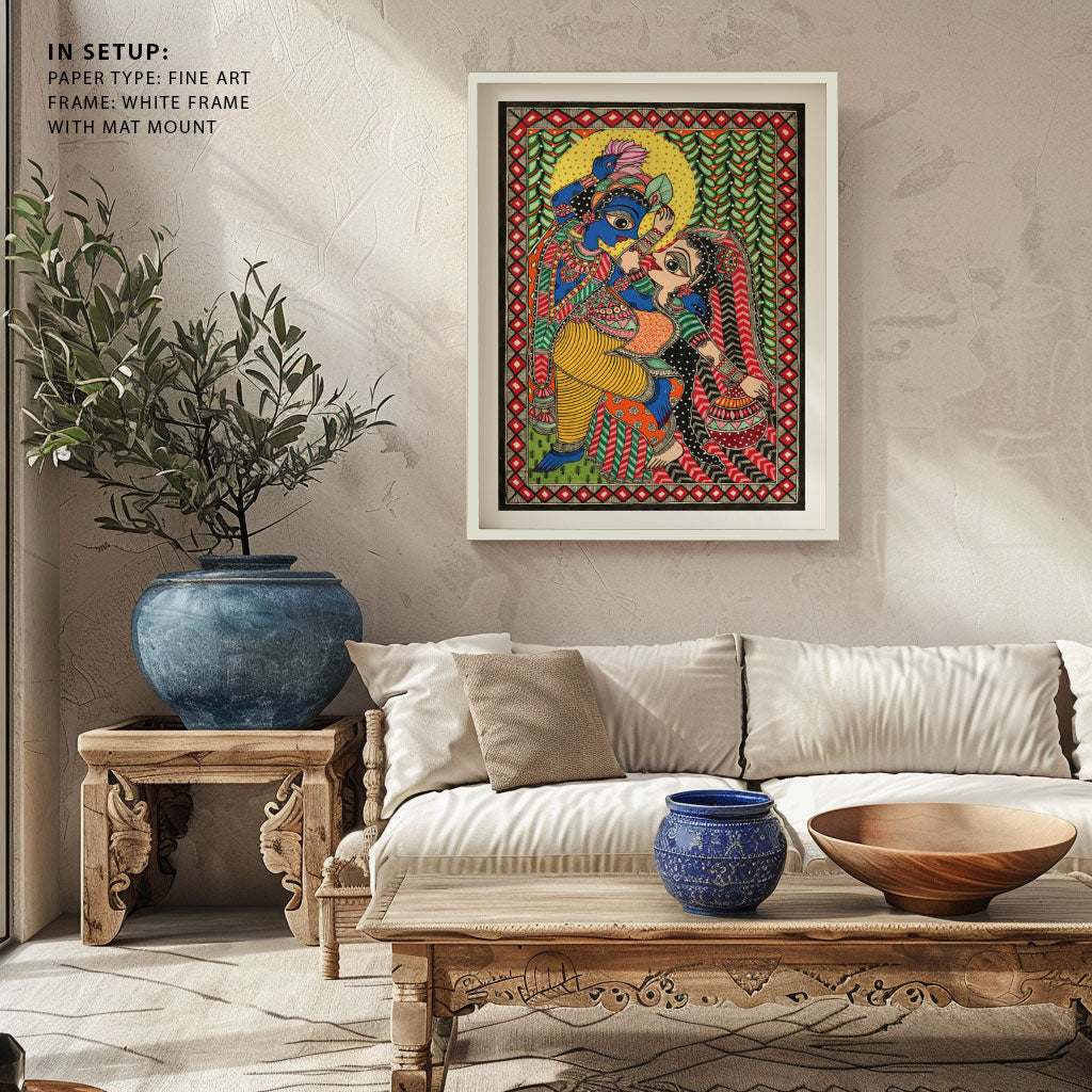 Radha-Krishna’s Eternal Beat Madhubani Art from the Madhubani Paintings Collection is produced on Premium Museum Grade Canvas and Hahnemuhle Fine Art Media. This beautiful Madhubani Painting Art Print product is made with a matte finish and premium quality with vibrant colors. These Madhubani Miniature Paintings Art Prints are produced with the most extreme shading precision and using the most advanced giclee printing technique in the world. We use the same standard that the various museums and art galleries use across the globe to recreate the Madhubani Miniature Paintings Art Prints. These Madhubani Paintings are perfect for you if you're a Madhubani or Indian Culture Lover or if you want to add a Traditional Look to your space. The vibrancy of colors and the unique detailing of every Madhubani Painting Art Print makes them the best in so many ways. This Madhubani Art Print will add charm to any room in your home. These Madhubani Painting Art Prints can be the perfect gift to your friends, colleagues, or family as they sync in very well in your Bedroom, living room, lobby, Balcony, Bathroom, etc.