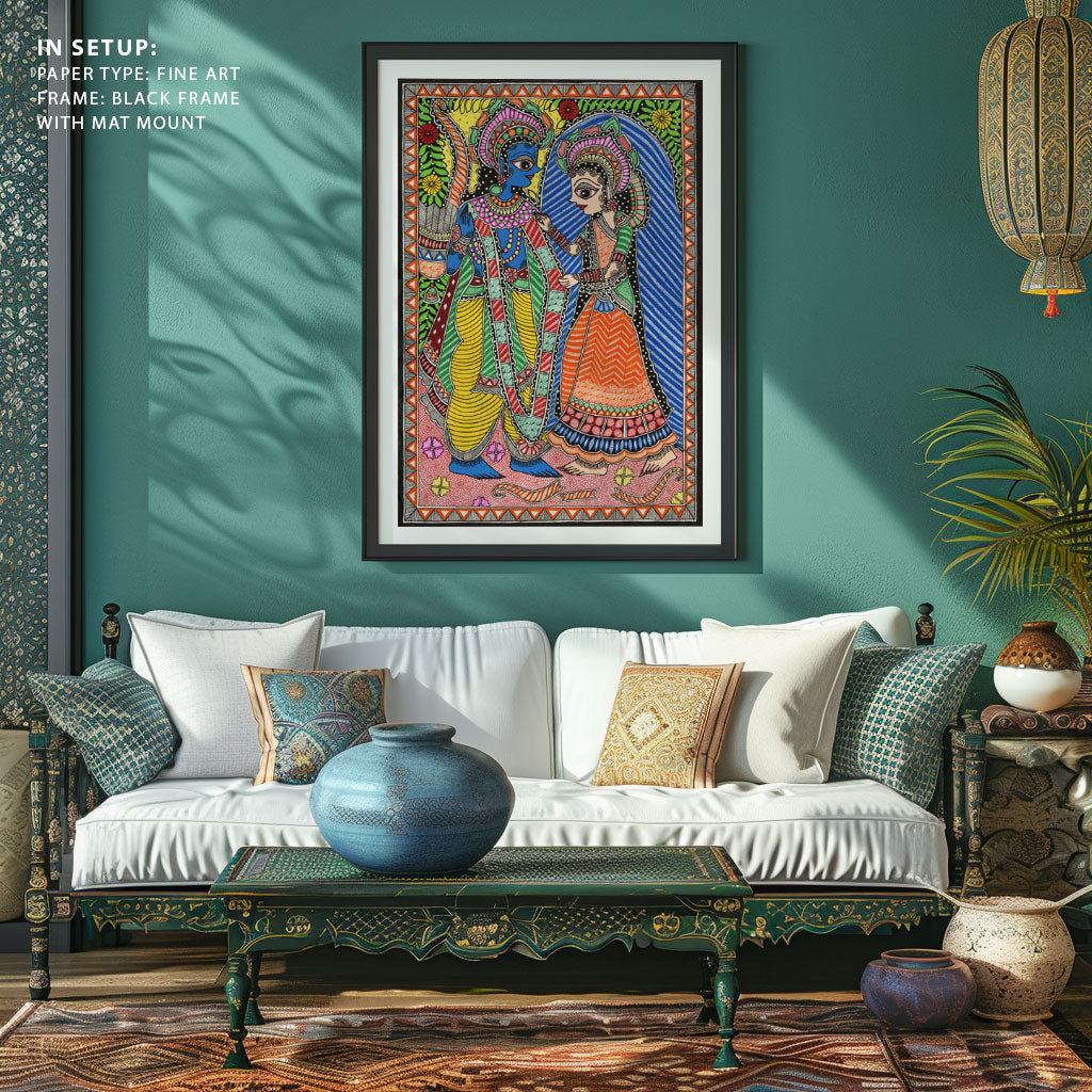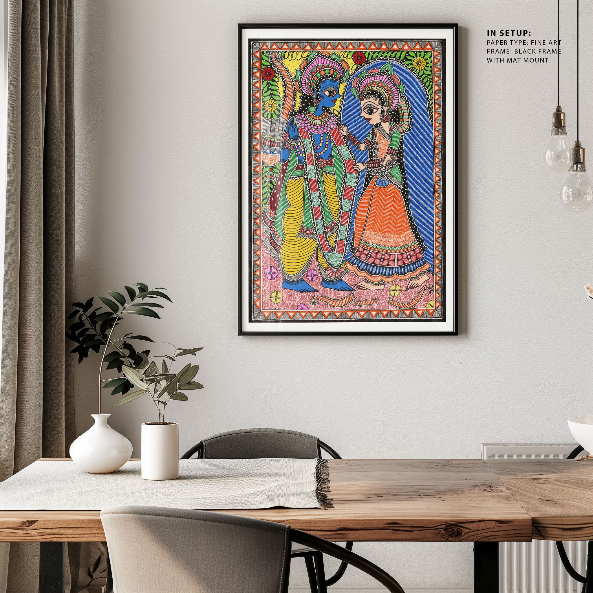 Radha Krishna Traditional Mithila Painting Madhubani Art from the Madhubani Paintings Collection is produced on Premium Museum Grade Canvas and Hahnemuhle Fine Art Media. This beautiful Madhubani Painting Art Print product is made with a matte finish and premium quality with vibrant colors. These Madhubani Miniature Paintings Art Prints are produced with the most extreme shading precision and using the most advanced giclee printing technique in the world. We use the same standard that the various museums and art galleries use across the globe to recreate the Madhubani Miniature Paintings Art Prints. These Madhubani Paintings are perfect for you if you're a Madhubani or Indian Culture Lover or if you want to add a Traditional Look to your space. The vibrancy of colors and the unique detailing of every Madhubani Painting Art Print makes them the best in so many ways. This Madhubani Art Print will add charm to any room in your home. These Madhubani Painting Art Prints can be the perfect gift to your friends, colleagues, or family as they sync in very well in your Bedroom, living room, lobby, Balcony, Bathroom, etc.